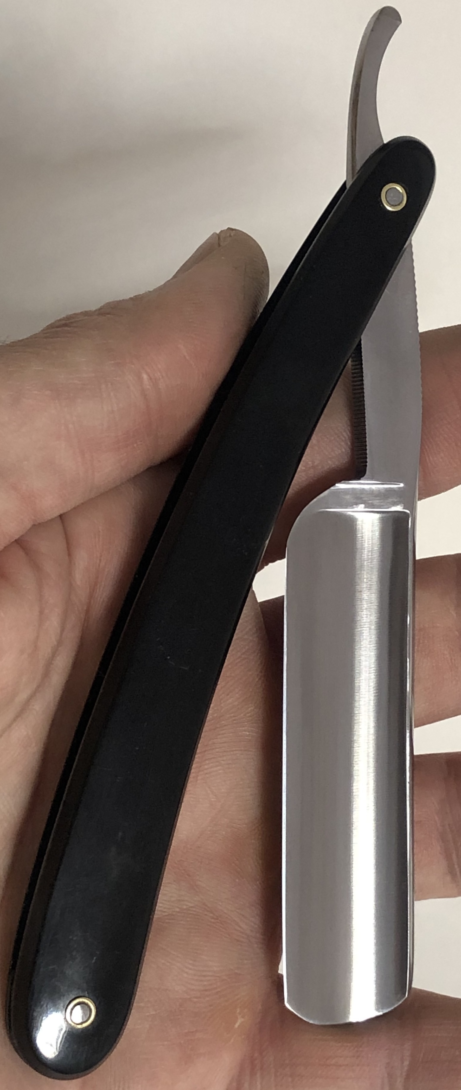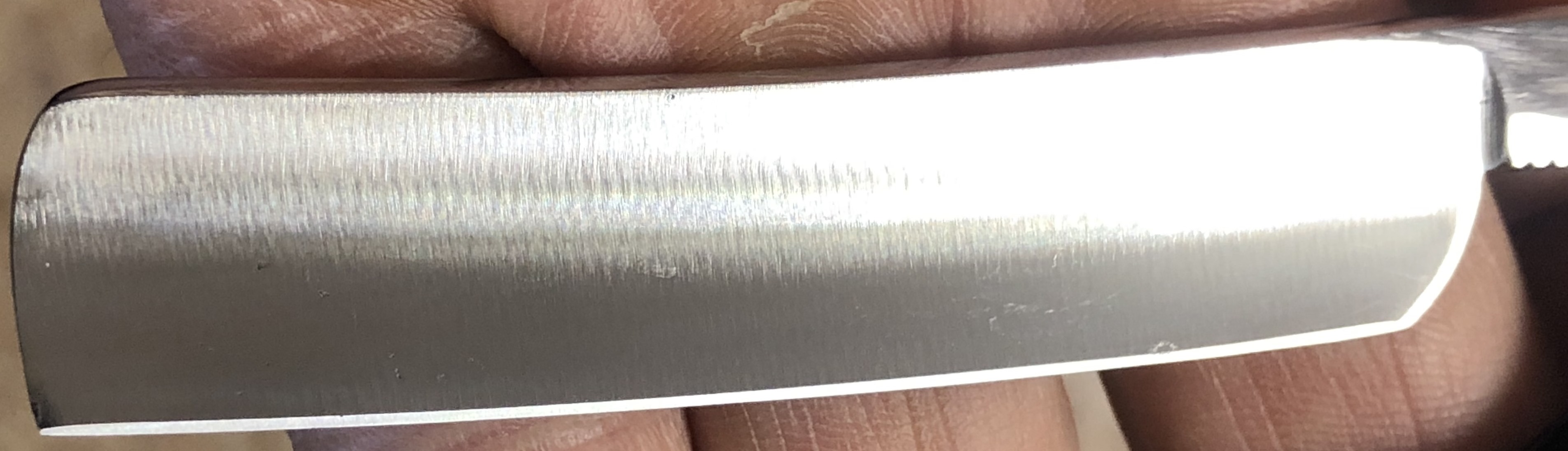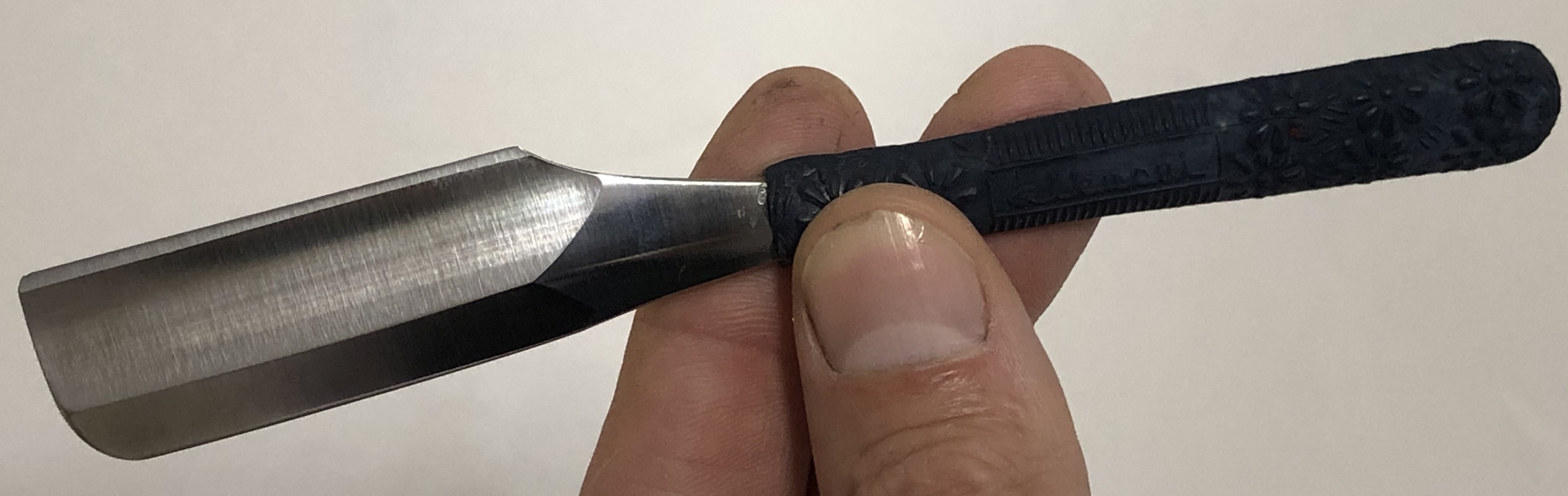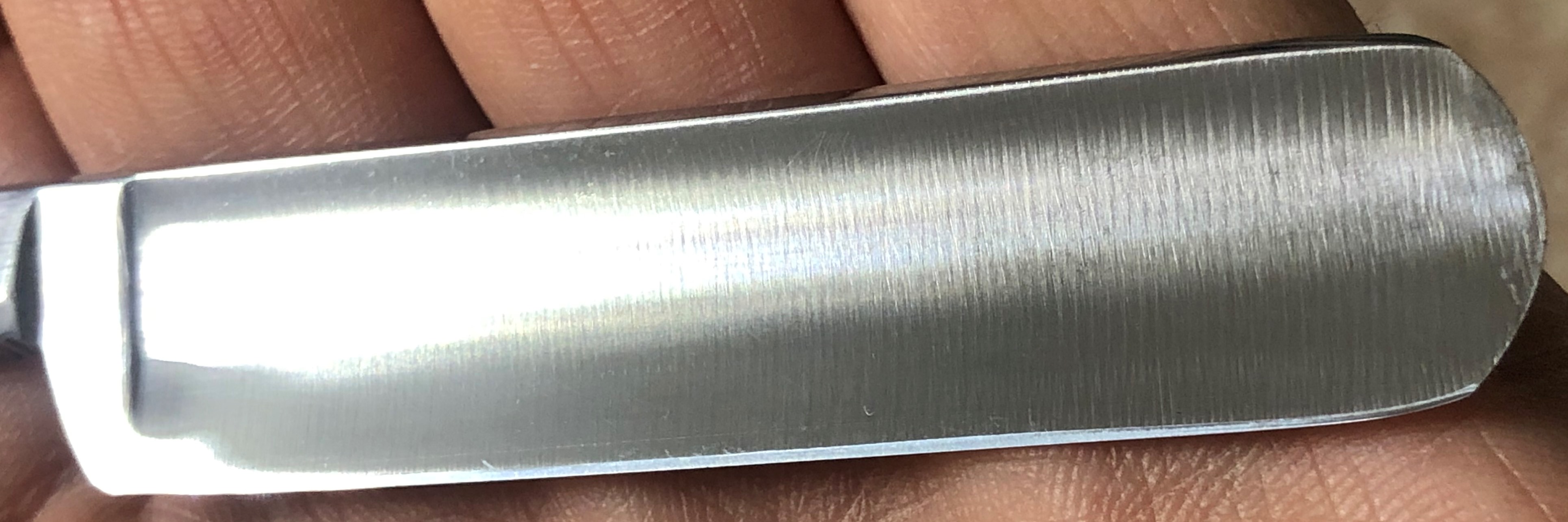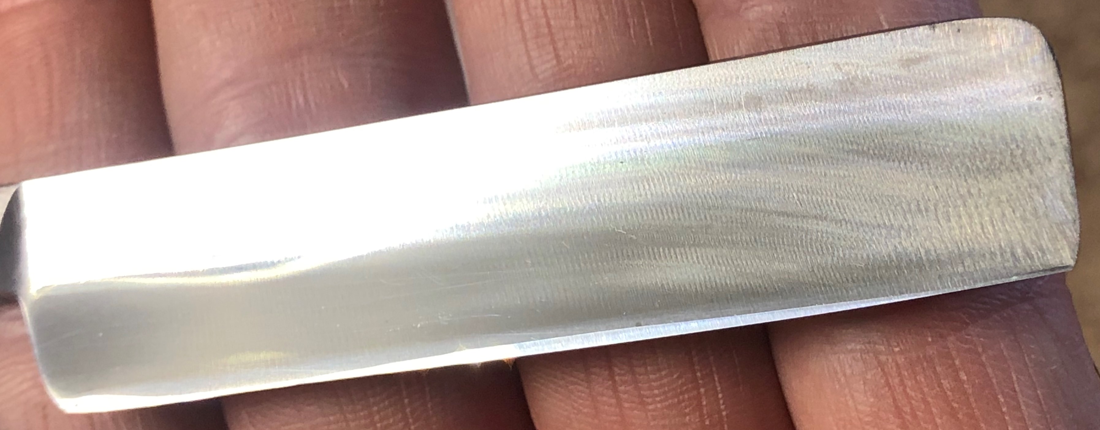 Бритва находится в состоянии приближённому к идеальному.Без следов пользования.Разобрал, немного освежил полотно на самых тонких абразивах и заново собрал. Очень красивая, эффектная оправа будет в самый раз такой бритве.Сталь чистая, без видимых дефектов.