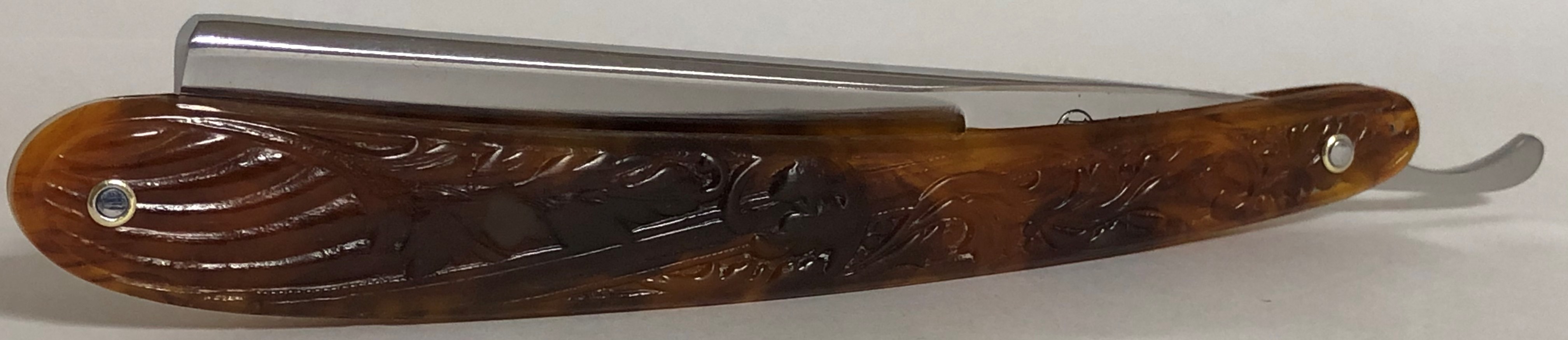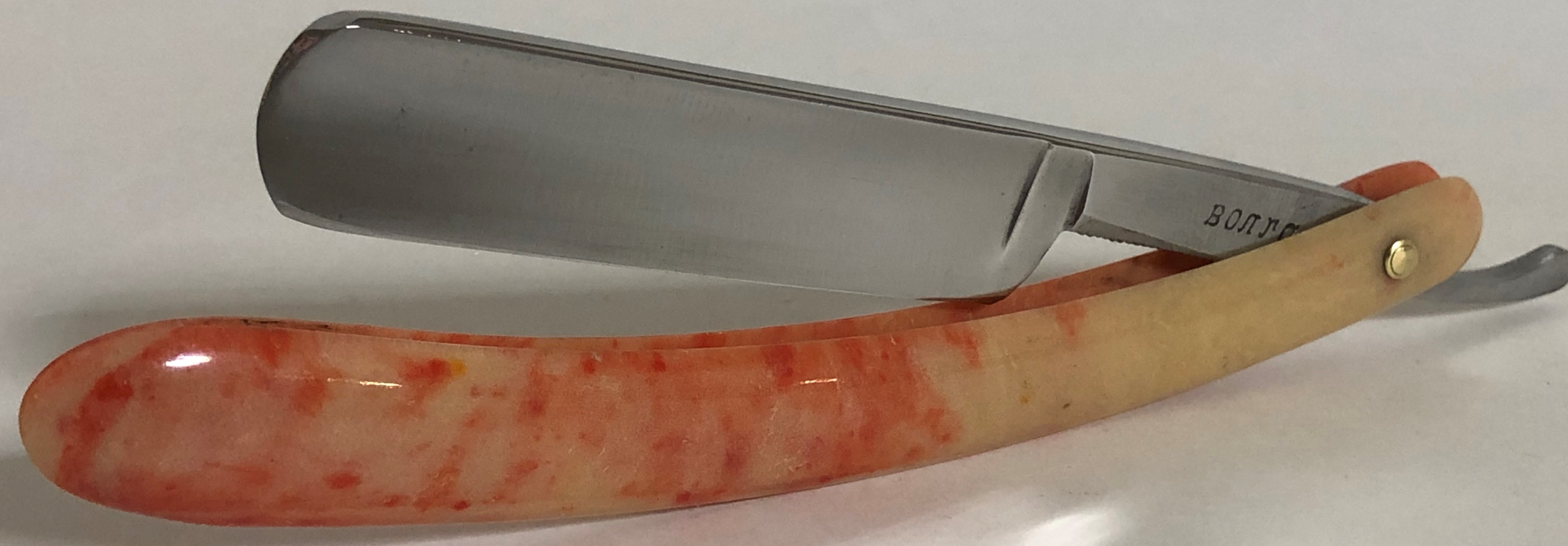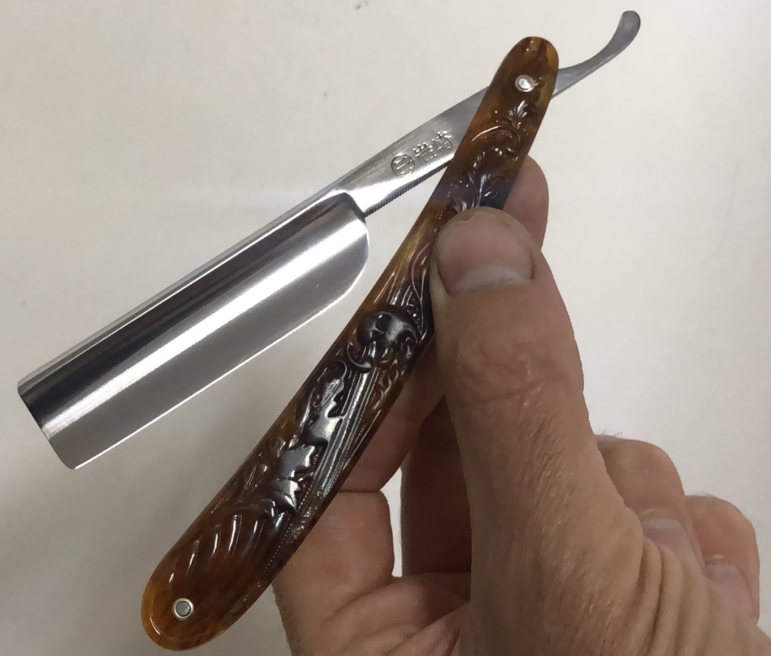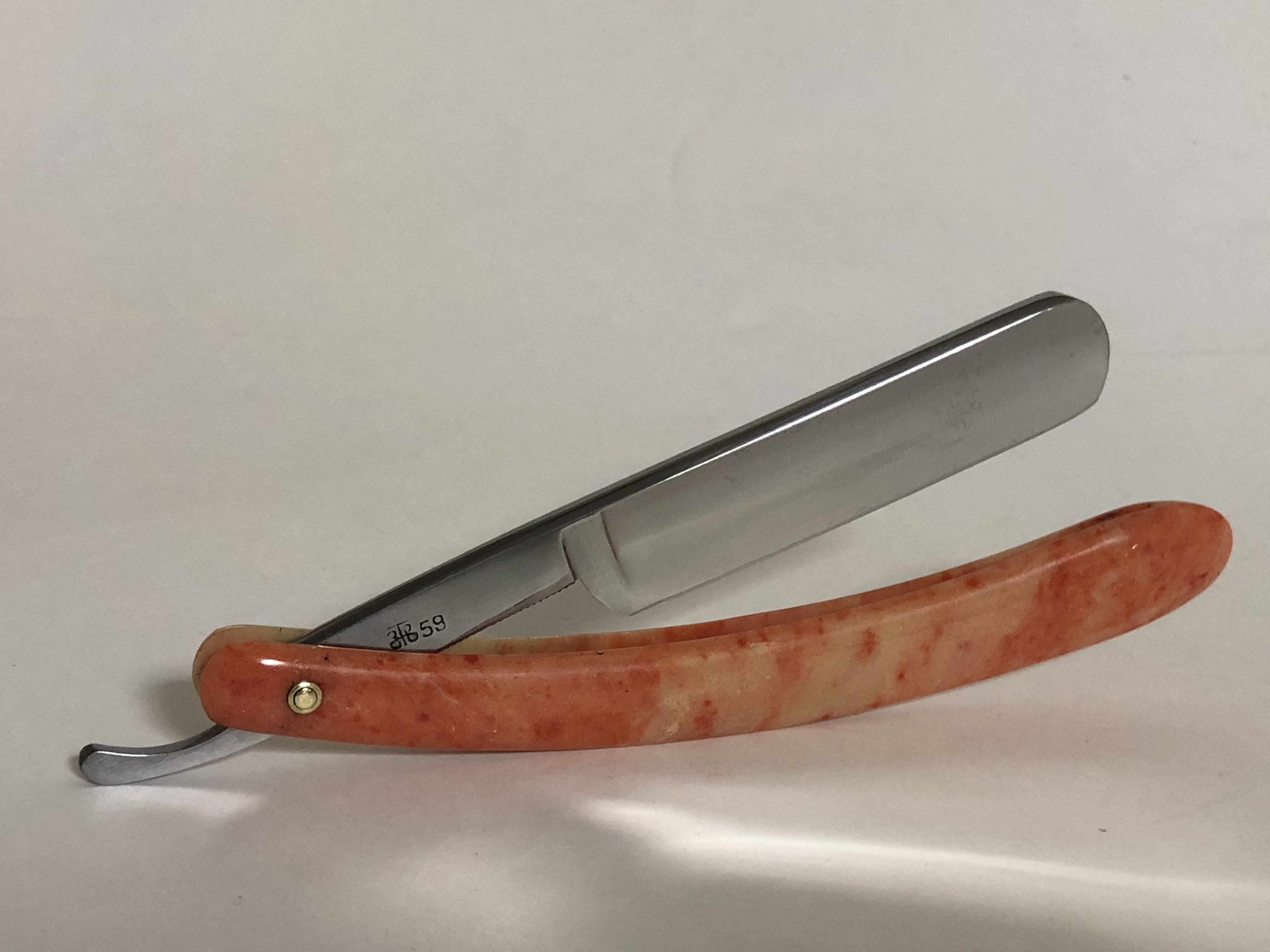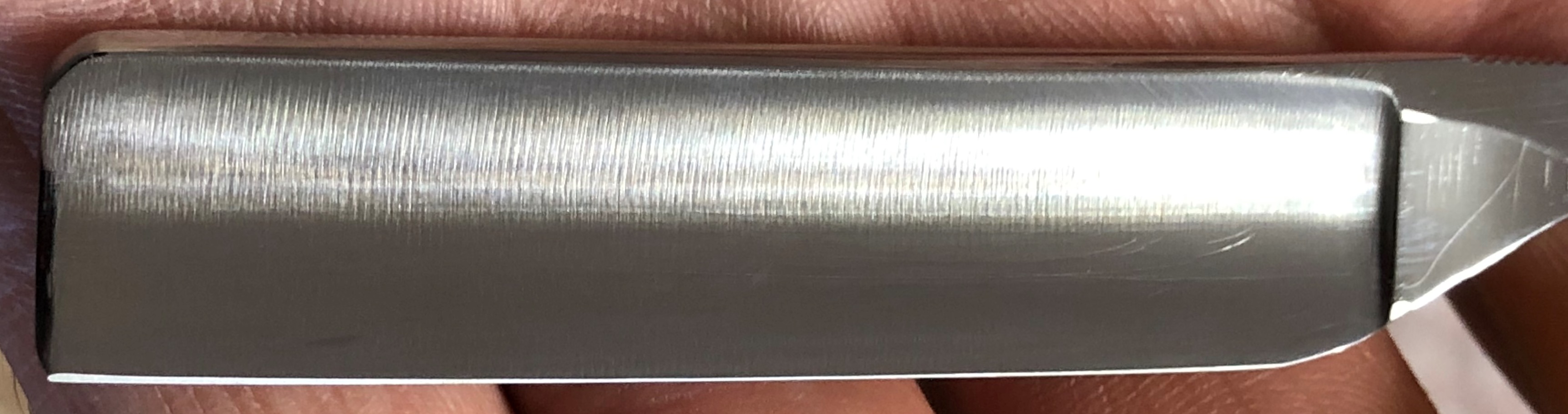 Бритва находится в состоянии приближённому к идеальному.Без следов пользования.Разобрал, немного освежил полотно на самых тонких абразивах и заново собрал. Очень красивая, эффектная оправа будет в самый раз такой бритве.Сталь чистая, без видимых дефектов.
