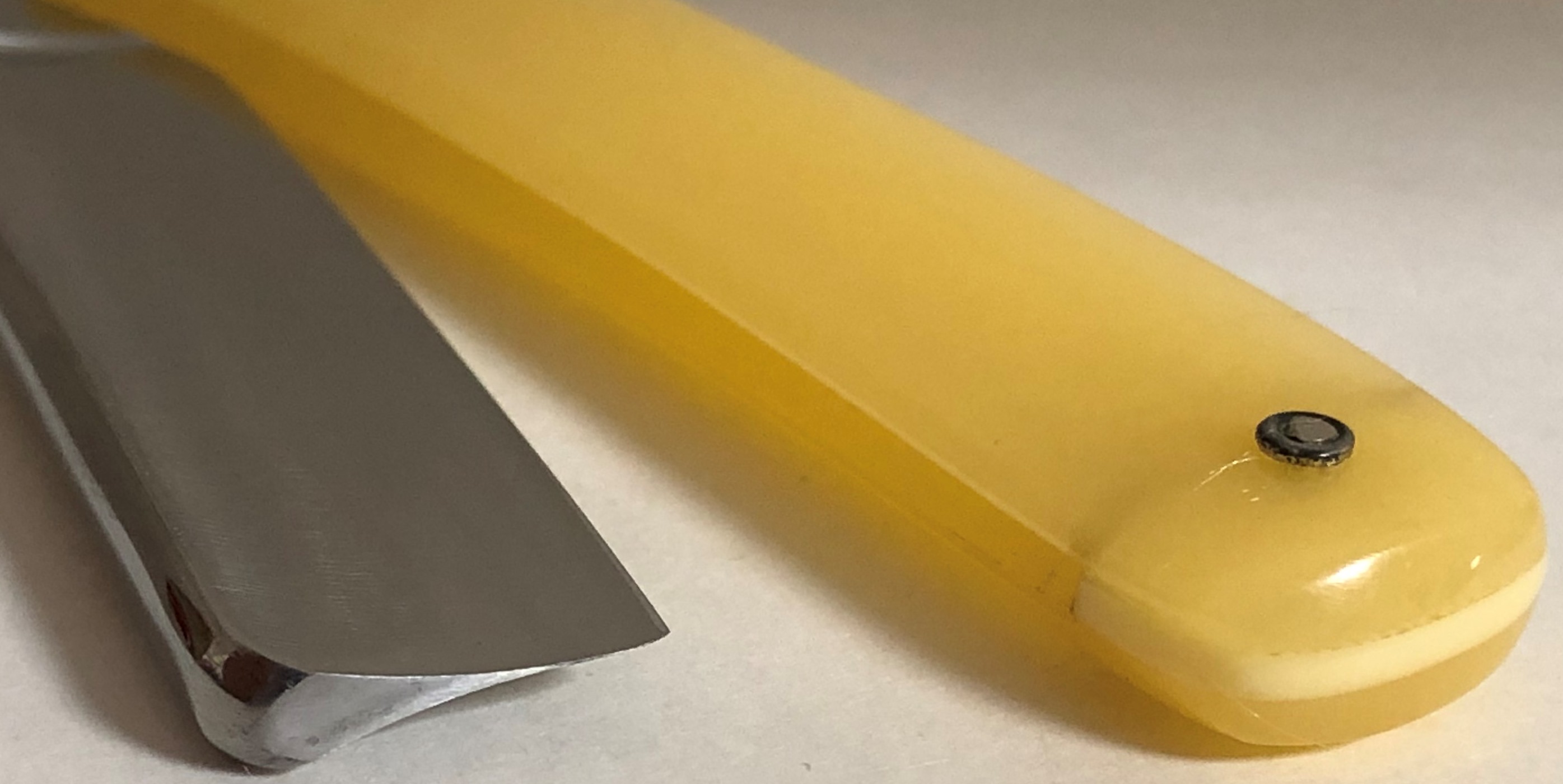 Бритва не имела следов пользования, но нуждалась в чистке следов коррозии у осевого пина, а также небольшой очаг был у цифры 10072 и немного переходил в район пятки, под обушком.По мере возможности все лишнее убрал.(Что то осталось, но уже не принципиально).В остальном состояние клинка в идеале.Кромочка равномерна по всей длине.Оригинальная оправа в очень хорошем состоянии:крупная, тяжёлая и без деформации.Пины поменял на двух-цветные немецкие втулки, с добавлением внутренних шайб.Бритва представляет собой идеальный и достаточно недорогой вариант для новичка, по многим параметрам. Заточена и готова к бритью.