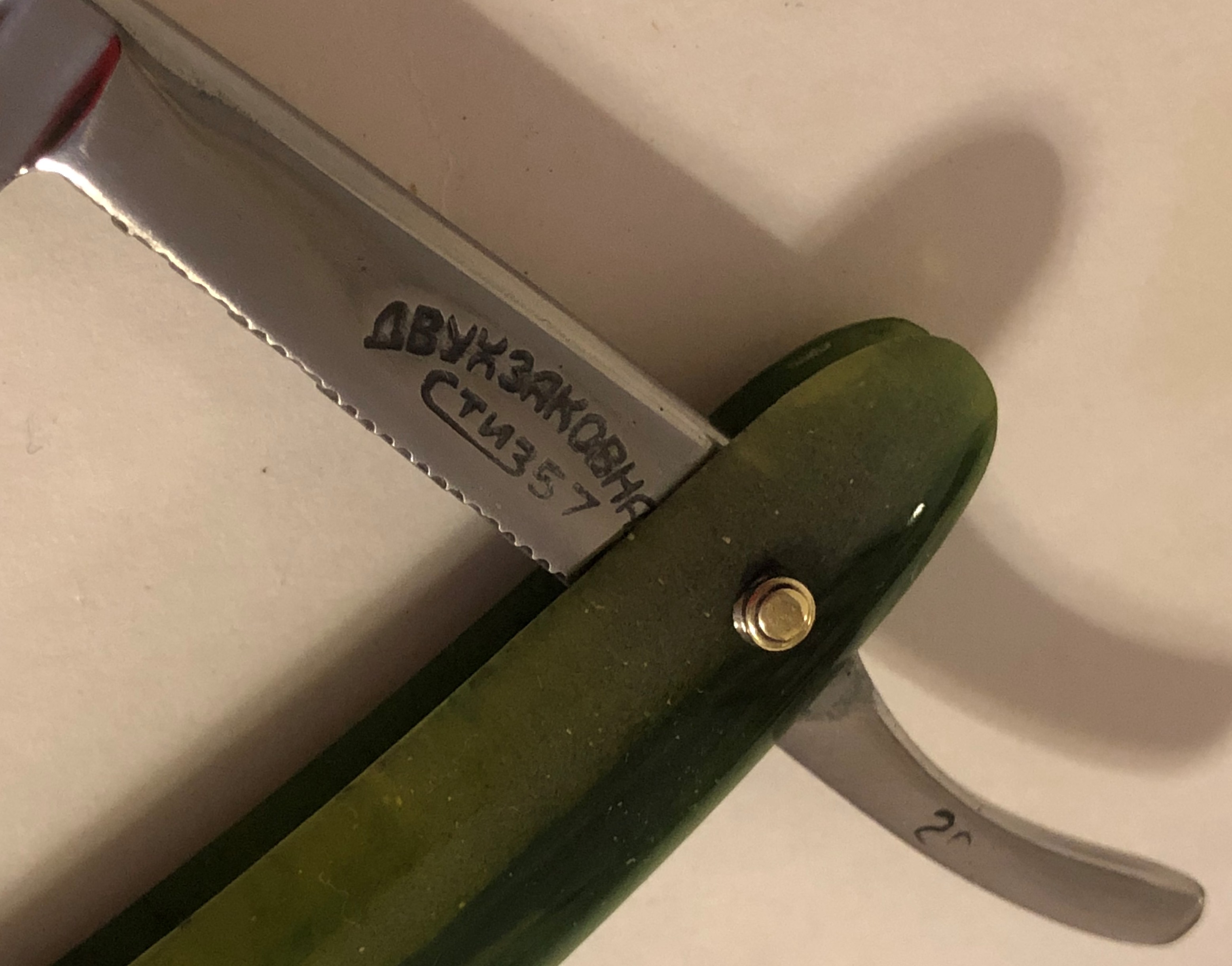 Клинок в непользованном состоянии.Бритва была разобрана и немного освежено полотно от патины и окисления в районе осевого пина. Сам пин был сохранен и заново установлен.Попытался восстановить "родной" гринд полотна и умеренно отполировал.Идеальная геометрия клинка.Кромочка аккуратная и равномерна по всей длине. Сама сталь по качеству идентична сталям от бритв 40-60-х годов. Те кто в теме, тот понимает разницу между бритвами ранних выпусков и бритвами 70-х годов.На вид бритва как новая. Будет заточена и подготовлена к бритью.Очень неплохой и бюджетный вариант для новичка.