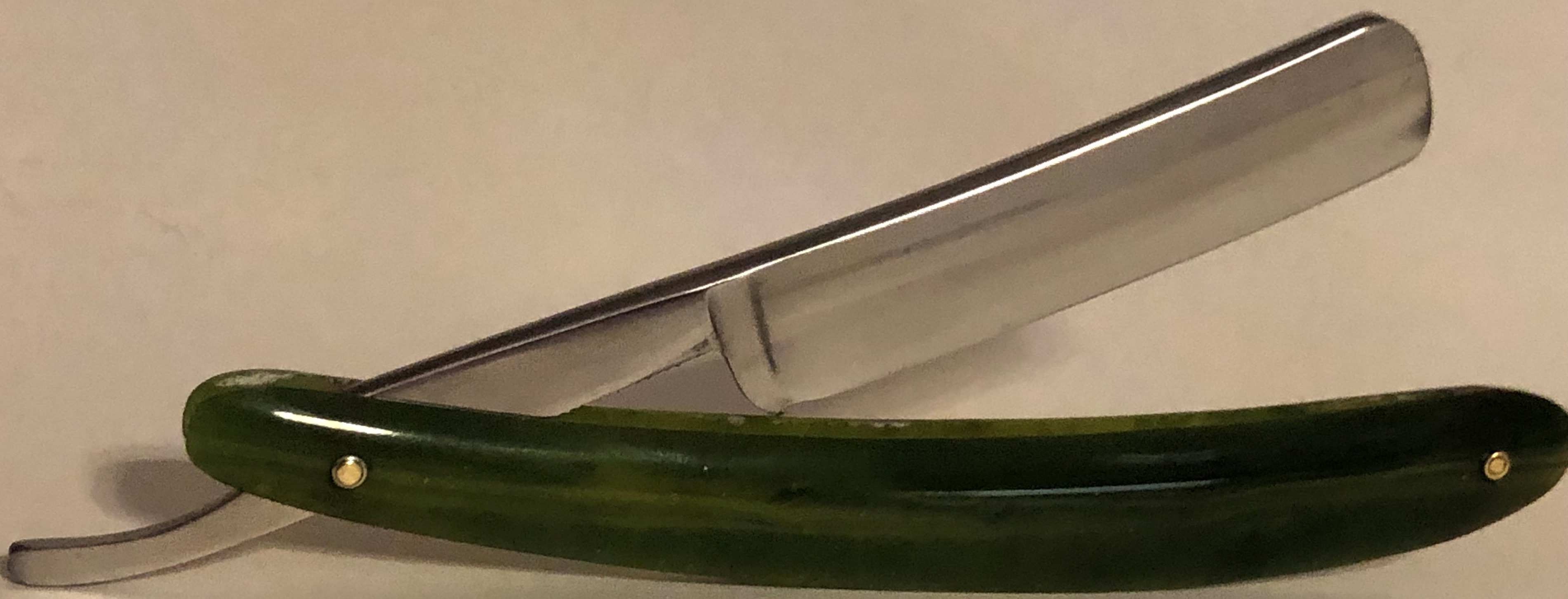 Бритва находится в очень хорошем состоянии,без активный следов пользования.Разобрал, немного почистил и умеренно отполировал.Оригинальный осевой пин удалось сохранить и поставить заново.Чистая сталь, кромочка тоненькая и равномерна по всей длине.Яркая изумрудная оправа.Коробочка родная, также 1957 года.Заточена и готова к бритью.