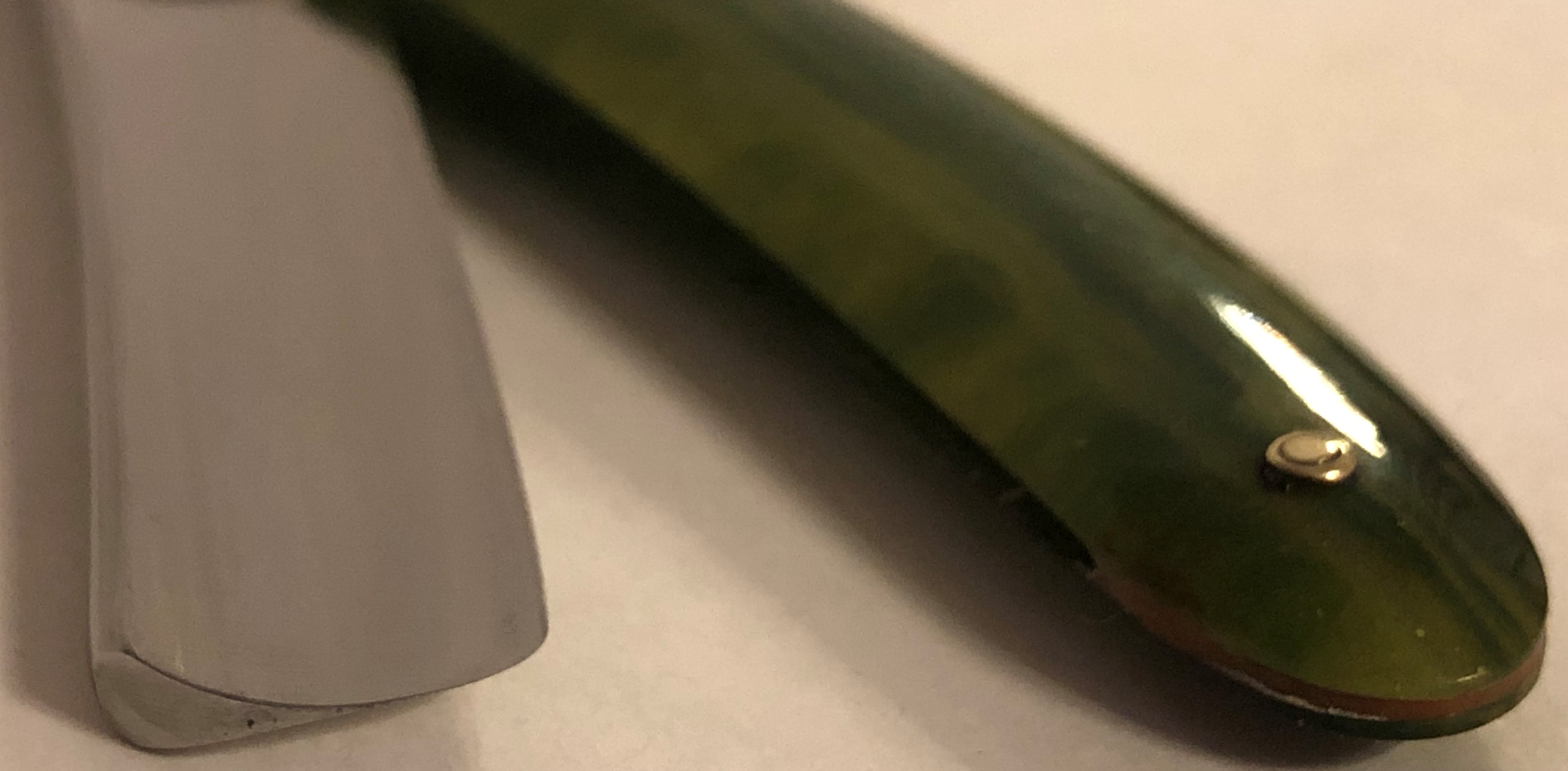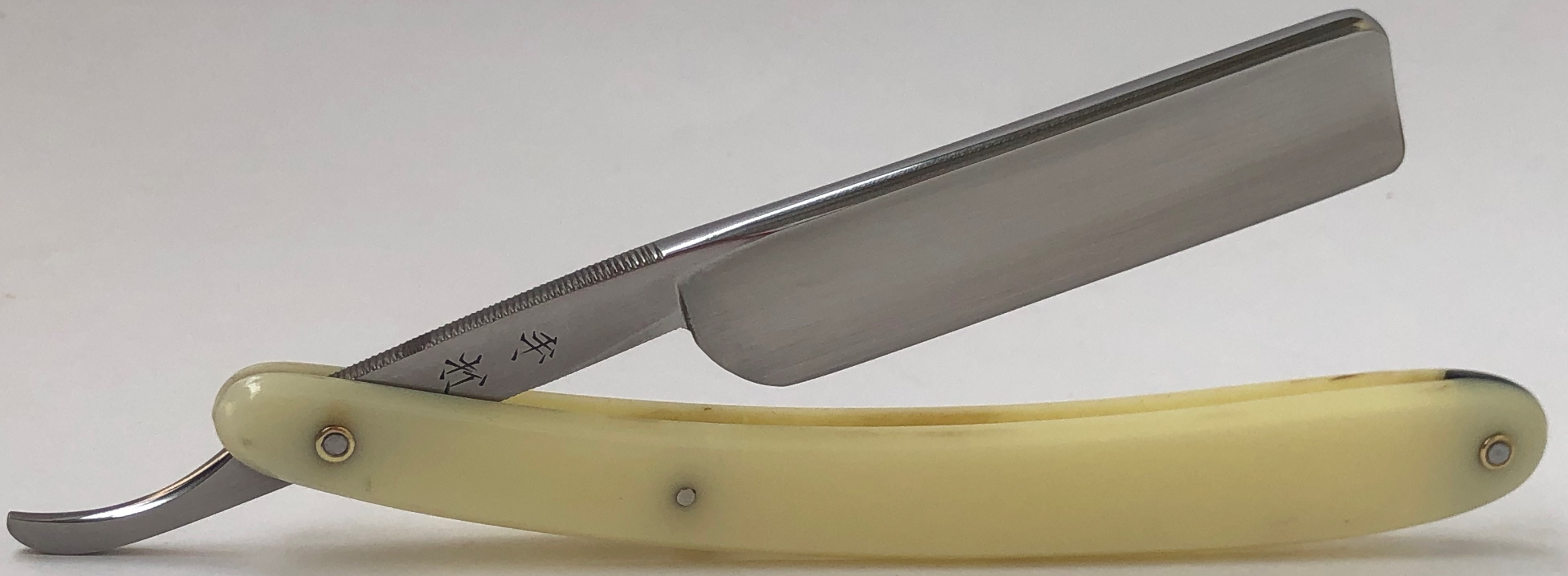 Бритва в прекрасном состоянии для своих лет,без следов пользования.Была разобрана, очищен район осевого пина от многолетней патины и окисления, немного освежено полотно и снова собрана, с сохранением оригинальных пинов.Сталь чистая от разного рода видимых дефектов.Идеальная геометрия клинка:кромочка равномерна по всей длине.Заточена и готова к бритью.Не пропустите неординарную и красивую бритву для своей коллекции!