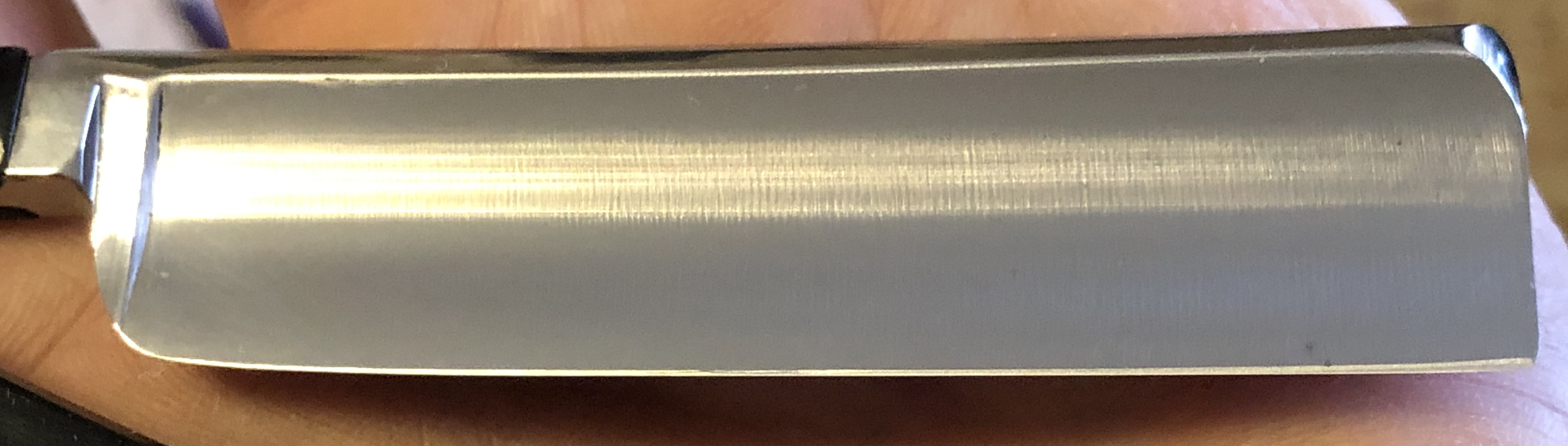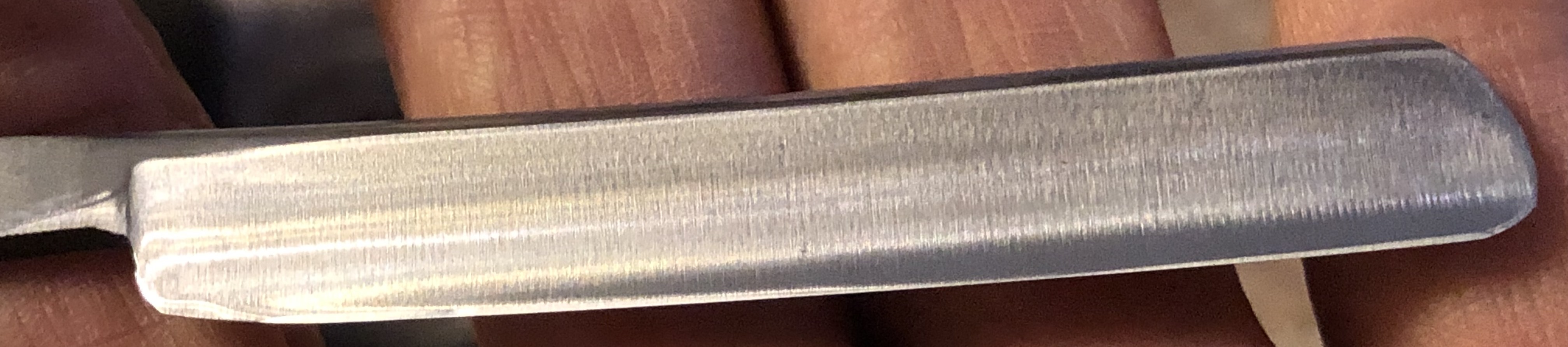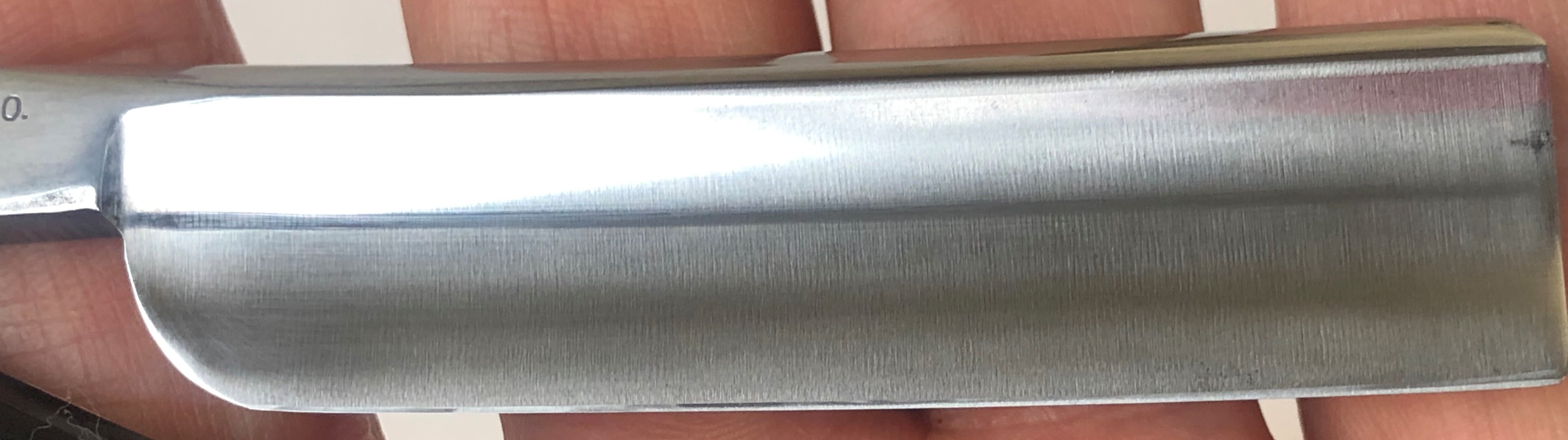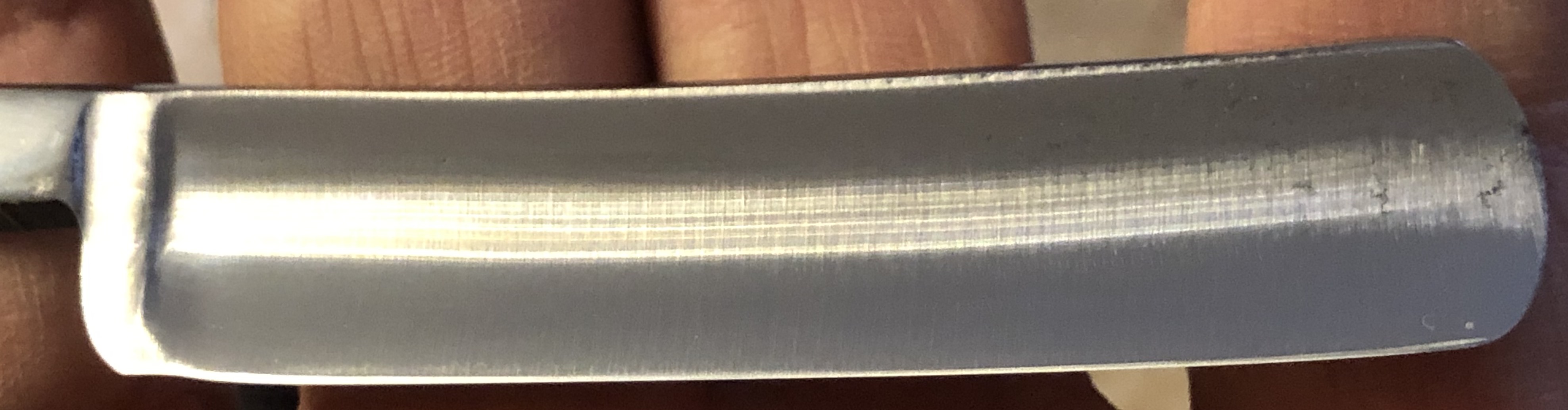 Бритва без следов пользования.Решил вдохнуть в клинок немного души и ручного творчества.Поперечную заводскую шлифовку переделал в ручной продольный сатин.Лицевая сторона полотна отшлифована до 10000 грит и отполирована, а обратная сторона клинка отшлифована до 400 грит. Грубый гринд примерно как на японских фреймах. Предварительно бритва была разобрана, почищен район осевого пина и снова собрана, с сохранением оригинальных пинов.Сталь чистая от разного рода видимых дефектов. Идеальная геометрия.Кромочка равномерна по всей длине и еле заметна.В общем и целом очень красивая эффектная бритва.Заточена и готова к бритью.