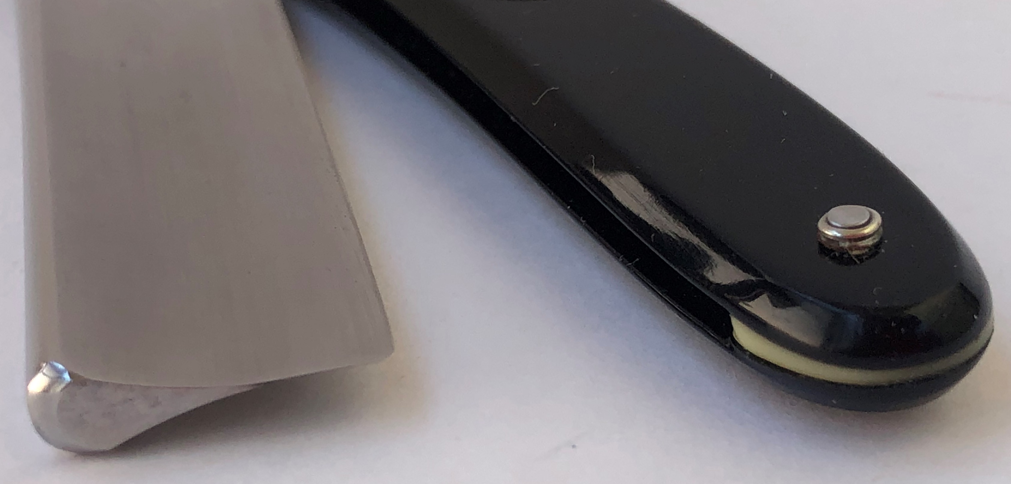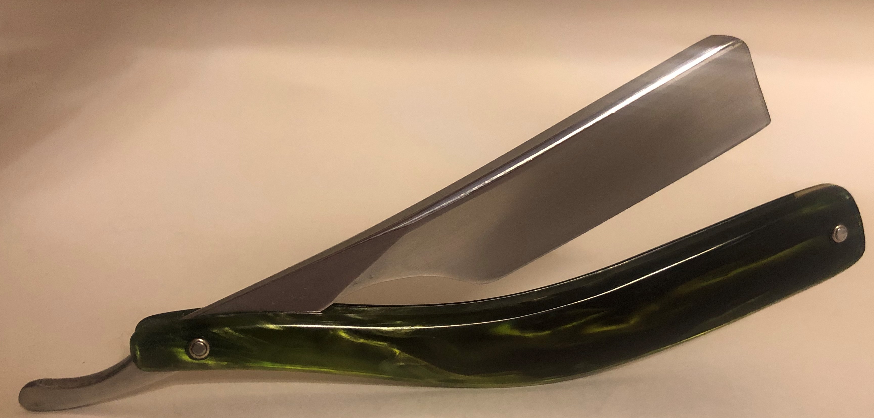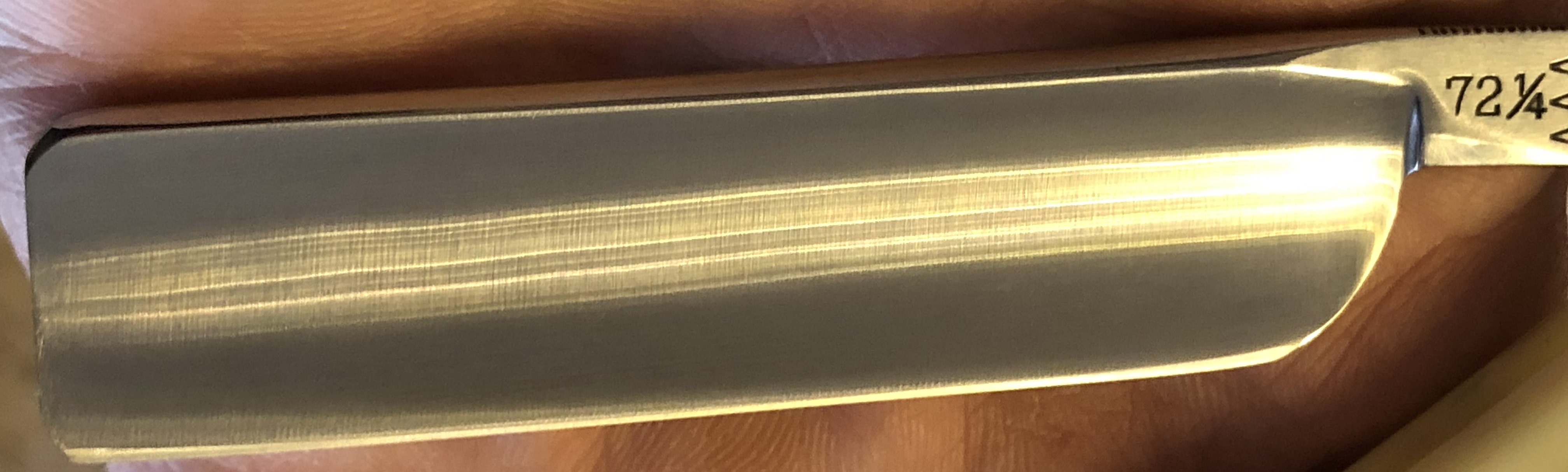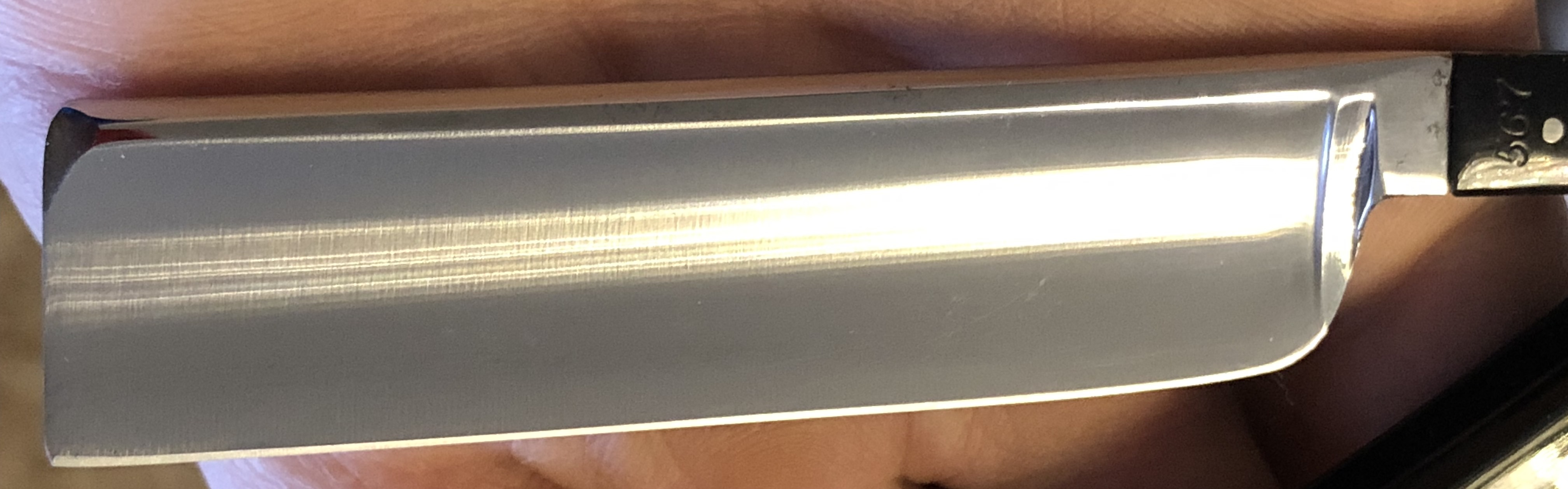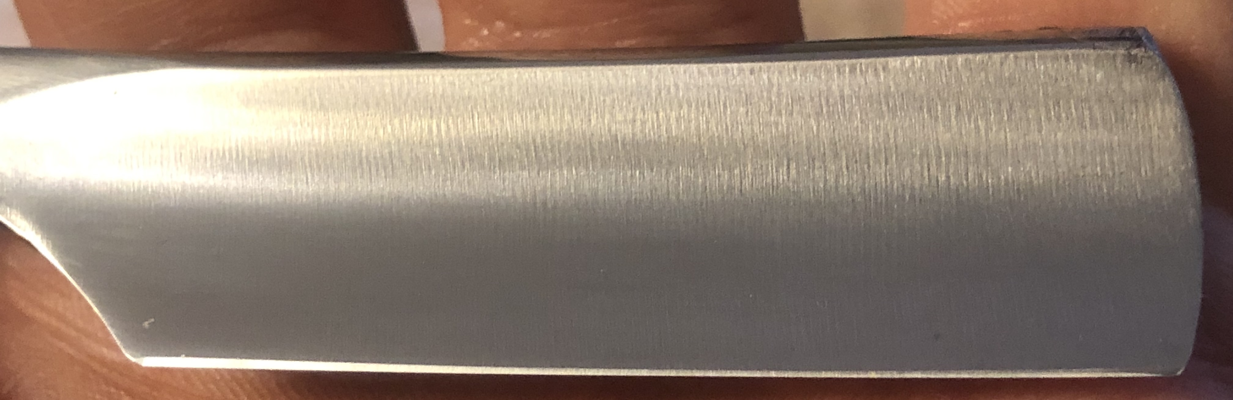 Бритва без следов пользования.Решил вдохнуть в клинок немного души и ручного творчества.Поперечную заводскую шлифовку переделал в ручной продольный сатин.Лицевая сторона полотна отшлифована до 10000 грит и отполирована, а обратная сторона клинка отшлифована до 400 грит. Грубый гринд примерно как на японских фреймах. Предварительно бритва была разобрана, почищен район осевого пина и снова собрана, с сохранением оригинальных пинов.Сталь чистая от разного рода видимых дефектов. Идеальная геометрия.Кромочка равномерна по всей длине и еле заметна.В общем и целом очень красивая эффектная бритва.Заточена и готова к бритью.