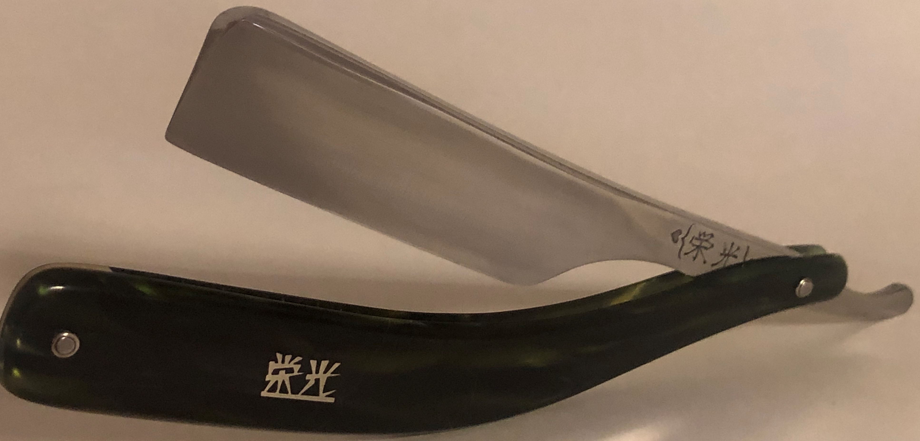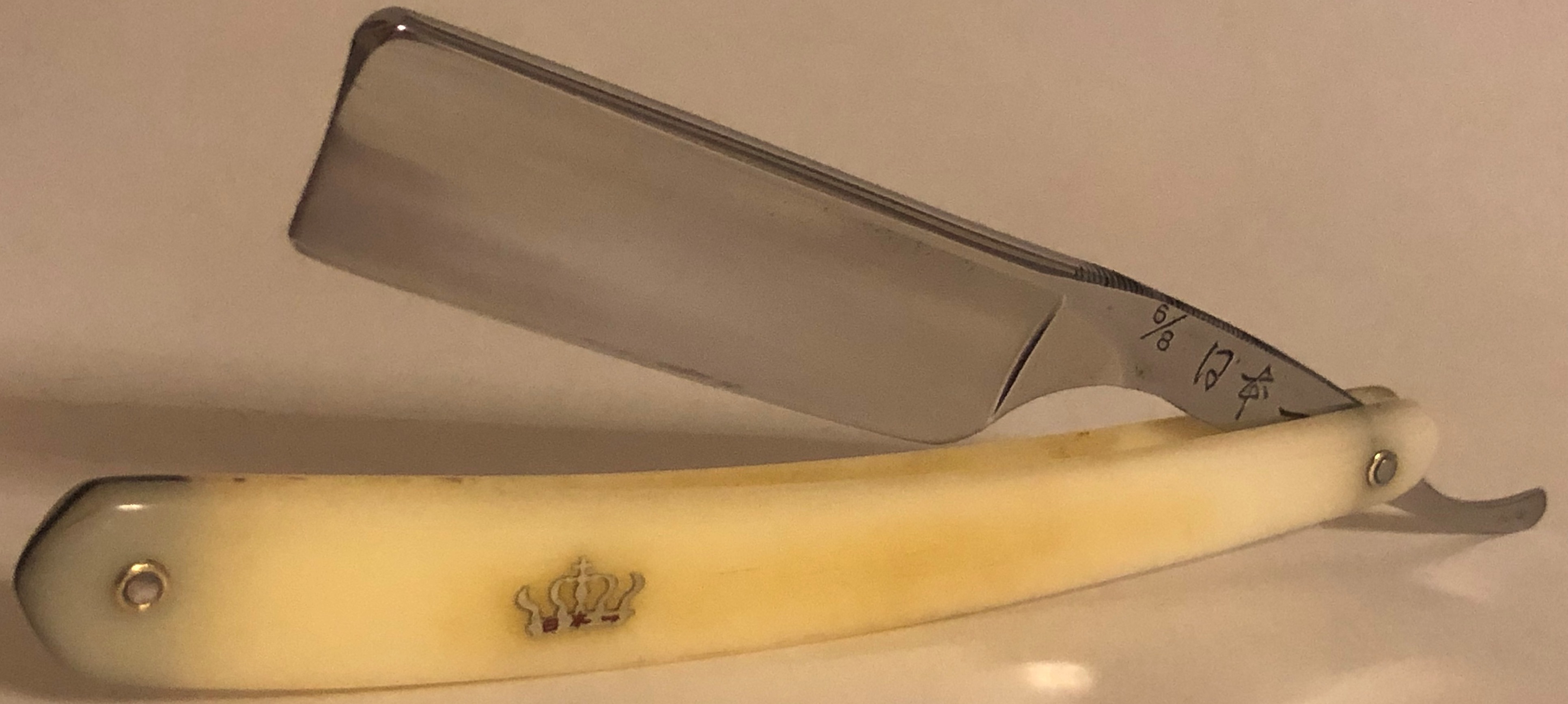 Бритва в идеальном и непользованном состоянии.Заводская шлифовка и полировка полотна, за исключением хвостовика и эрля,который пришлось немного освежить от патины и старинного окисления. Оригинальные пины были установлены заново.Классическая японская бритва, созданная в евро стиле.На мой взгляд, прекрасная вещь, по всем показателям:качественная,"звонкая" сталь, вкупе с идеальной геометрией и по-японски аскетичным видом.Ничего лишнего, для профессионального парикмахерского инструмента.Бритва имеет вид нетронутой.Не пропустите шикарную, рабочую бритву, за умеренную цену.Заточена и готова к бритью.