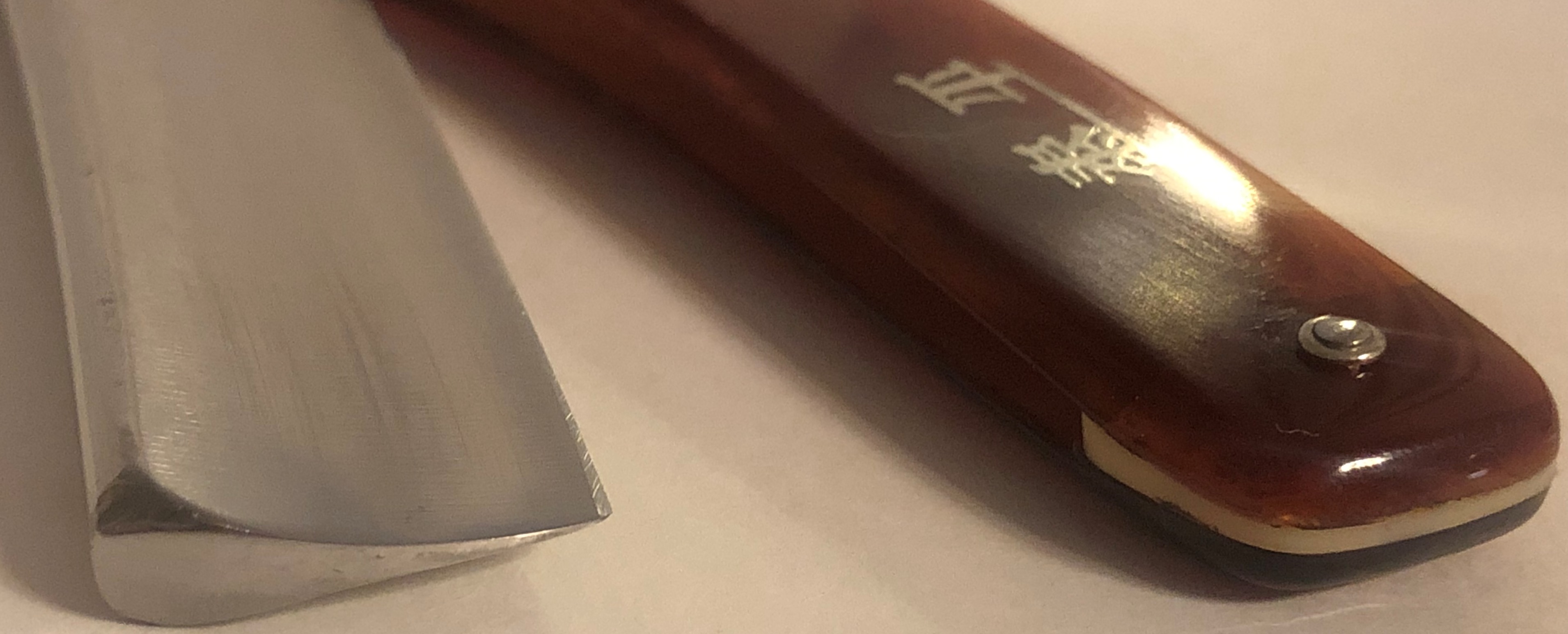 Бритва без следов пользования.Была разобрана, немного освежено полотно, умеренно отполирована и заново собрана,с сохранением оригинальных пинов.Идеальная геометрия:кромочка равномерна по всей длине.Сталь чистая от видимых дефектов.Тяжёлая, по-японски аскетичная, но в тоже время очень красивая, с прекрасной "звонкой" сталью бритва.Отличный рабочий инструмент на все случаи жизни. Заточена и готова к бритью.