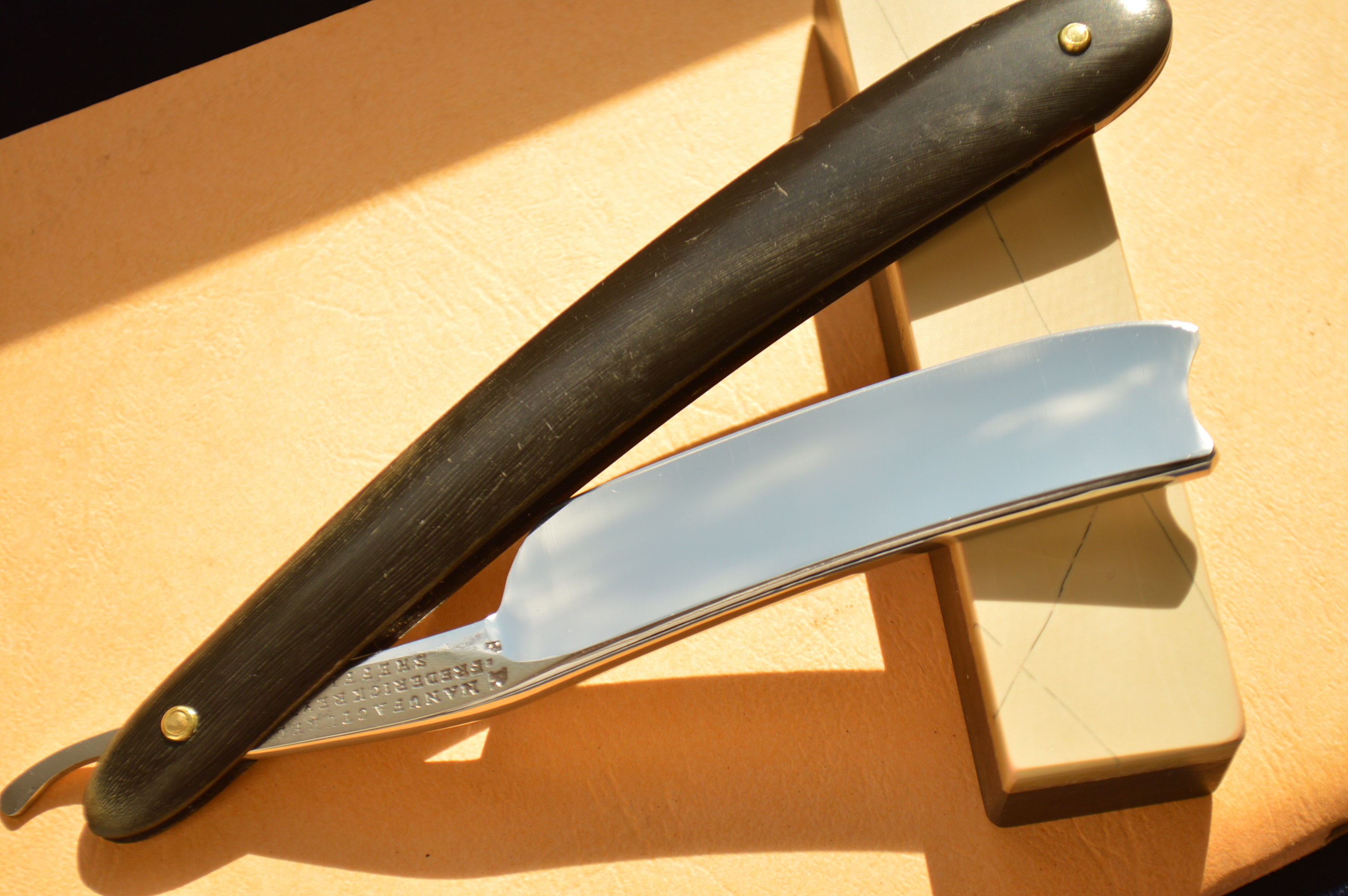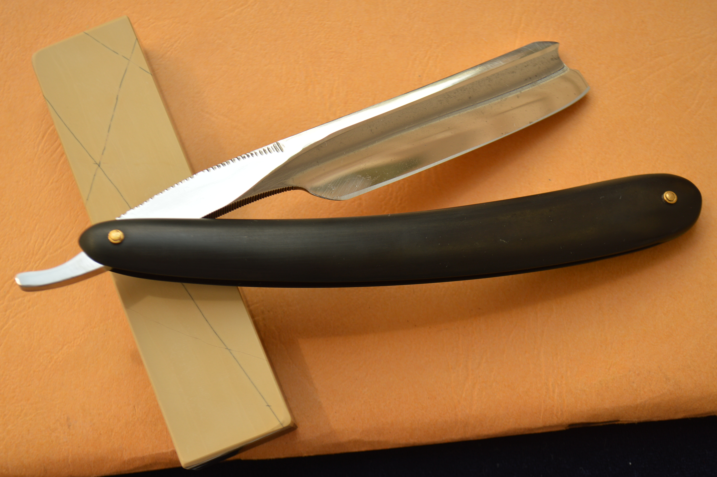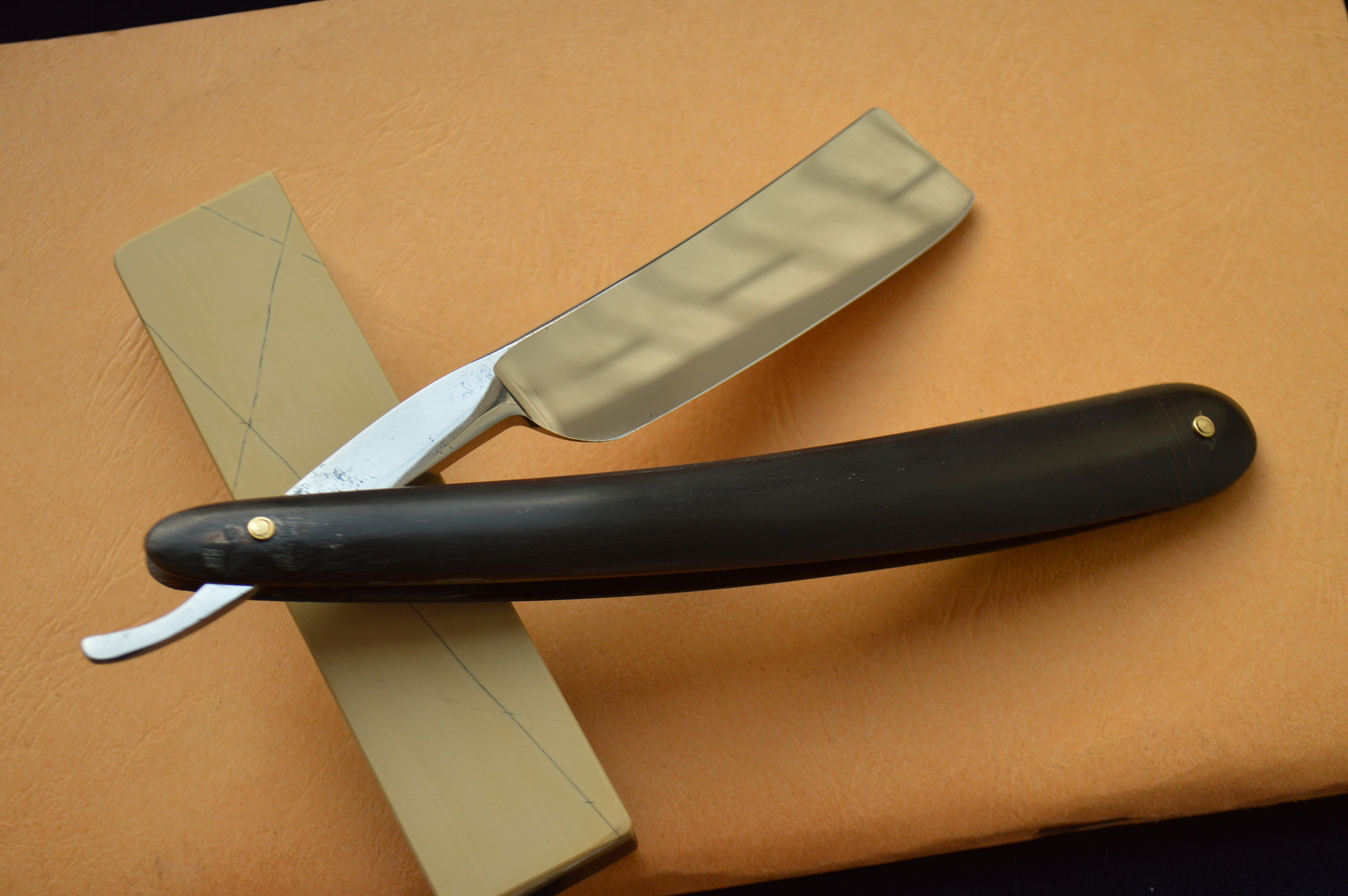 Профессионально восстановленная бритва в строении клин. Ширина полотна – 6/8, ручка рог в замечательном сохране. Сама сталь в лучших традициях французских бритв: вязкая, мелко-зернистая, бритье превосходно мягкое и чистое. То, как бреет эта бритва можно рассказывать часами, но главное, что вам нужно знать это то, что мягче бритвы вы не пробовали это точно. Отдельного упоминания заслуживает форма бритвы и исполнение спинки, эрля и хвостика. Насечки на эрле с двух сторон, которые позволяют очень удобно удерживать бритву, верхняя насечка просто громадная, редчайший вариант исполнения, при этом сам эрль удобен тем, что идет от нижней насечки к верхней на утолщение...очень тонкий ход от производителя, добавляет удобства в удержании, очень удобно в бритье при проходе сверху-вниз, а так же отдельного внимания заслуживает форма полотна, которое имеет сильно выраженную улыбку, что лучшим образом скажется на бритье. Спинка имеет ровную площадку, если бритву поставить на спинку, то она на ней так и будет стоять, от спинки уходят спуски к полотну, образовывая в сечении трапецию. Пользуйтесь возможностью, такие достойные и незаурядные образцы старой Франции практически не встречаются. За деталями прошу обращаться в личные сообщение. Оплата по договоренности обсуждается в л/с (зачастую это перевод на карту Виза по курсу на день покупки), отправка посредством государственной почты Украины и России. Резерв в л/с. Цена 600 дол (доставка включена в стоимость) Spoiler Show