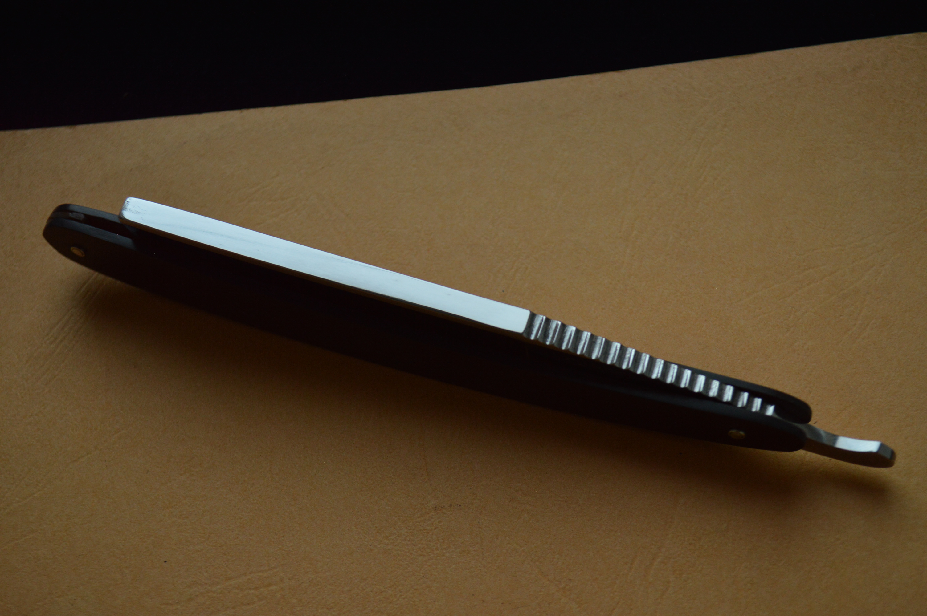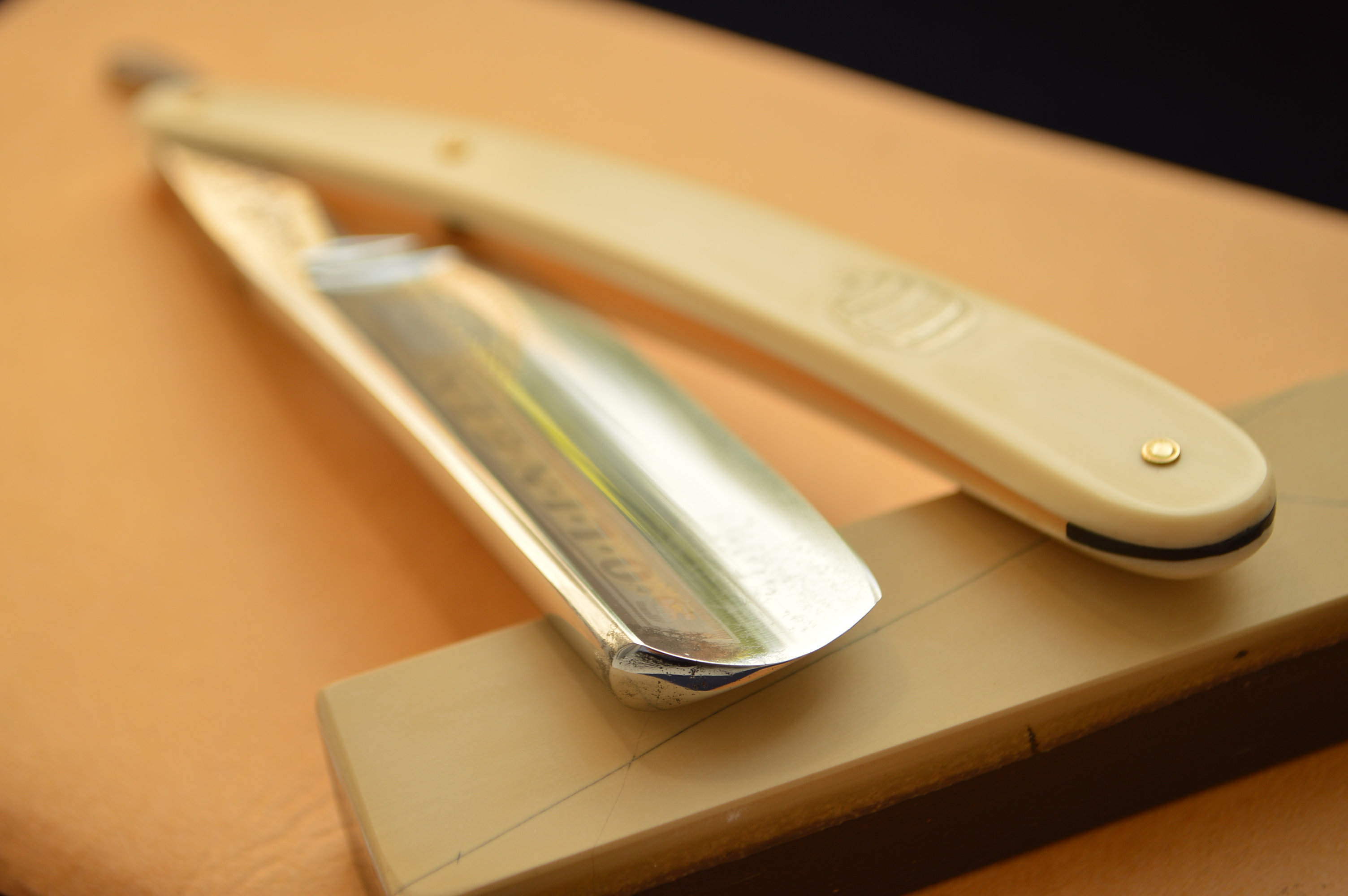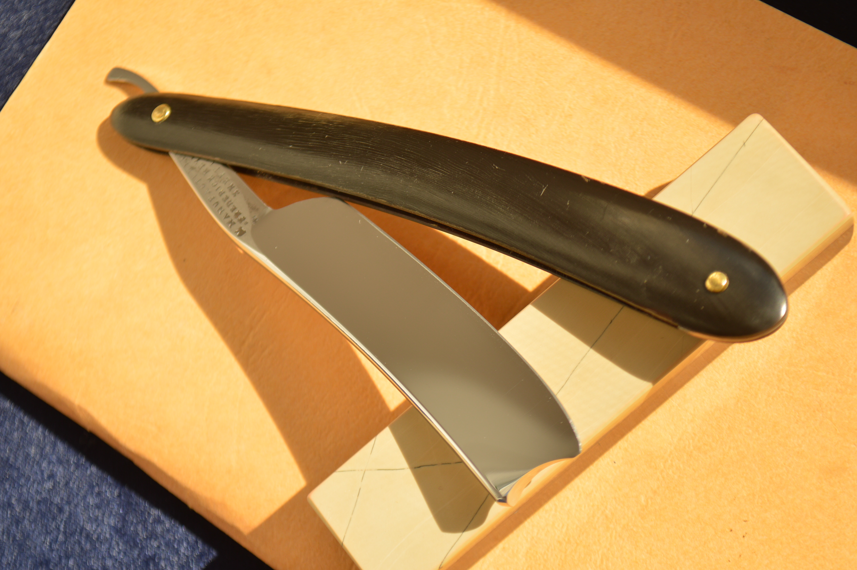 Профессионально восстановленная бритва в строении клин. Ширина полотна – 6/8, ручка рог в замечательном сохране. Сама сталь в лучших традициях французских бритв: вязкая, мелко-зернистая, бритье превосходно мягкое и чистое. То, как бреет эта бритва можно рассказывать часами, но главное, что вам нужно знать это то, что мягче бритвы вы не пробовали это точно. Отдельного упоминания заслуживает форма бритвы и исполнение спинки, эрля и хвостика. Насечки на эрле с двух сторон, которые позволяют очень удобно удерживать бритву, верхняя насечка просто громадная, редчайший вариант исполнения, при этом сам эрль удобен тем, что идет от нижней насечки к верхней на утолщение...очень тонкий ход от производителя, добавляет удобства в удержании, очень удобно в бритье при проходе сверху-вниз, а так же отдельного внимания заслуживает форма полотна, которое имеет сильно выраженную улыбку, что лучшим образом скажется на бритье. Спинка имеет ровную площадку, если бритву поставить на спинку, то она на ней так и будет стоять, от спинки уходят спуски к полотну, образовывая в сечении трапецию. Пользуйтесь возможностью, такие достойные и незаурядные образцы старой Франции практически не встречаются. За деталями прошу обращаться в личные сообщение. Оплата по договоренности обсуждается в л/с (зачастую это перевод на карту Виза по курсу на день покупки), отправка посредством государственной почты Украины и России. Резерв в л/с. Цена 600 дол (доставка включена в стоимость) Spoiler Show