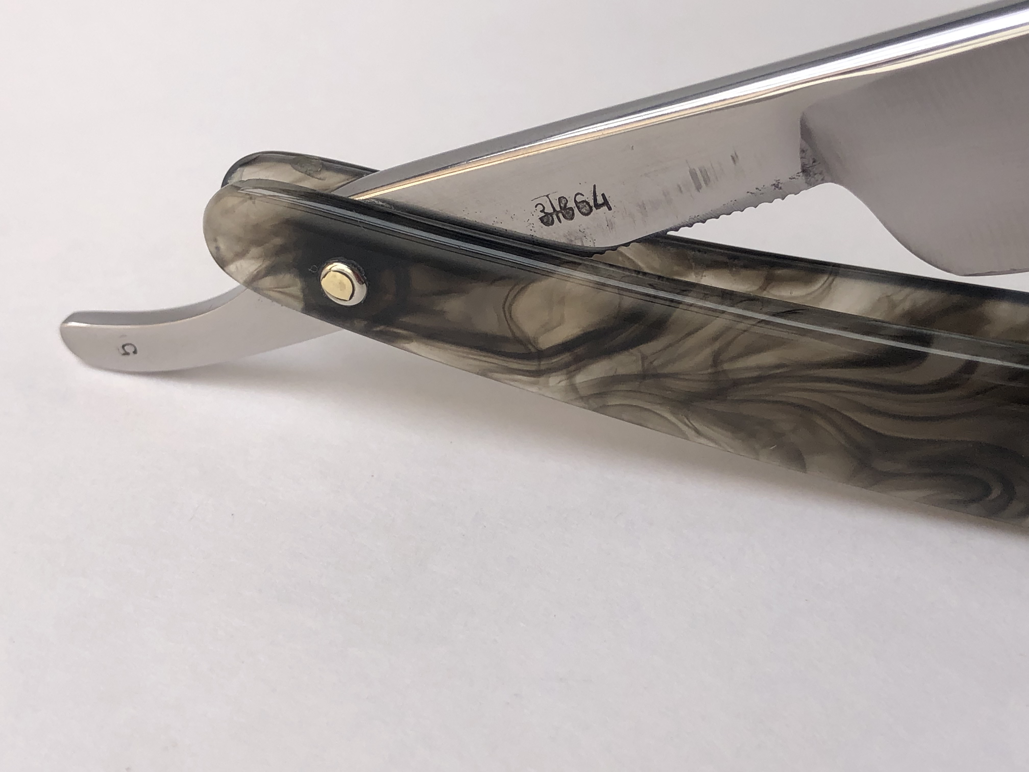 Бритва в пользовании не была.Клинок в идеальном состоянии.На самых тонких абразивах был освежен металл,с повторением "родного" гринда, а также умеренно отполирован.Оригинальную ручку заменил на эффектную оправу от японского послевоенного донора.В отличие от оригинала сейчас бритва смотрится намного интереснее.Само полотно чистое от разного рода видимых дефектов. Идеальная геометрия:кромочка равномерна по всей длине.Двух-цветные японские старинные пины, с добавлением внутренних шайб, для порядка.Отличный и недорогой вариант для новичка. Не пропустите.
