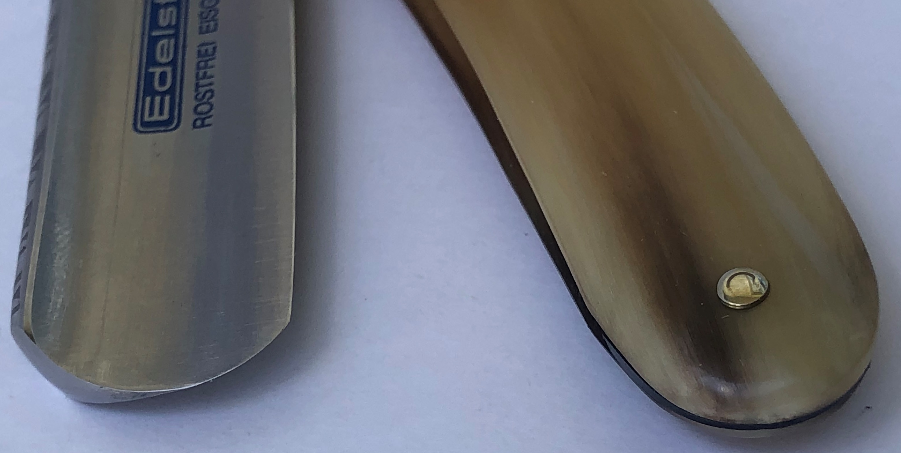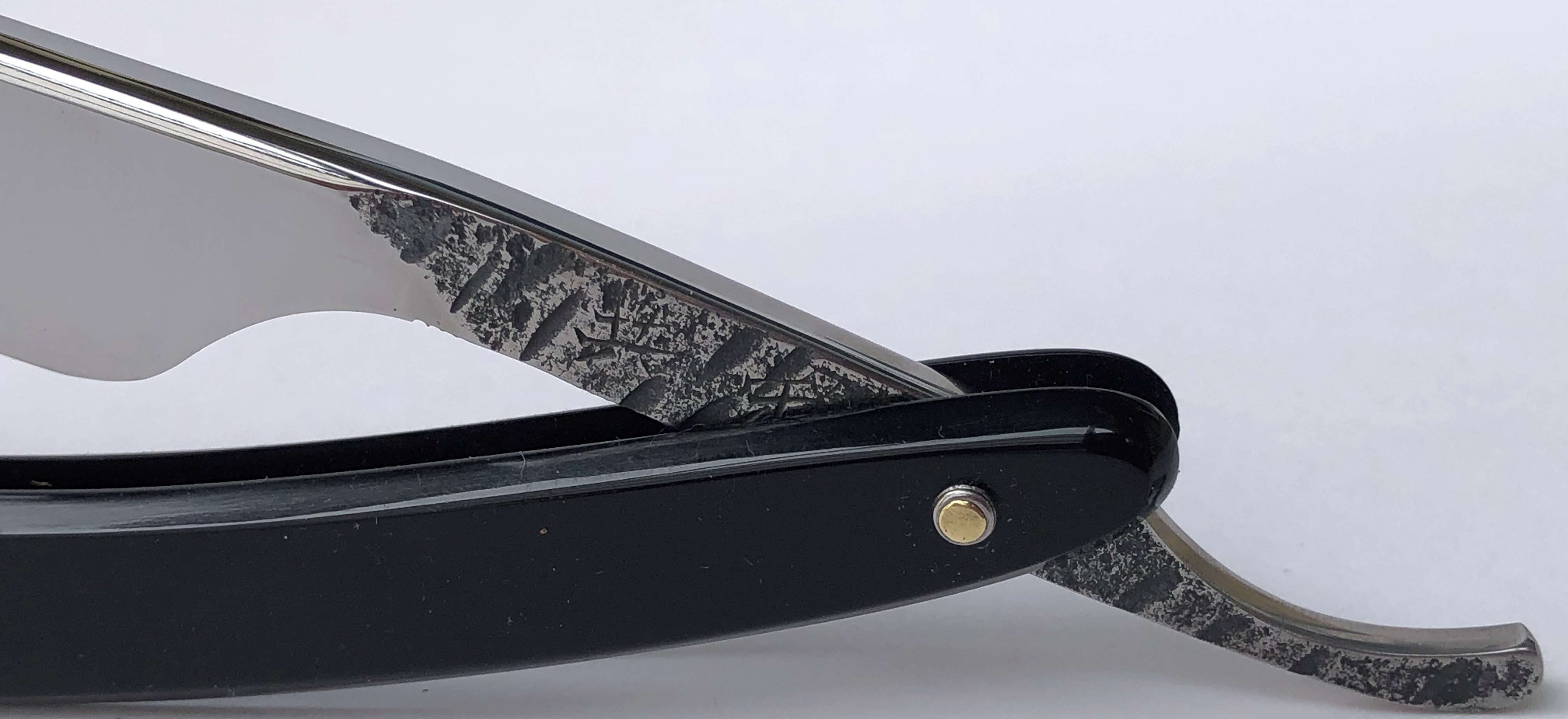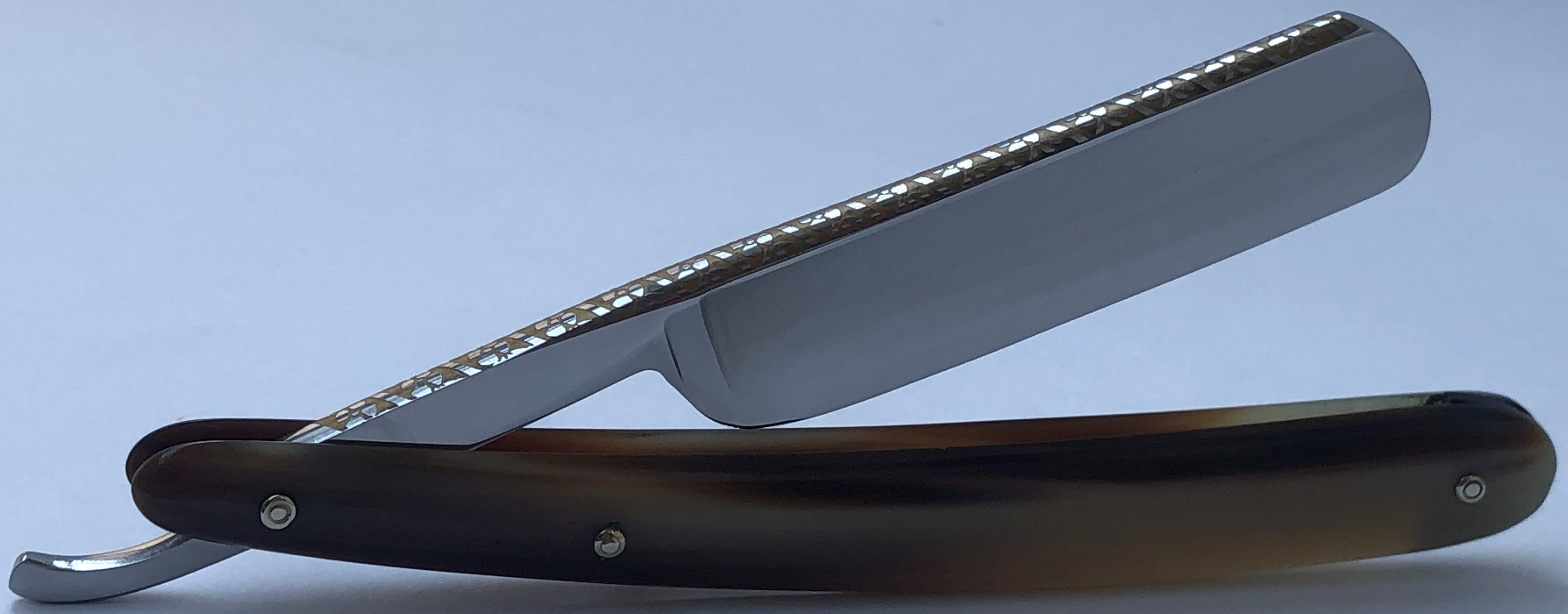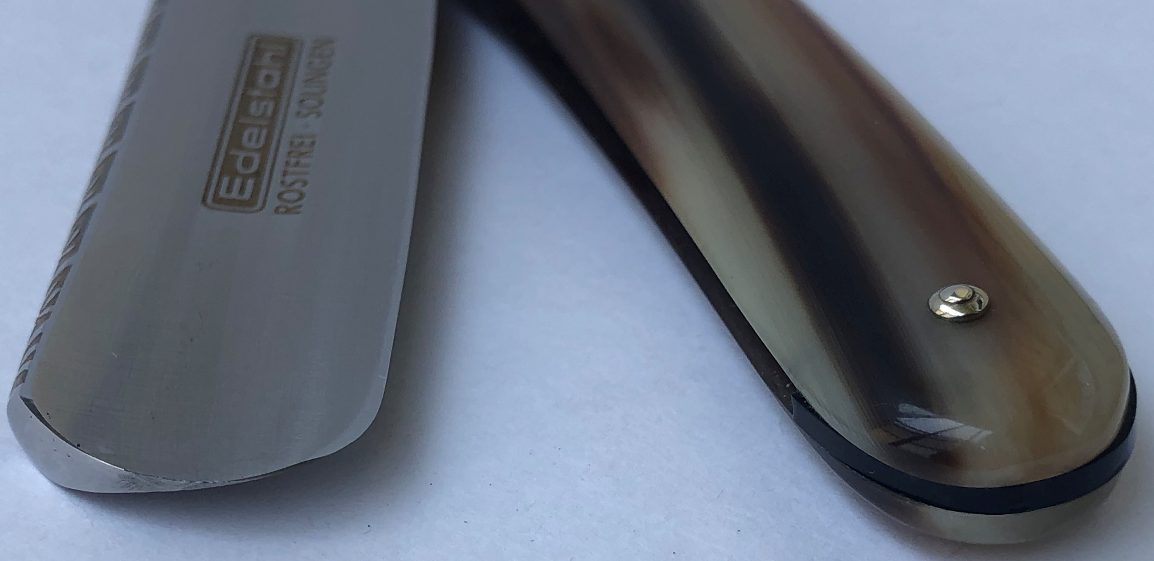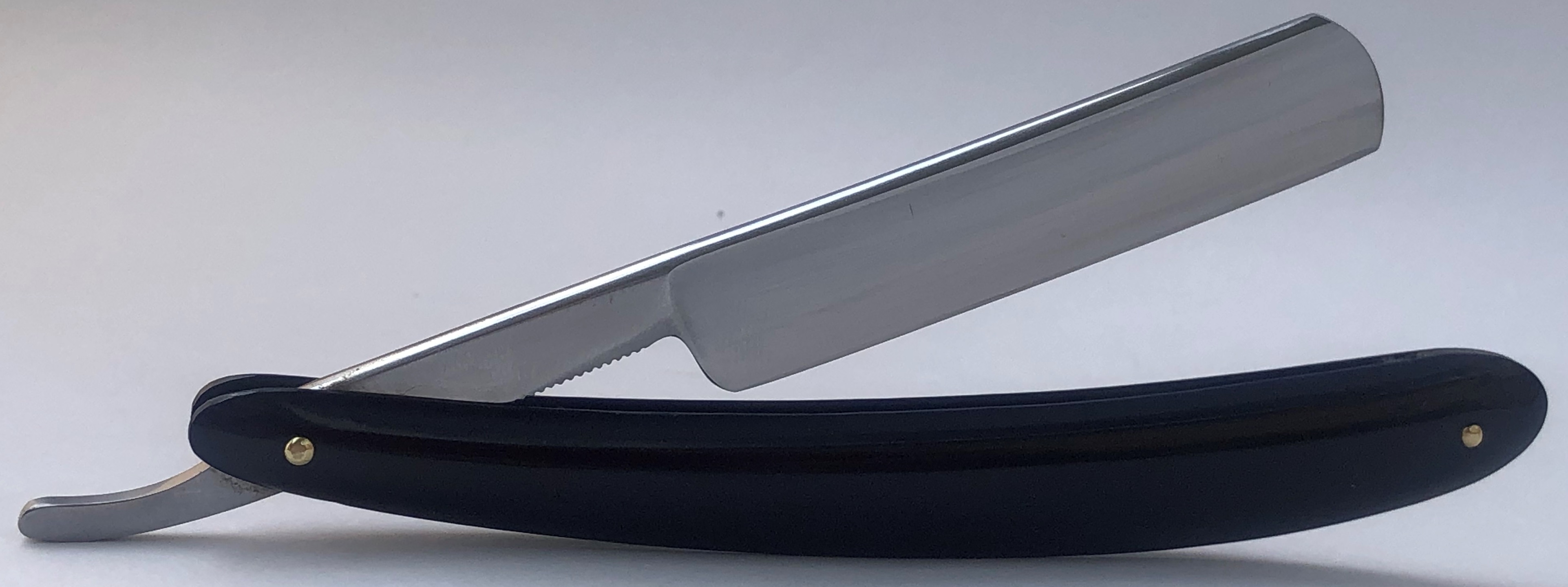 Бритва в идеальном и непользованном состоянии. Ничего не разбиралось и не ремонтировалось.Все как вчера с завода.Оригинальная шлифовка и полировка клинка.Идеальная геометрия полотна:кромочка равномерна по всей длине.Шикарная оправа из натурального рога. Третий средний пин надежно держит оправу от деформации.Ажурный и эффектный обушок.