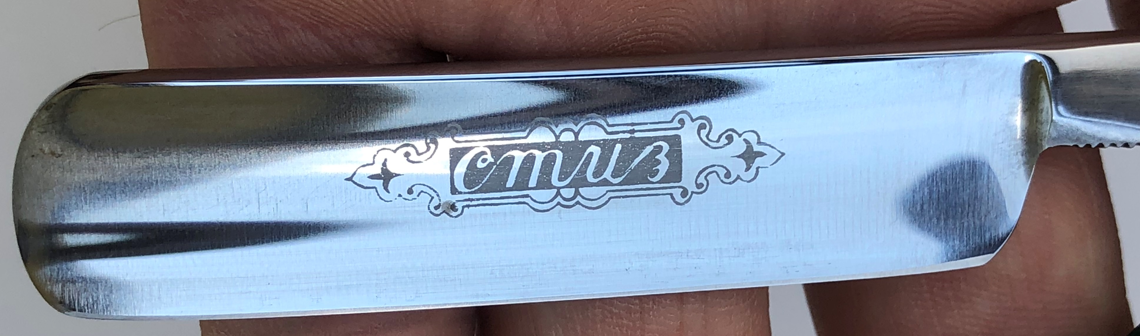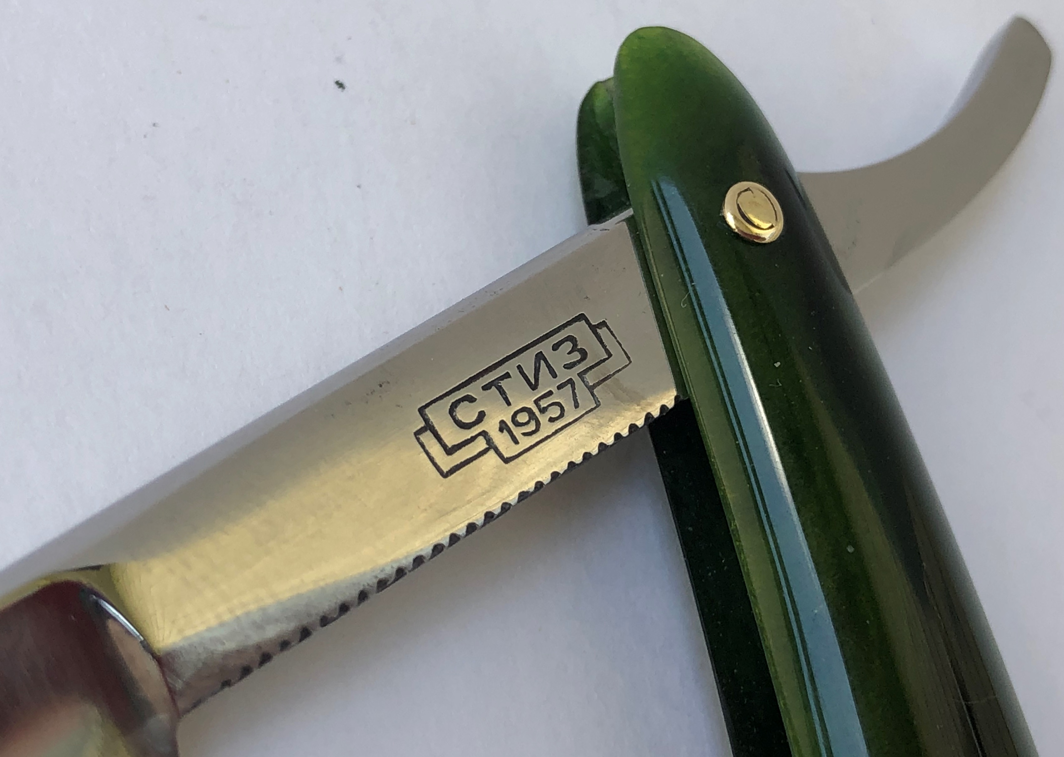 Бритва в пользовании не была. Остатки следов от заводской электро-химической заточки. Не разбиралась и не ремонтировалась.Бритва вся в оригинале. Родная шлифовка и полировка клинка. Немного протер тряпочкой с полиролью для удаления небольшого количества патины.Бритва массивная, с толстым эрлем.Интересная форма лезвия, с "горбатым" обушком.Заводскую заточку переделал и довел до нормального бритья. Идеальная геометрия клинка:кромочка равномерна по всей длине.Родная коробочка в комплекте!