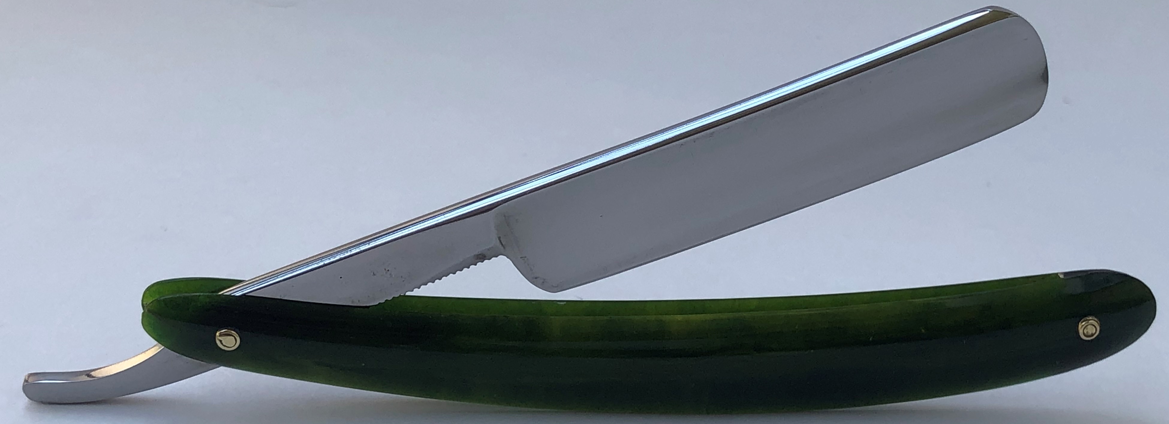 Бритва в идеальном непользованном состоянии. Не разбиралась и не ремонтировалась.Все в оригинале. Заводская шлифовка и полировка. Идеальная геометрия клинка:кромочка равномерна по всей длине.Эффектный, ажурный обушок.Отличный коллекционный экземпляр.Не пропустите! Перед отправкой будет заточена и доведена до комфортного бритья.