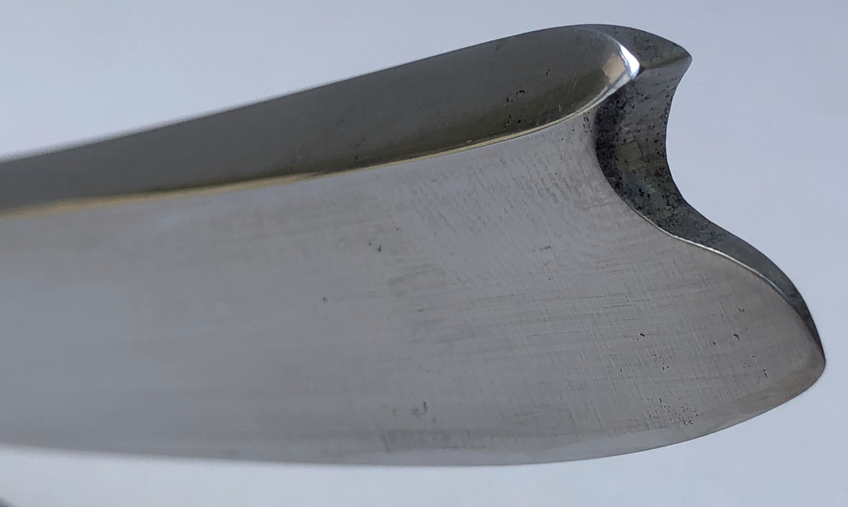 Идеальное состояние полотна,с родной шлифовкой и полировкой и остатками следов от электро-химической заводской заточки.Идеальная геометрия клинка:кромочка равномерна по всей длине.Гравировка на клинке четкая, без потертостей.