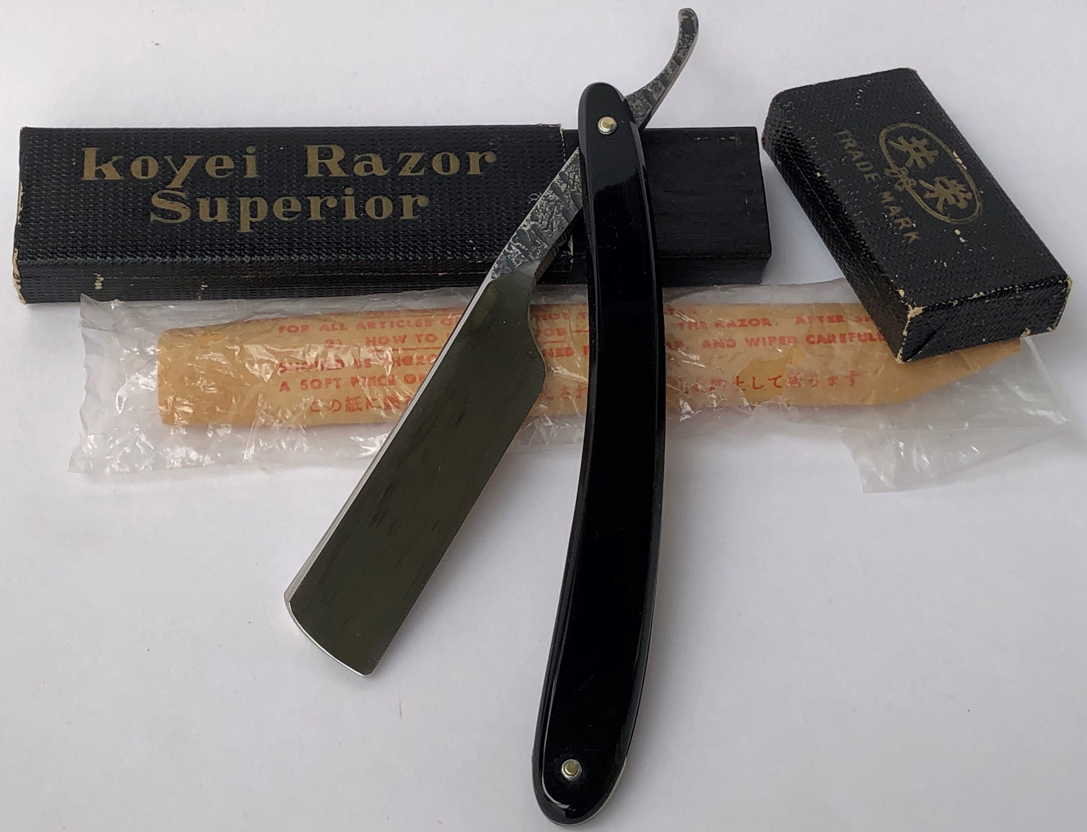 Бритва непользованная, исключительного коллекционного состояния.На мой чисто субъективный взгляд,подобная вещь несет в себе высшую степень японского бритвенного искусства прошлого.Бритва, которую не хочется выпускать из рук, с прекрасными изящными формами, но в тоже время мощная, тяжёлая, не прощающая ошибок.Эффектные следы ковки на эрле,четкие грани и идеальная геометрия.Чувствуется положительная энергетика мастера, вложившего всю свою любовь и талант в такую работу.Кромочка равномерна по всей длине и практически незаметна.Красивая умеренная полировка поверх сатина.(Если нанести на обушок раствор лимонной кислоты,то проявится след-переход закалки полотна).Бритва полностью оригинальная,без каких либо косметических работ.Родная коробочка и бумажка!! Сталь средней твердости.Бритва заточена и готова к бритью.