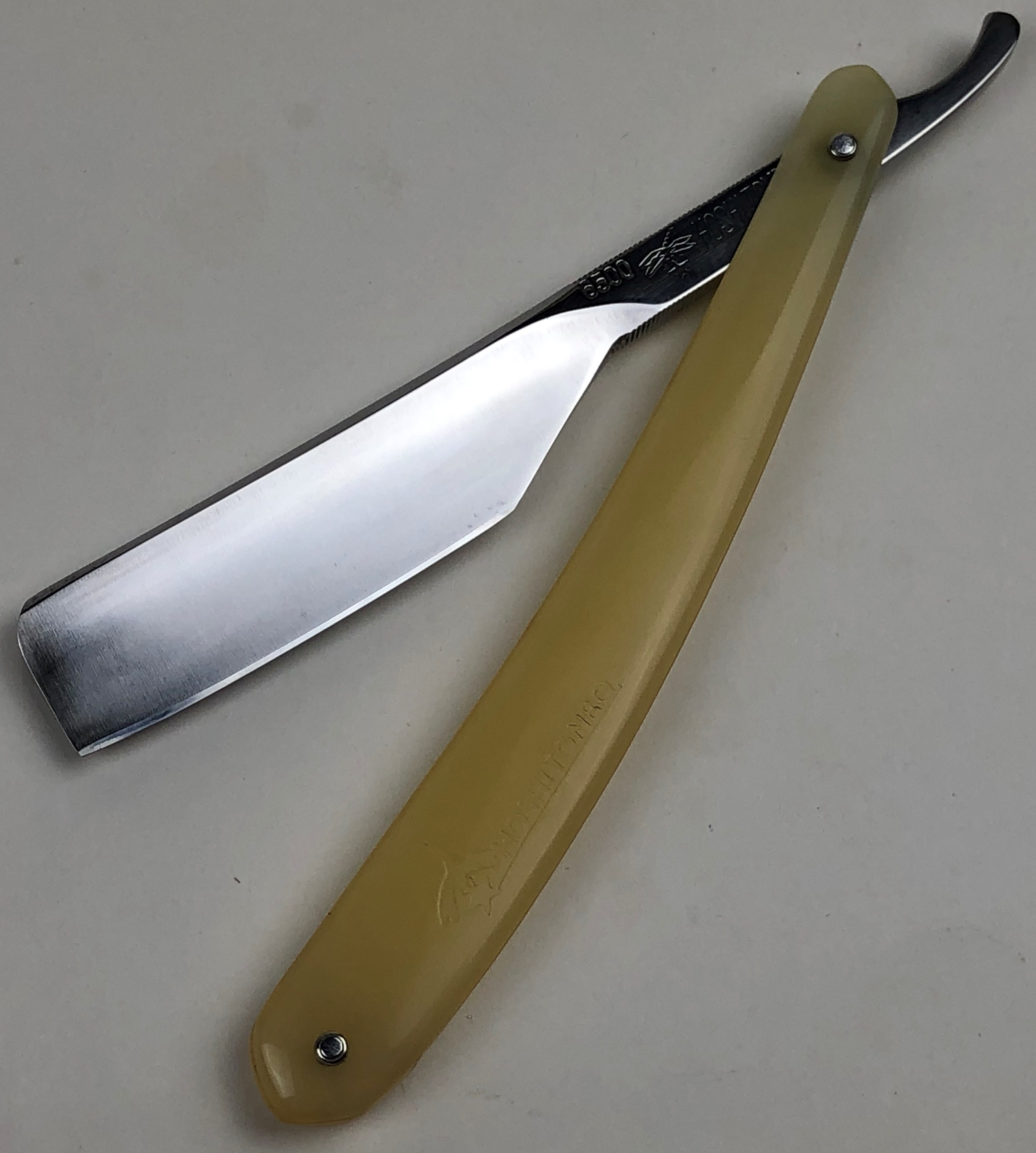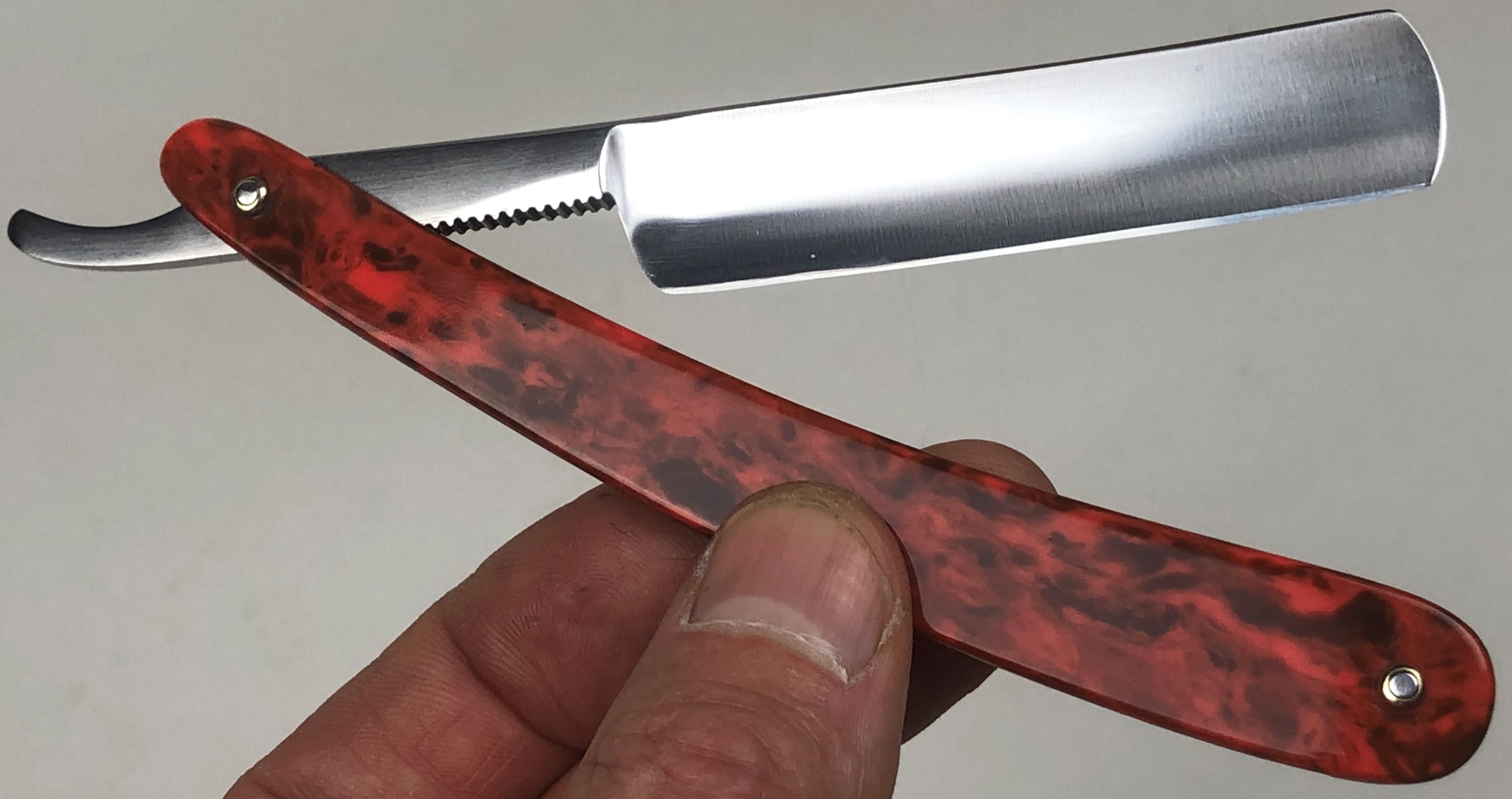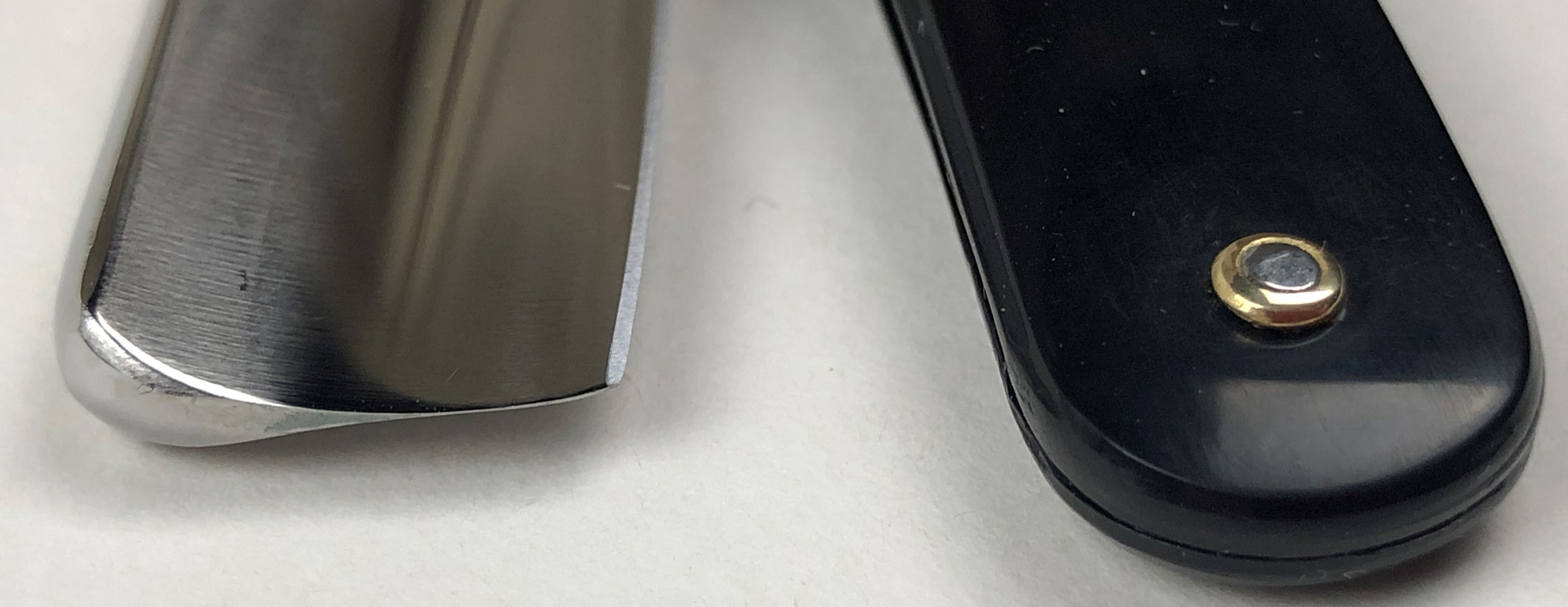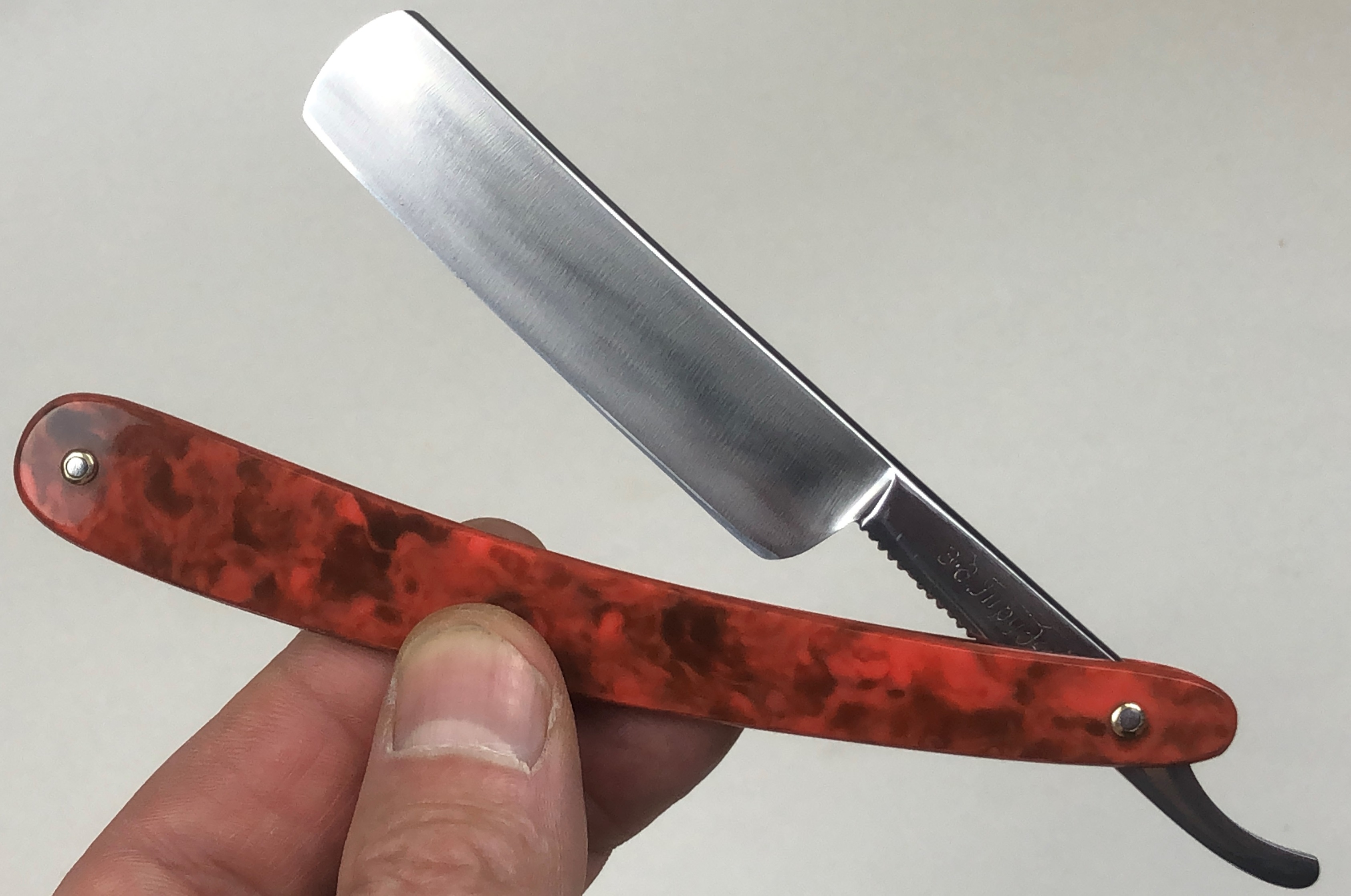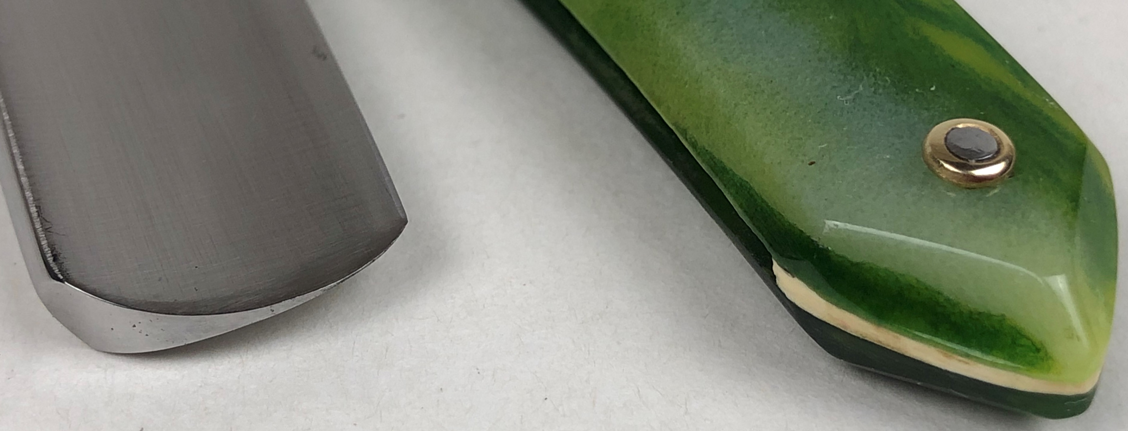 Бритва в очень хорошем состоянии. Немного откорректировал утОчку обушка и умеренно отполировал клинок.Поменял пины на двух-цветные втулки и добавил внутренние шайбы.Идеальная геометрия:кромка ровненькая по всей длине полотна.Тяжёлая.Заточена и готова к бритью.