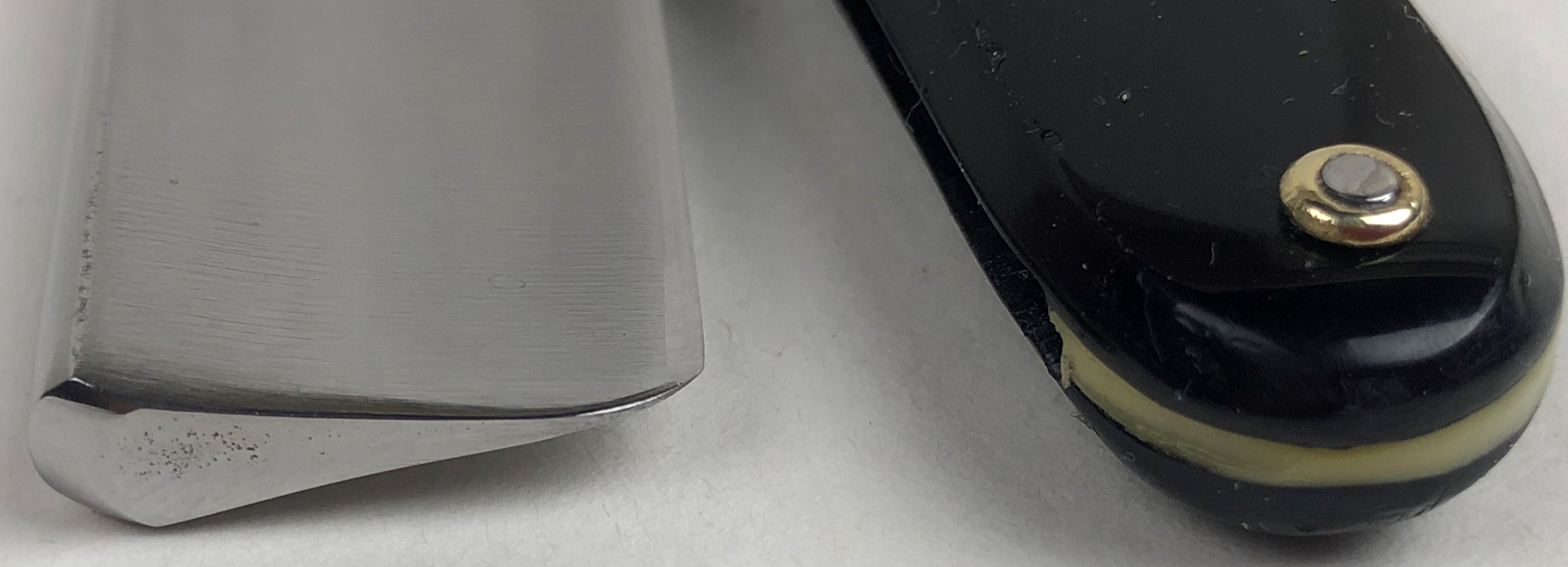 Бритва в прекрасном состоянии, близкое к идеальному, с практически незаметными следами пользования.Заводская шлифовка полотна.Что характерно, обратная сторона полотна бритвы имеет продольную ручную шлифовку, по принципу традиционной японской шлифовки катаны. Бритва была разобрана,для замены пинов и добавления внутренних шайб, для надежности.Со своей стороны умеренно полирнул металл, для придания былого блеска. Идеальная геометрия клинка:кромочка равномерна по всей длине и практически незаметна. Эффектные двух-цветные пины.Красивый и еле заметный элемент налета патины, который хорошо виден на фото, но наяву практически незаметен, но придает бритве естественный вид для своего почтенного возраста.