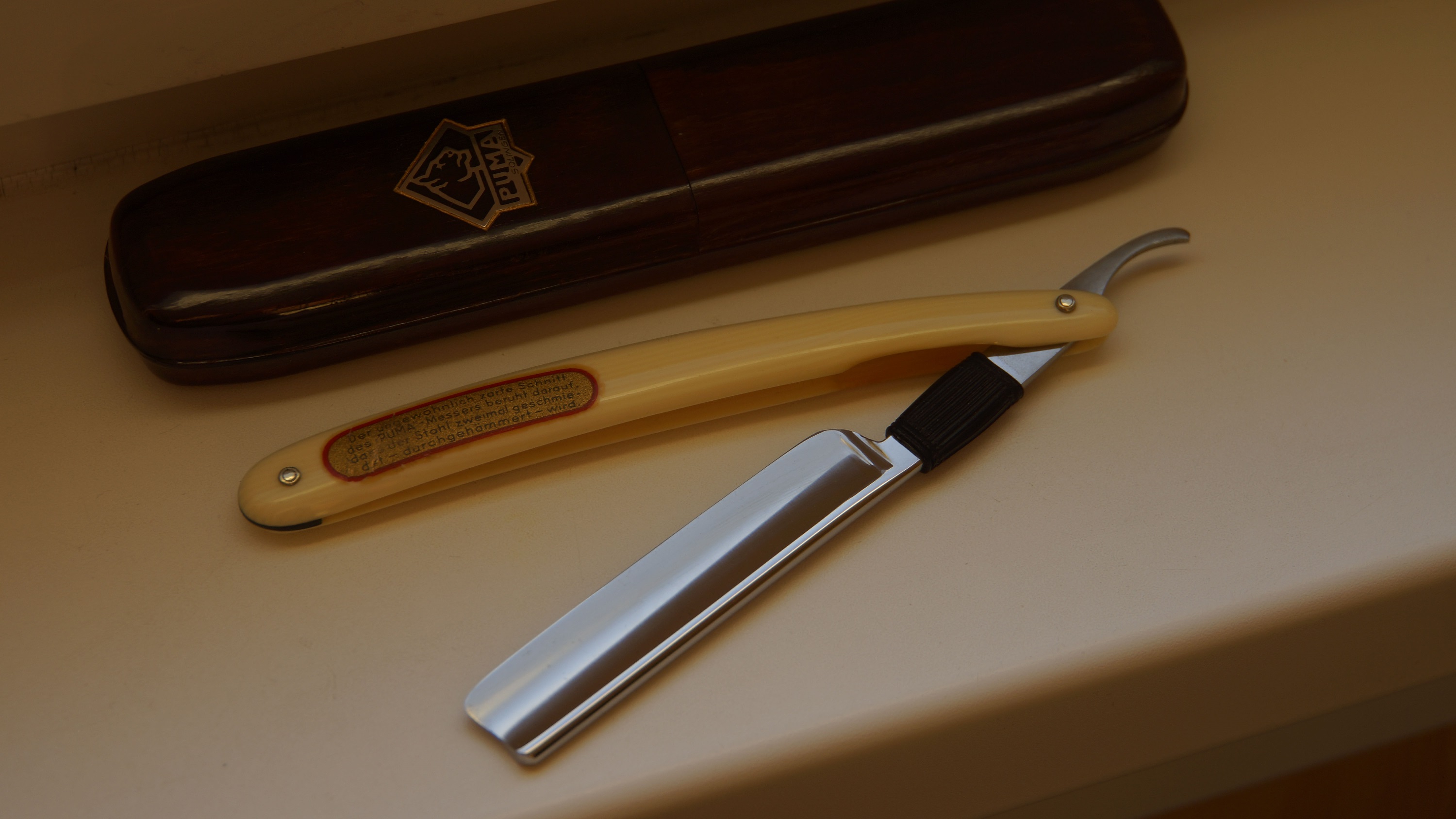 Производитель: Lauterjung & Sohn, Puma-Stahlwaren Германия, г. Золинген Ручка из целлулоида, с металлическим логотипом. Состояние на фото. Бритва заточена и готова к бритью. В комплекте также родной футляр. ПРОДАНО 10) Puma No. 1938, 5/8 Show
