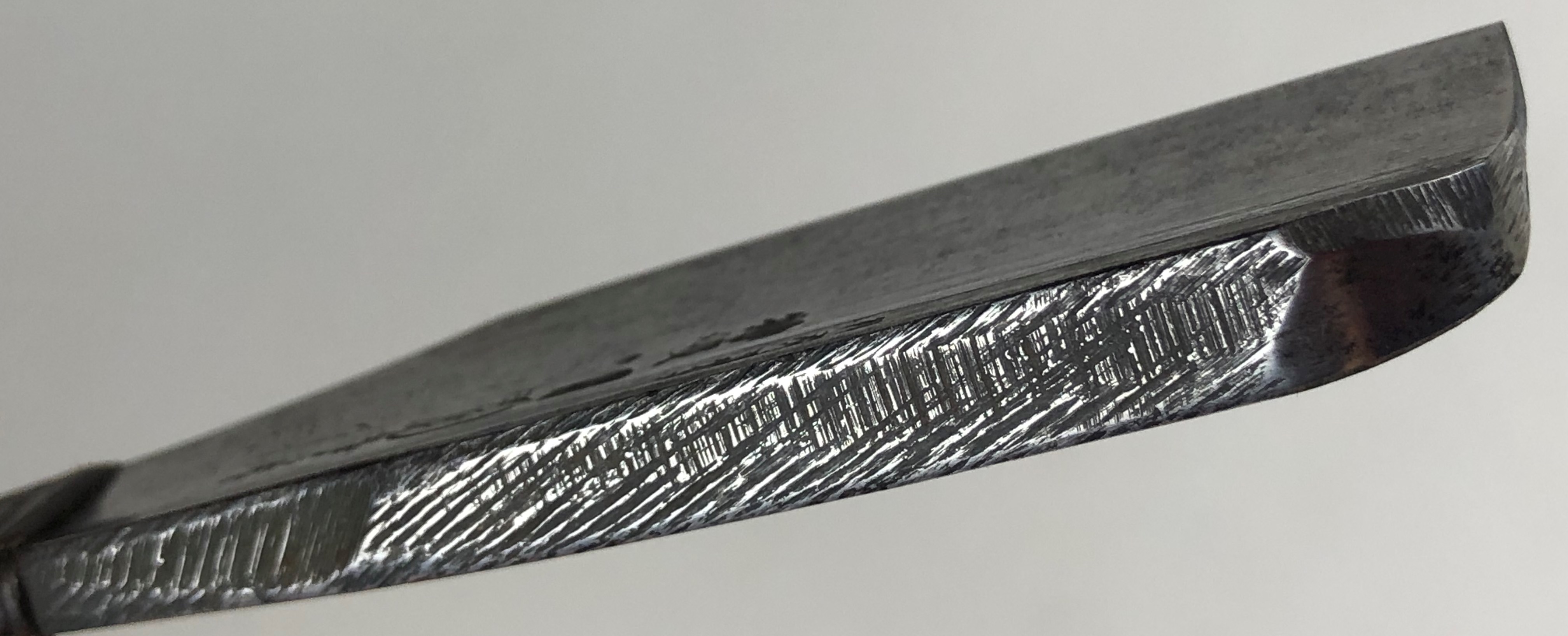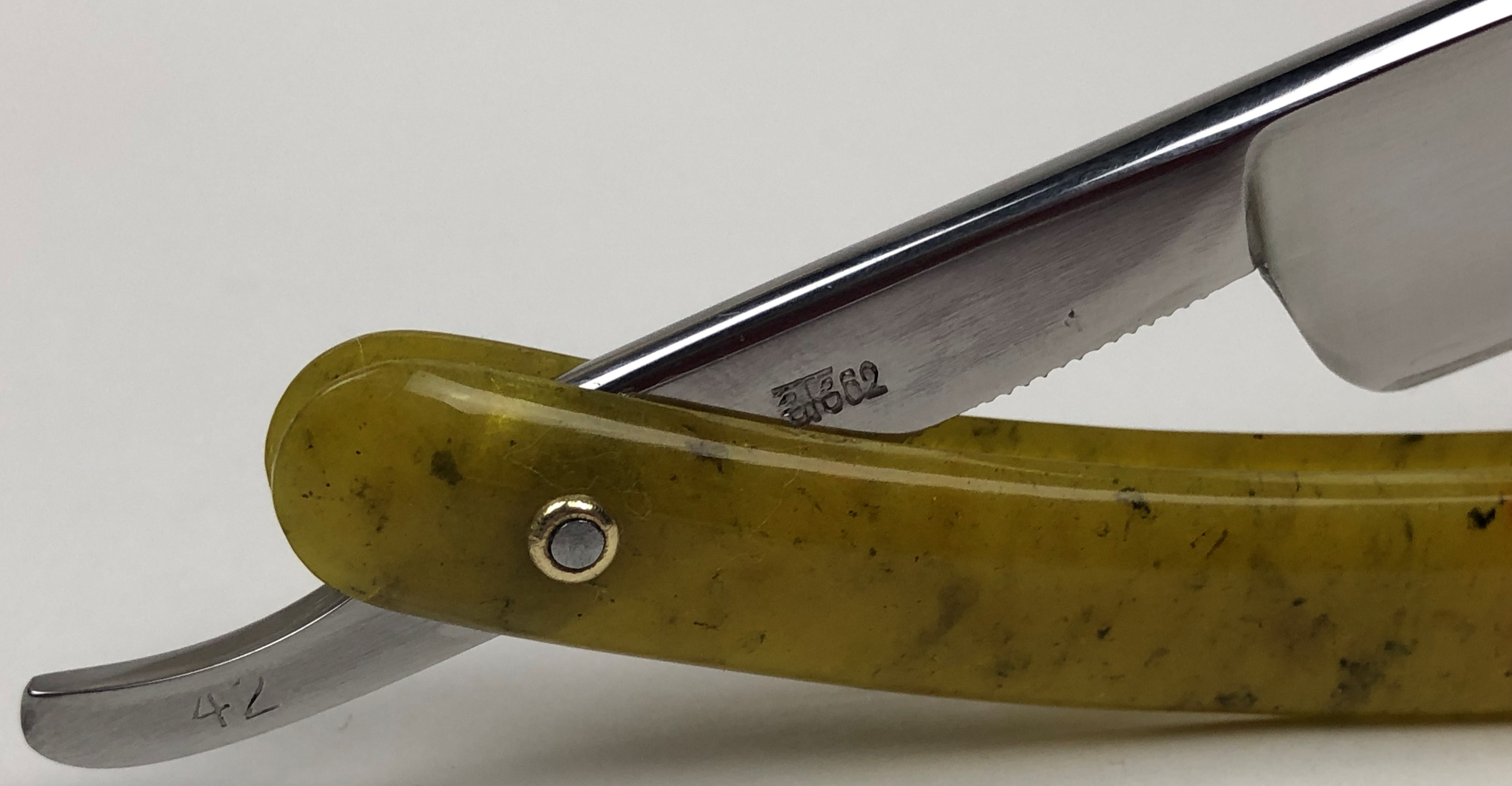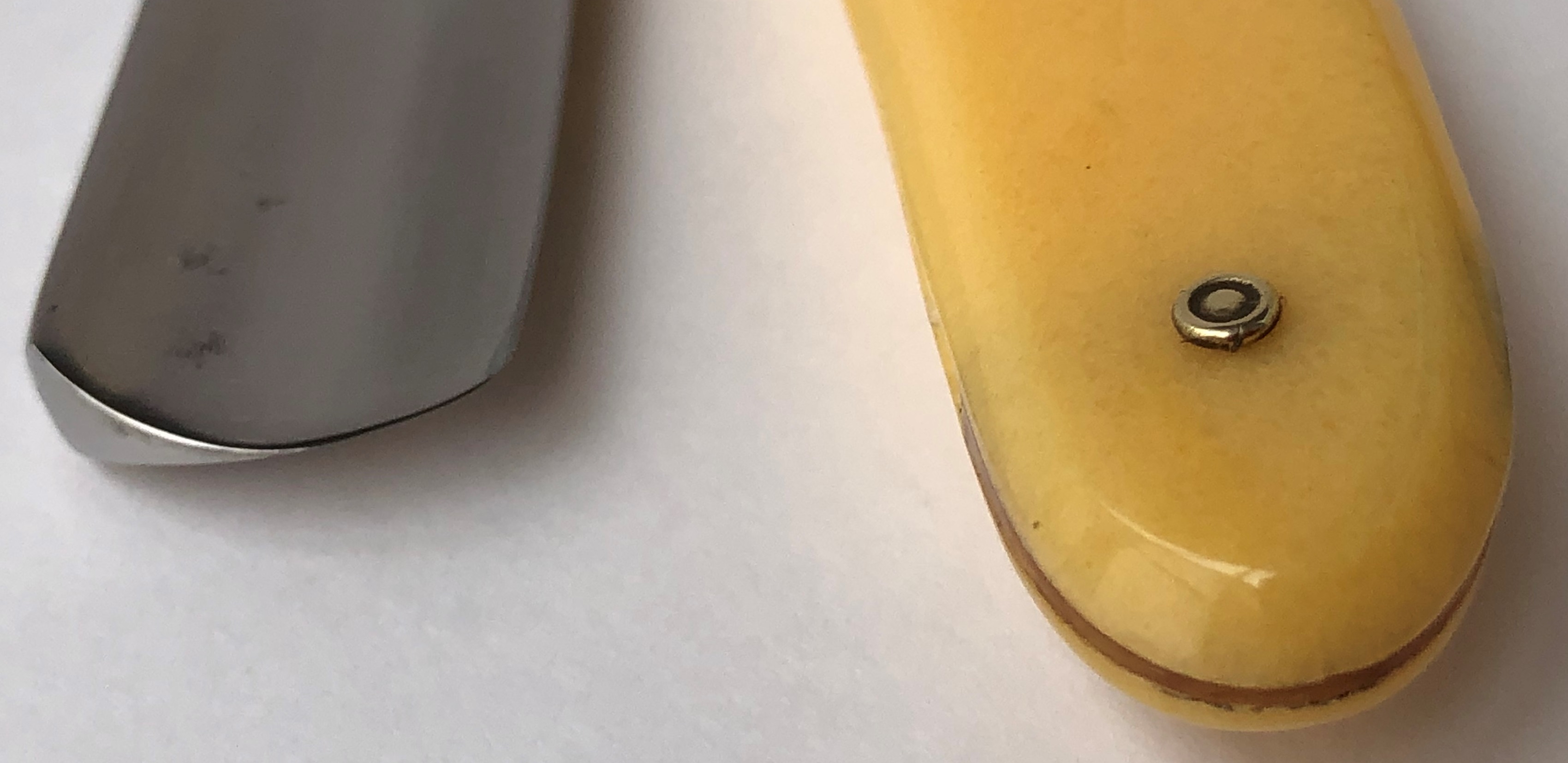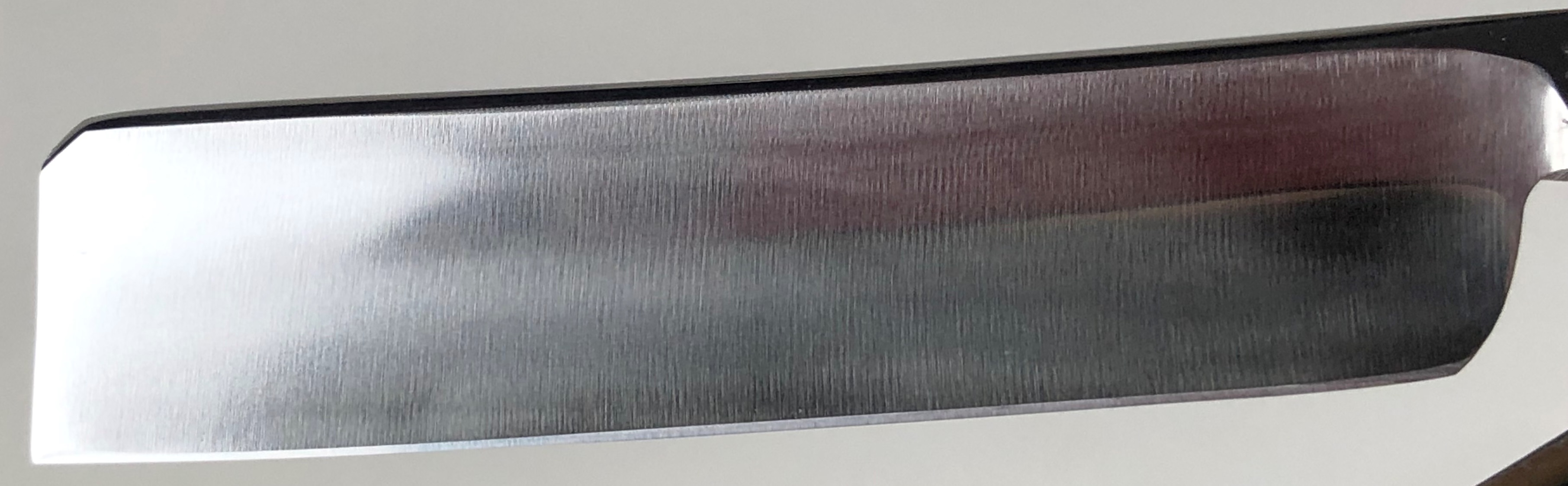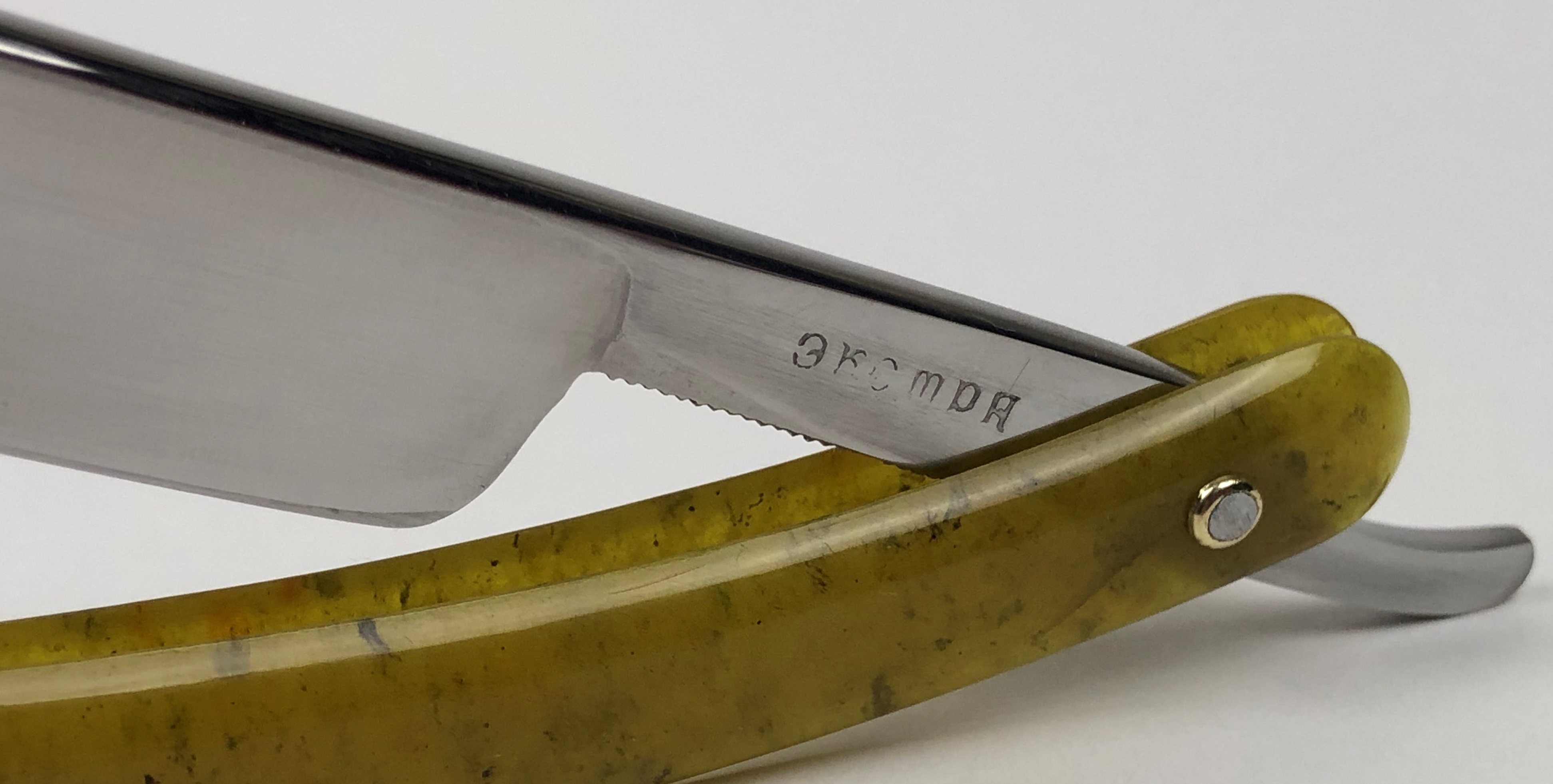 Бритва не разбиралась и не ремонтировалась. Все в оригинале. Заводская заточка была переделана под нормальное бритье.За исключением небольшого и малозначительного окисления с одной стороны полотно, все чисто, без дефектов. Геометрия приближена к идеальной.