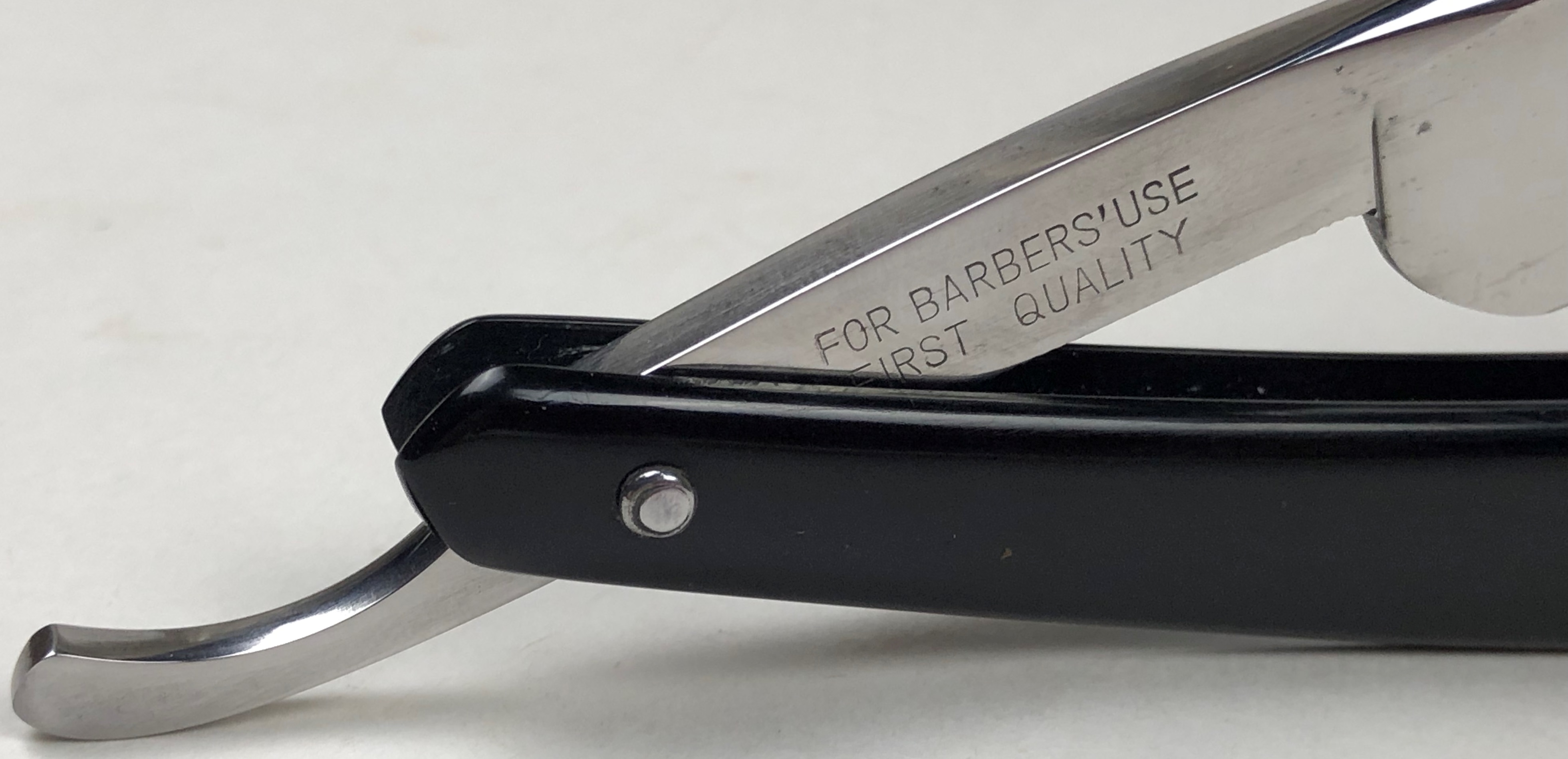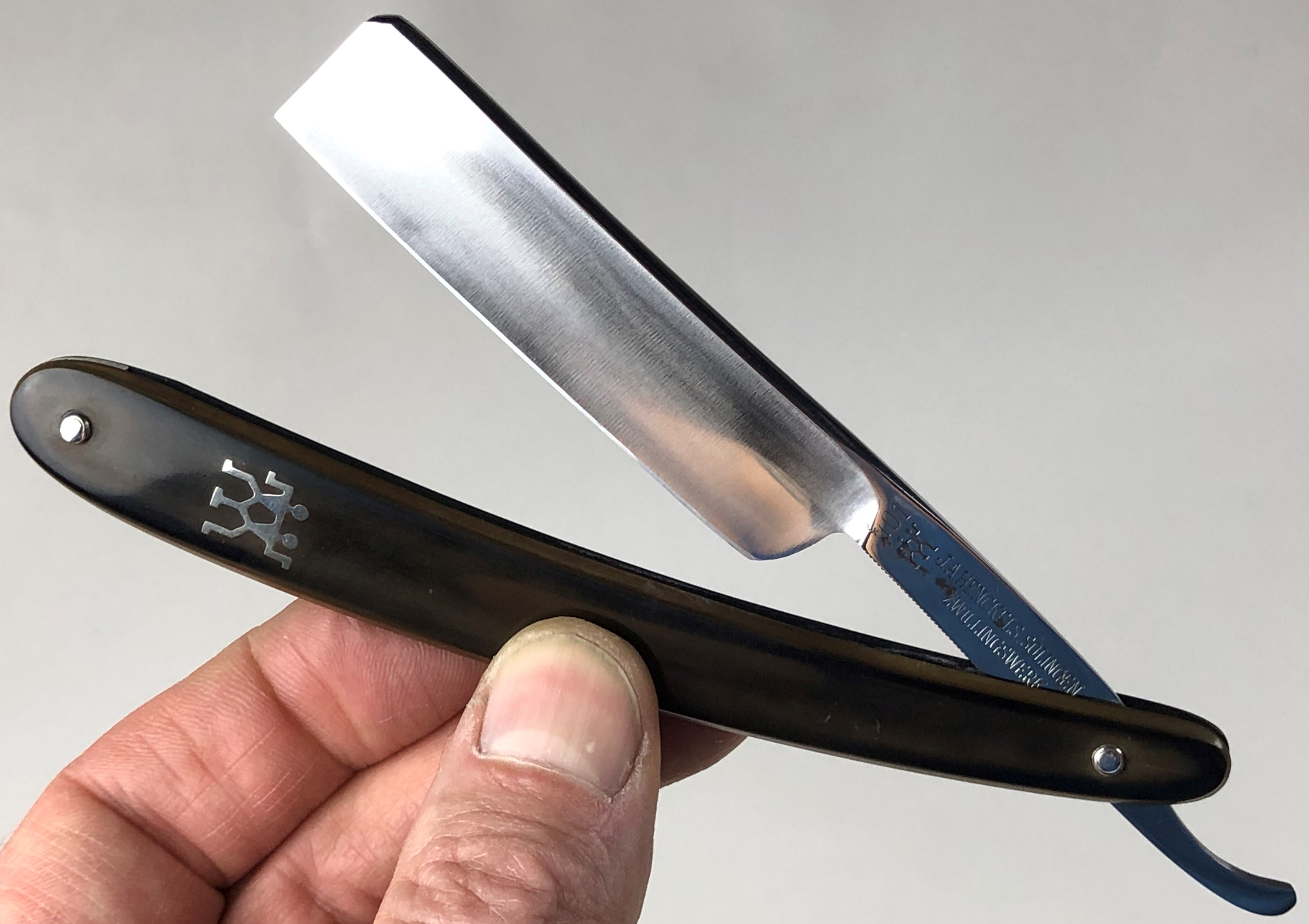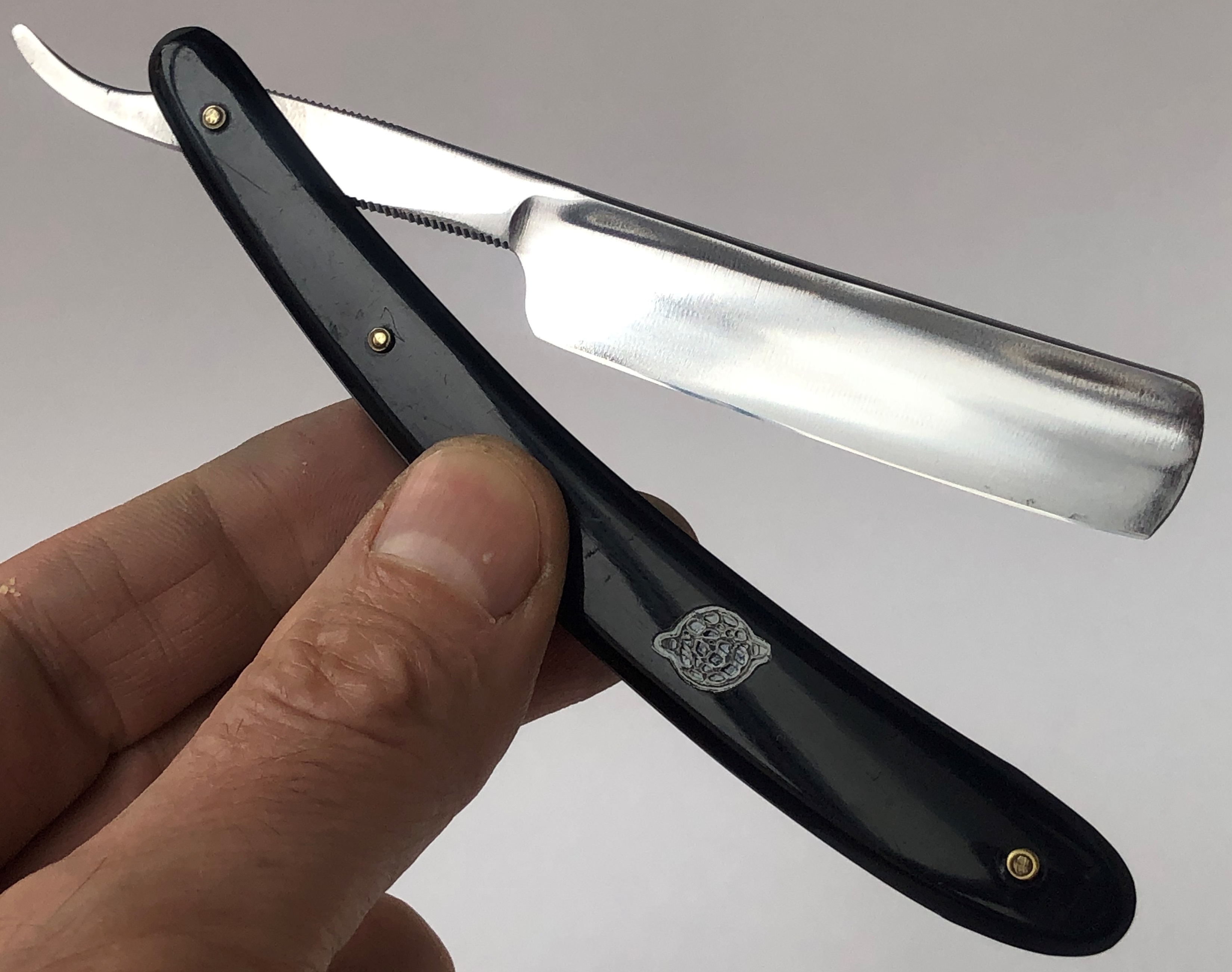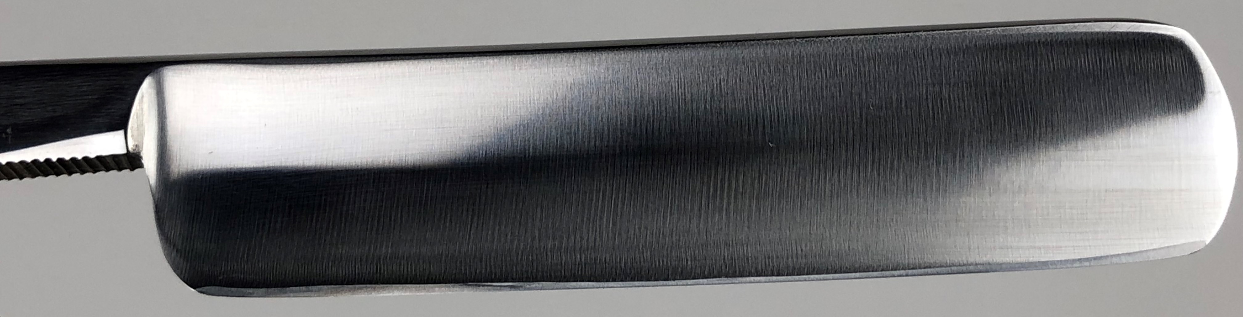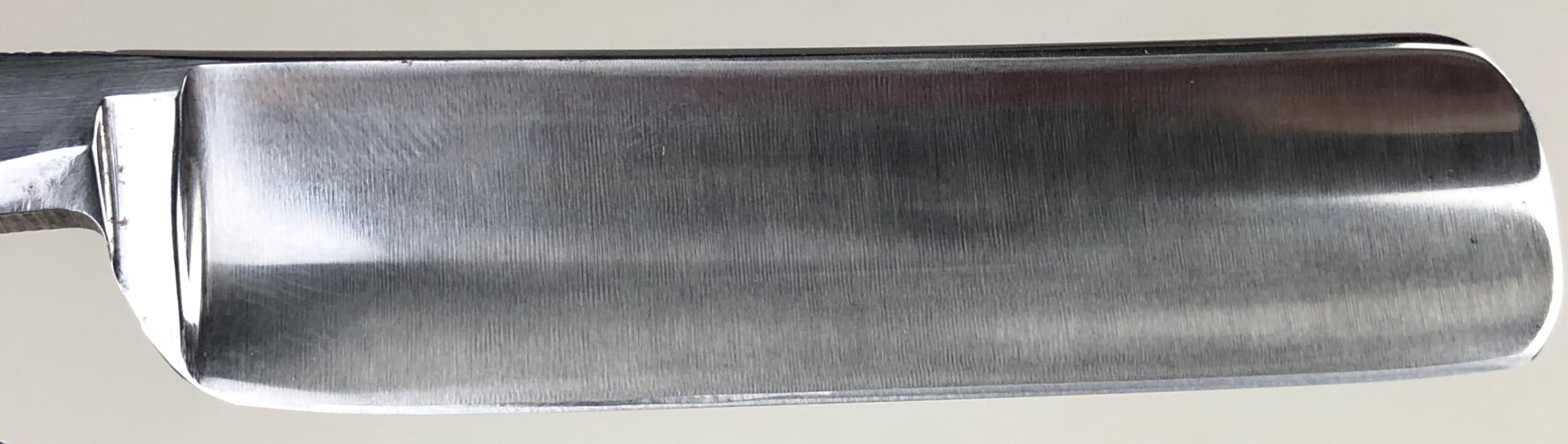 По всей видимости бритва не была в пользовании.Тяжёлый укороченный клинок. Следов от заточных камней на обушке нет и не было.Разобрал бритву, чтобы установить внутренние шайбы, так как без них ручка сильно царапала клинок.Заодно убрал остатки окисления и патины, ну и прошелся косметически по полотну, для порядка. Умеренная полировка.Оригинальные пины удалось заново поставить. Сталь чистая, без дефектов. Кромочка ровненькая по всей длине.Бритва сейчас в состоянии новой.Перед отправкой будет заточена и подготовлена к бритью.