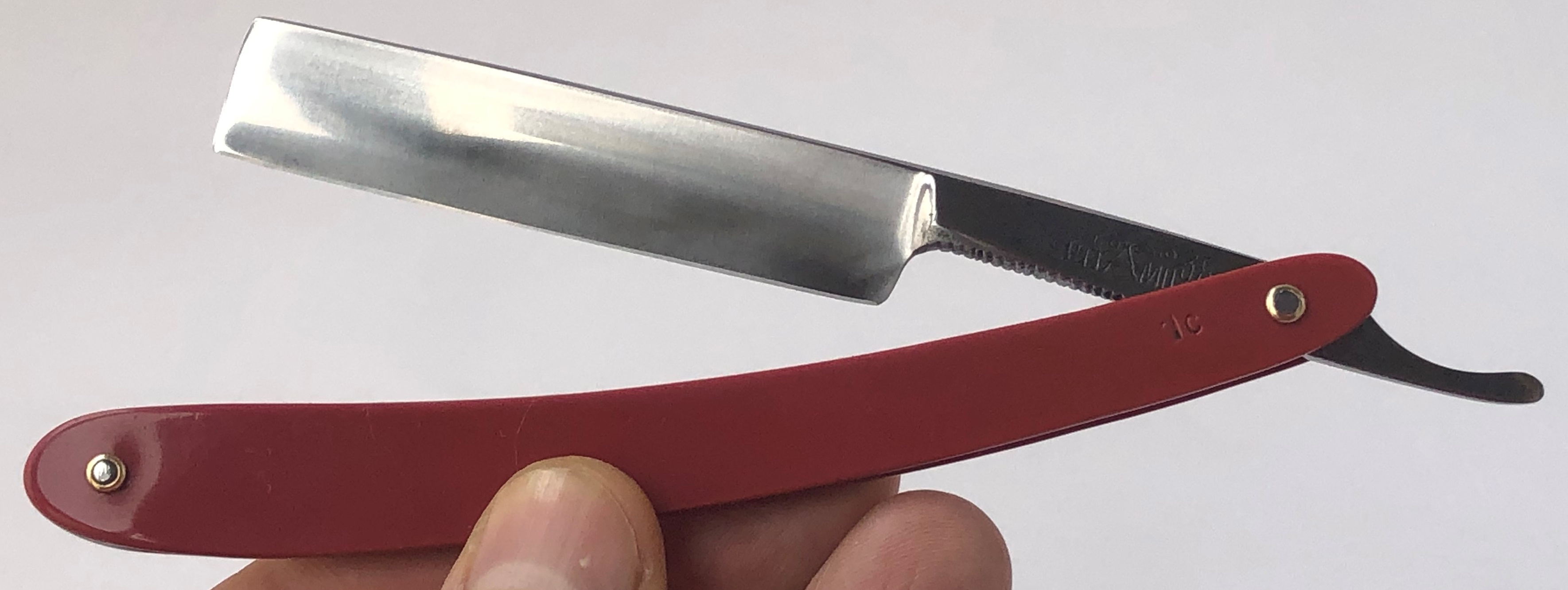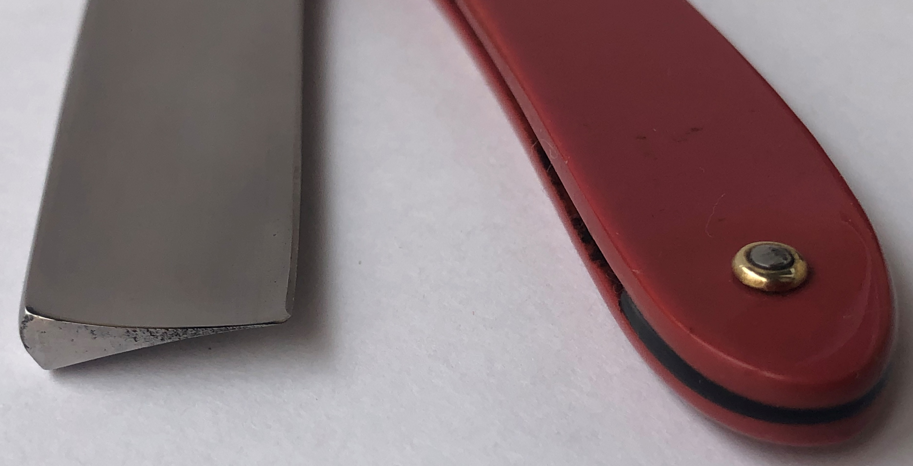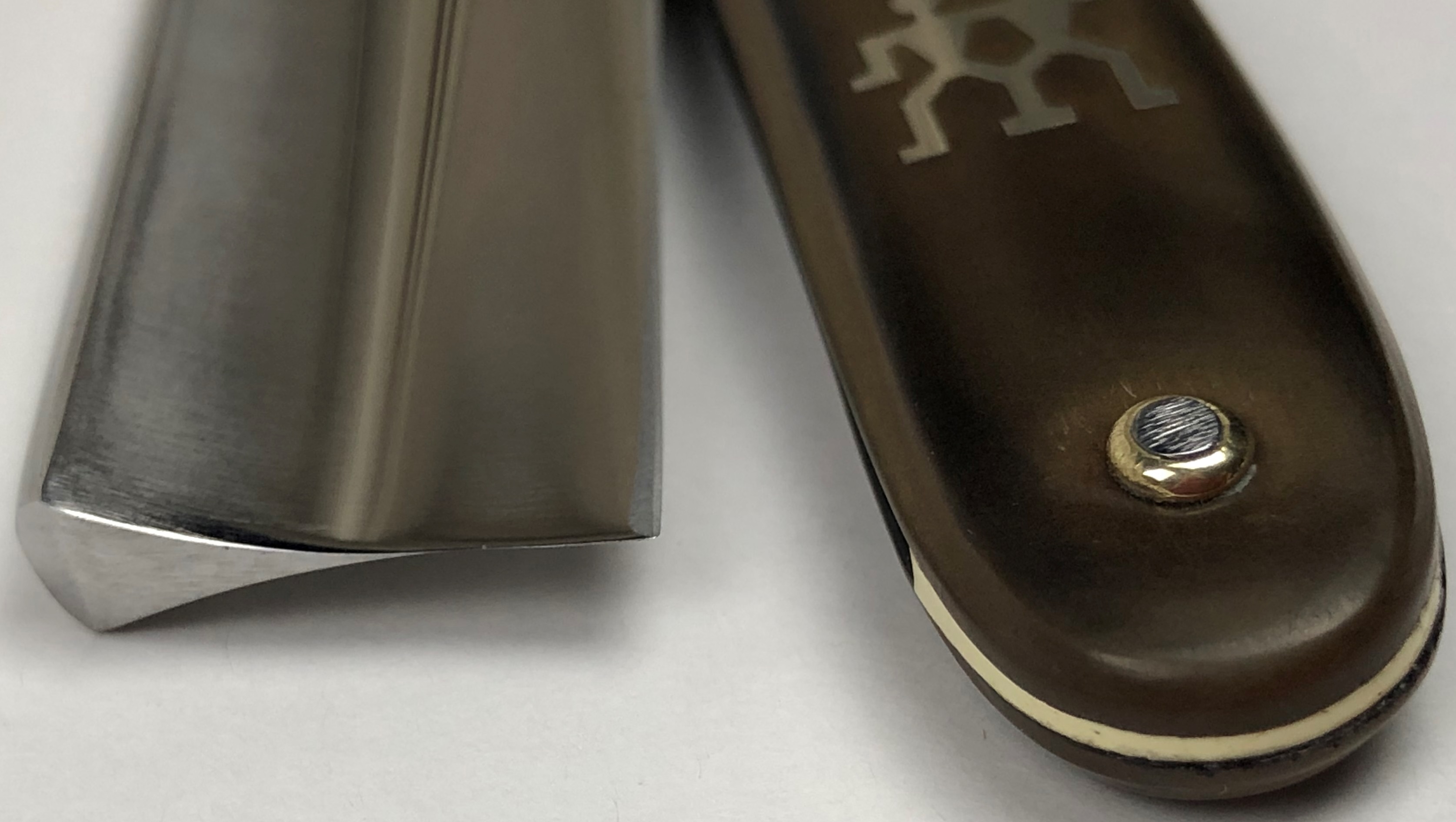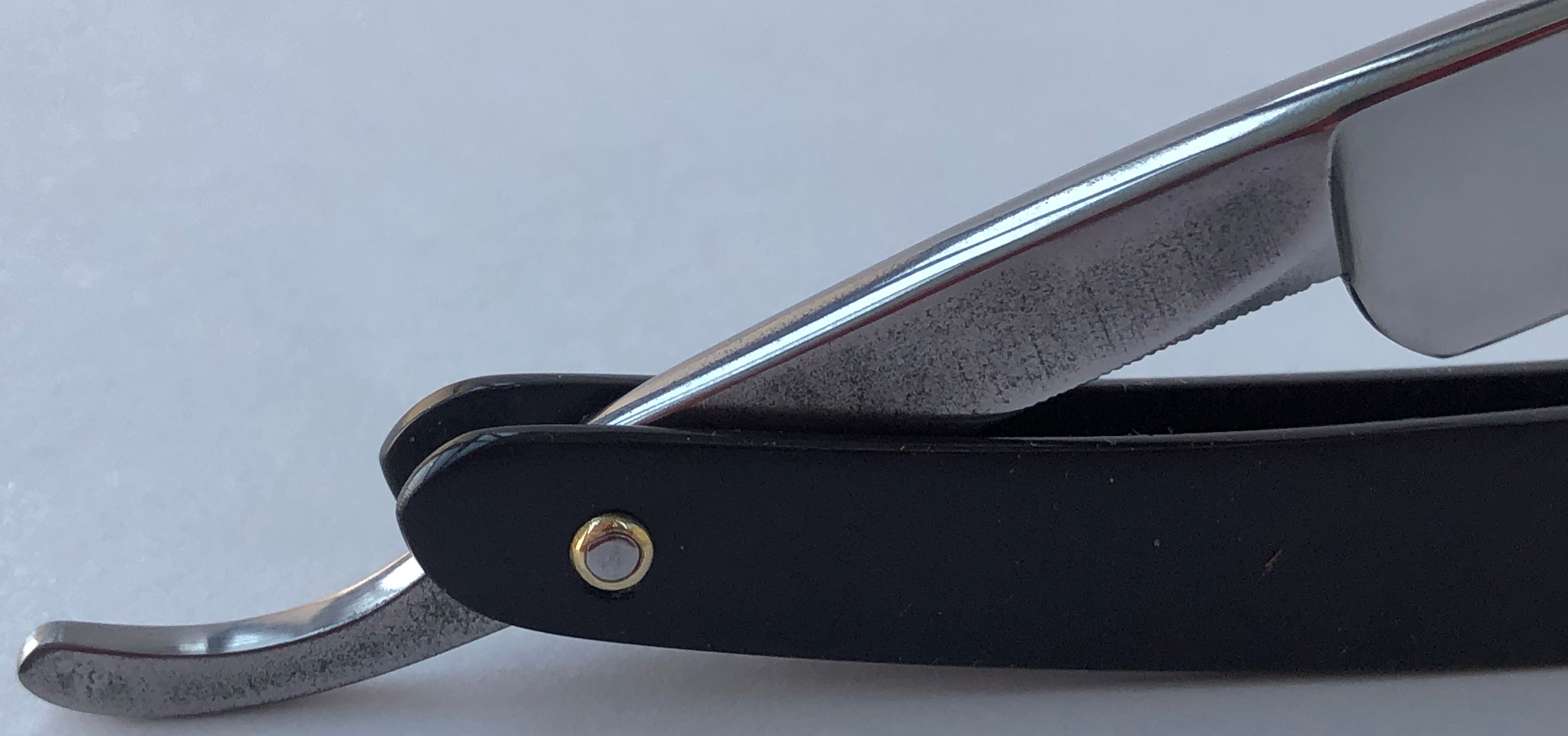 Бритва в пользовании не была.Но пришлось разобрать,чтобы почистить в районе осевого пина. Заодно самую малость освежил само полотно от патины и попробовал повторить "заводской" гринд.Дополнительно поставил внутренние шайбы и поменял оригинальные заклепки на двух-цветные пины.Бритва с виду имеет состояние новой. Идеальная геометрия полотна:кромочка равномерна по всей длине.Качественная сталь способна выдавать чистое и мягкое бритье. Также отличный вариант для новичка. Заточена и готова к бритью.
