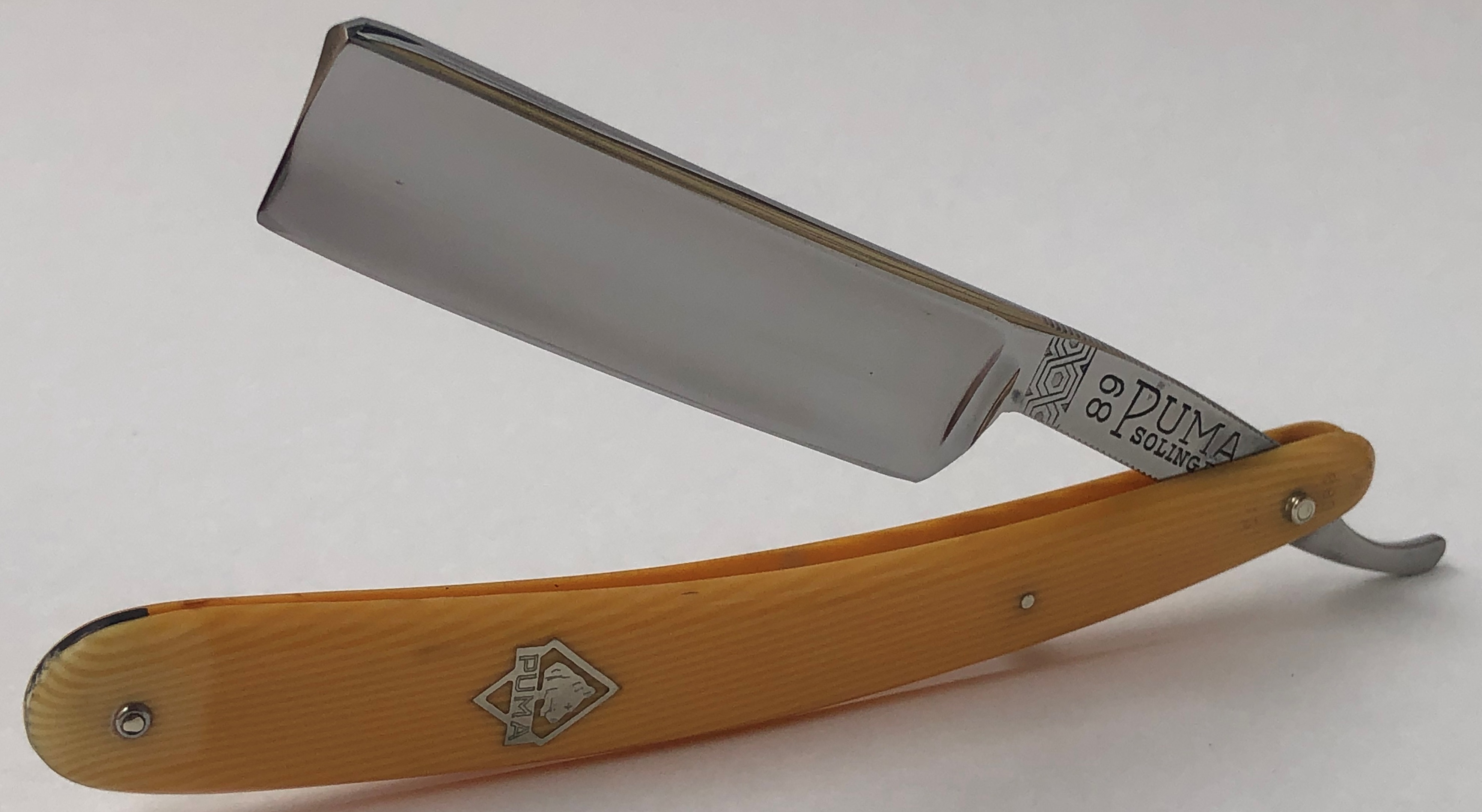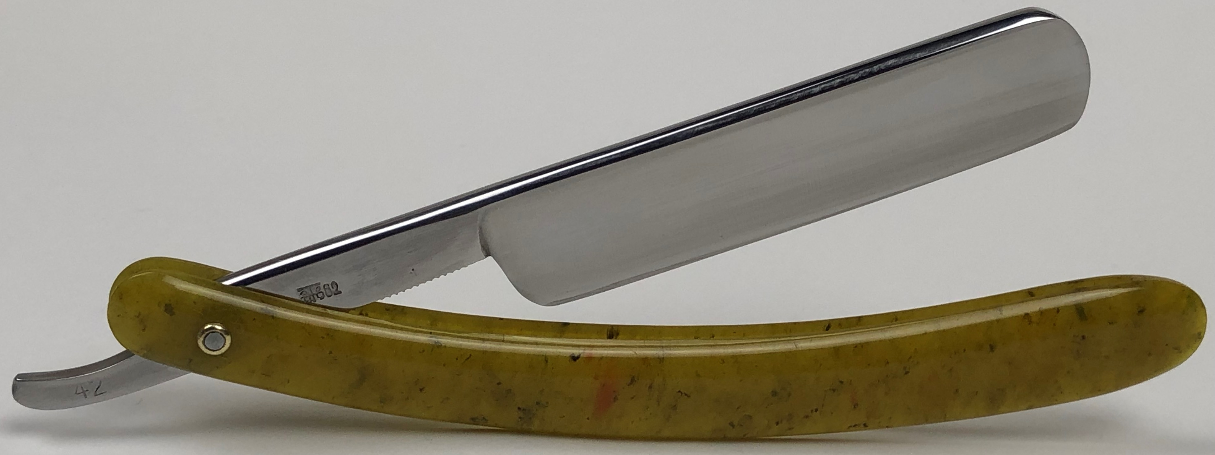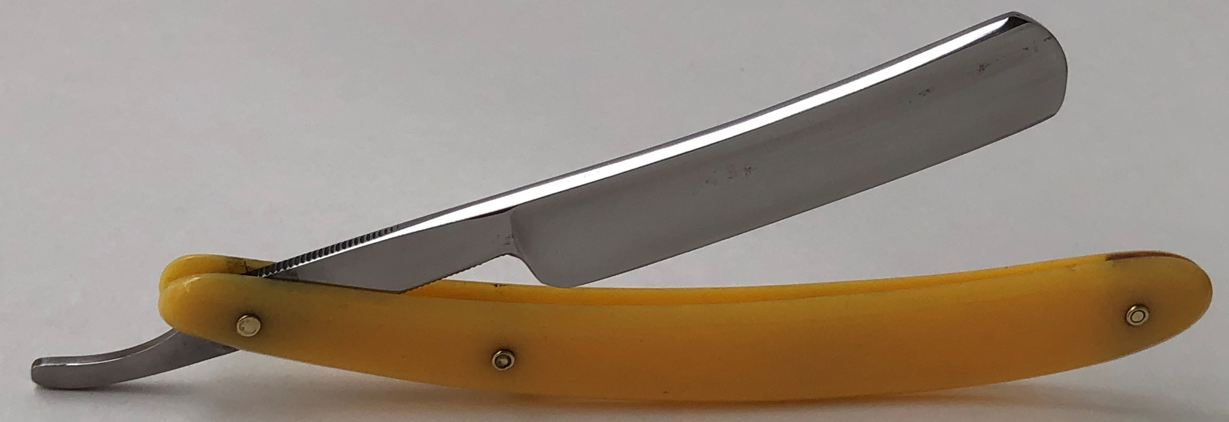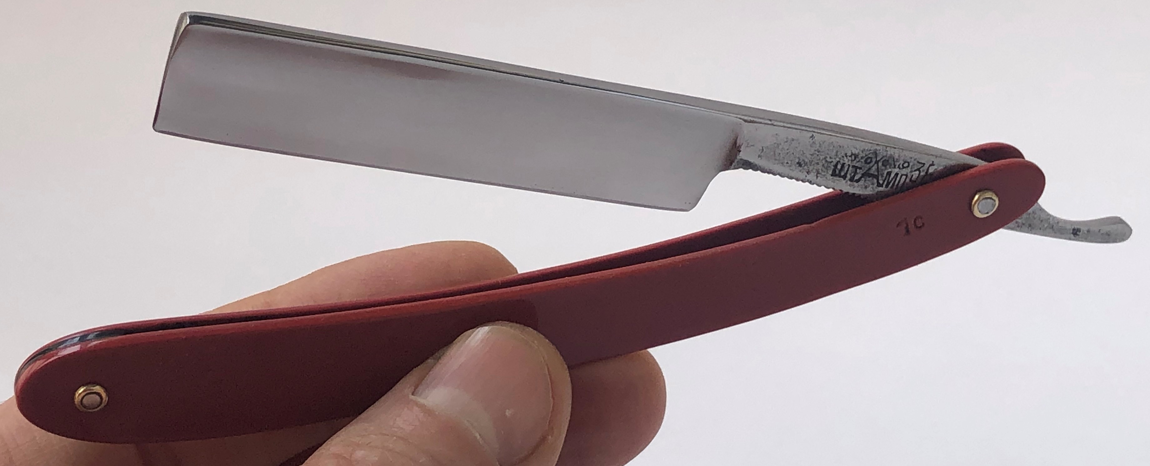 Бритва в пользовании не была.Но пришлось разобрать,чтобы почистить в районе осевого пина. Заодно самую малость освежил само полотно от патины и попробовал повторить "заводской" гринд.Дополнительно поставил внутренние шайбы и поменял оригинальные заклепки на двух-цветные пины.Бритва с виду имеет состояние новой. Идеальная геометрия полотна:кромочка равномерна по всей длине.Качественная сталь способна выдавать чистое и мягкое бритье. Также отличный вариант для новичка. Заточена и готова к бритью.