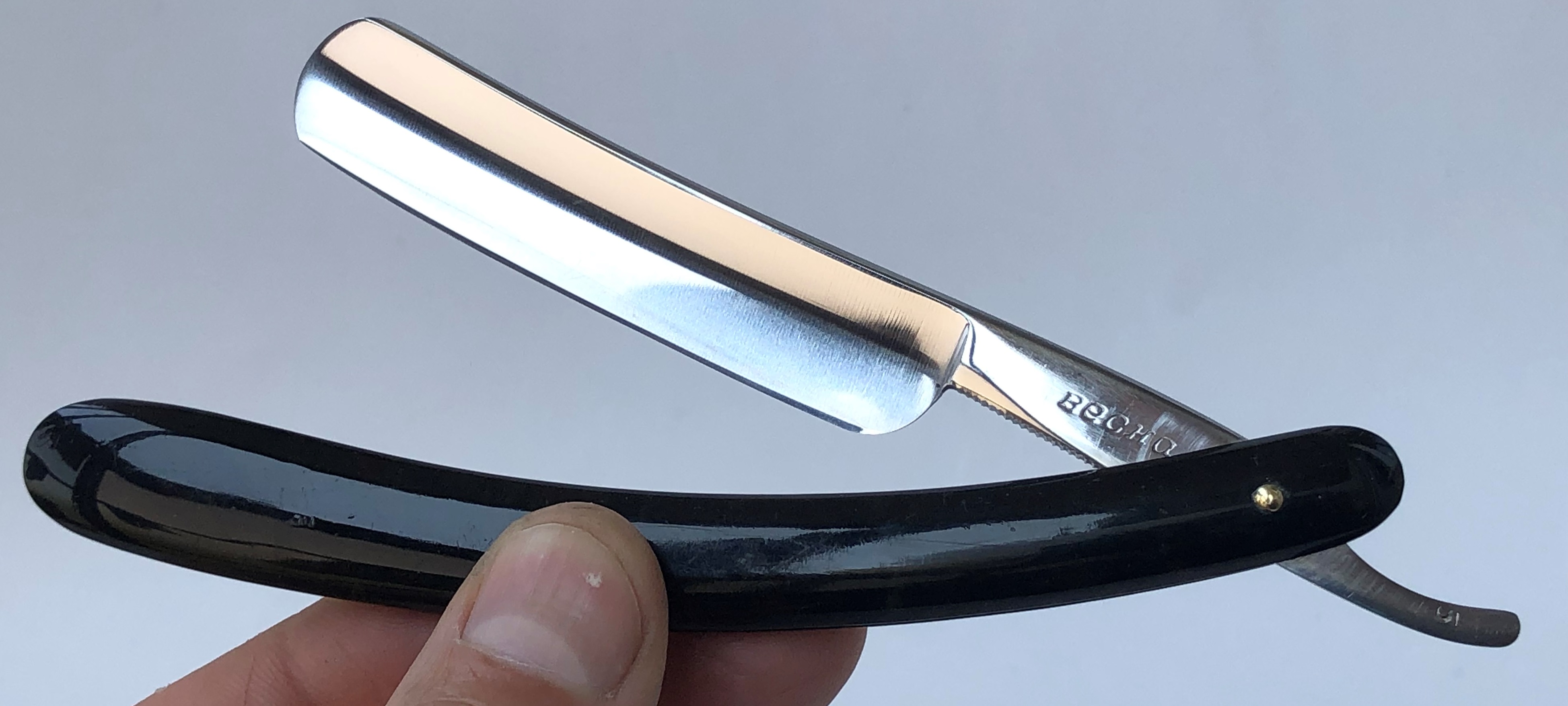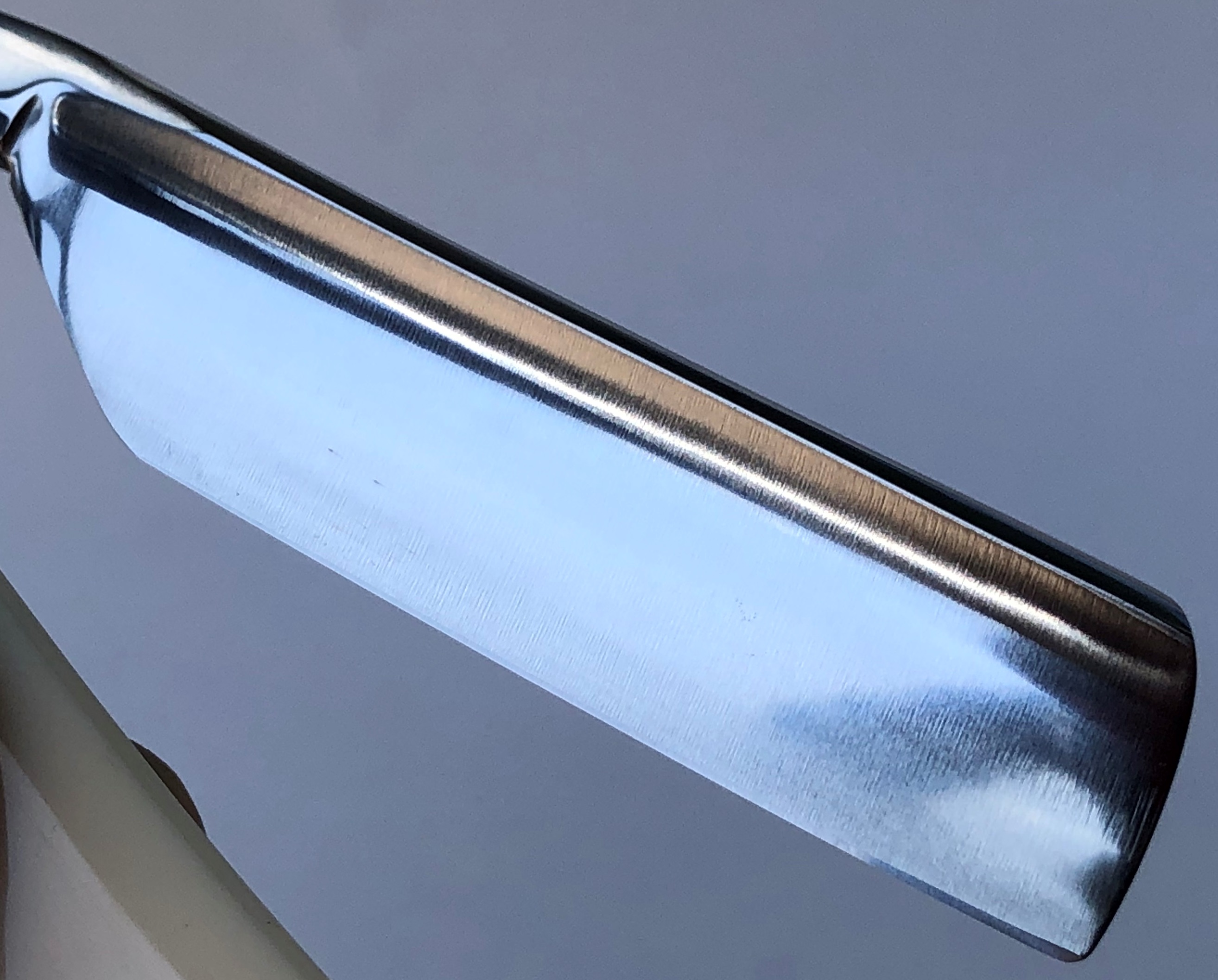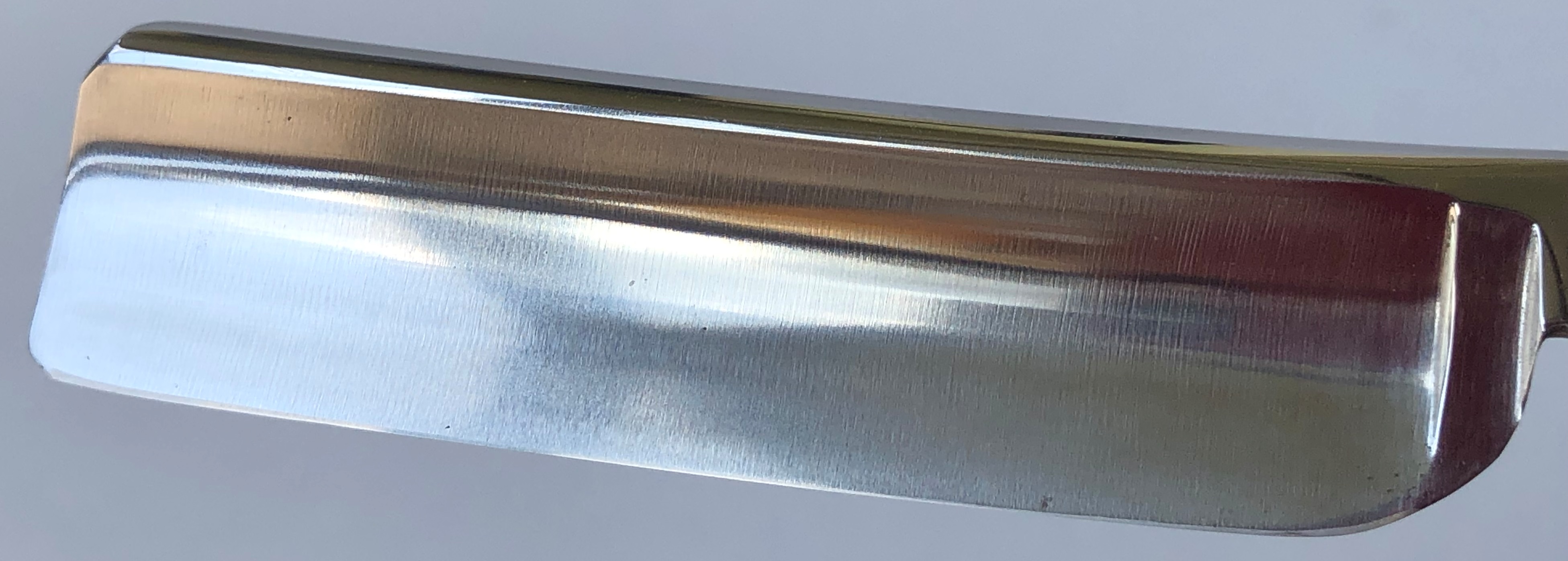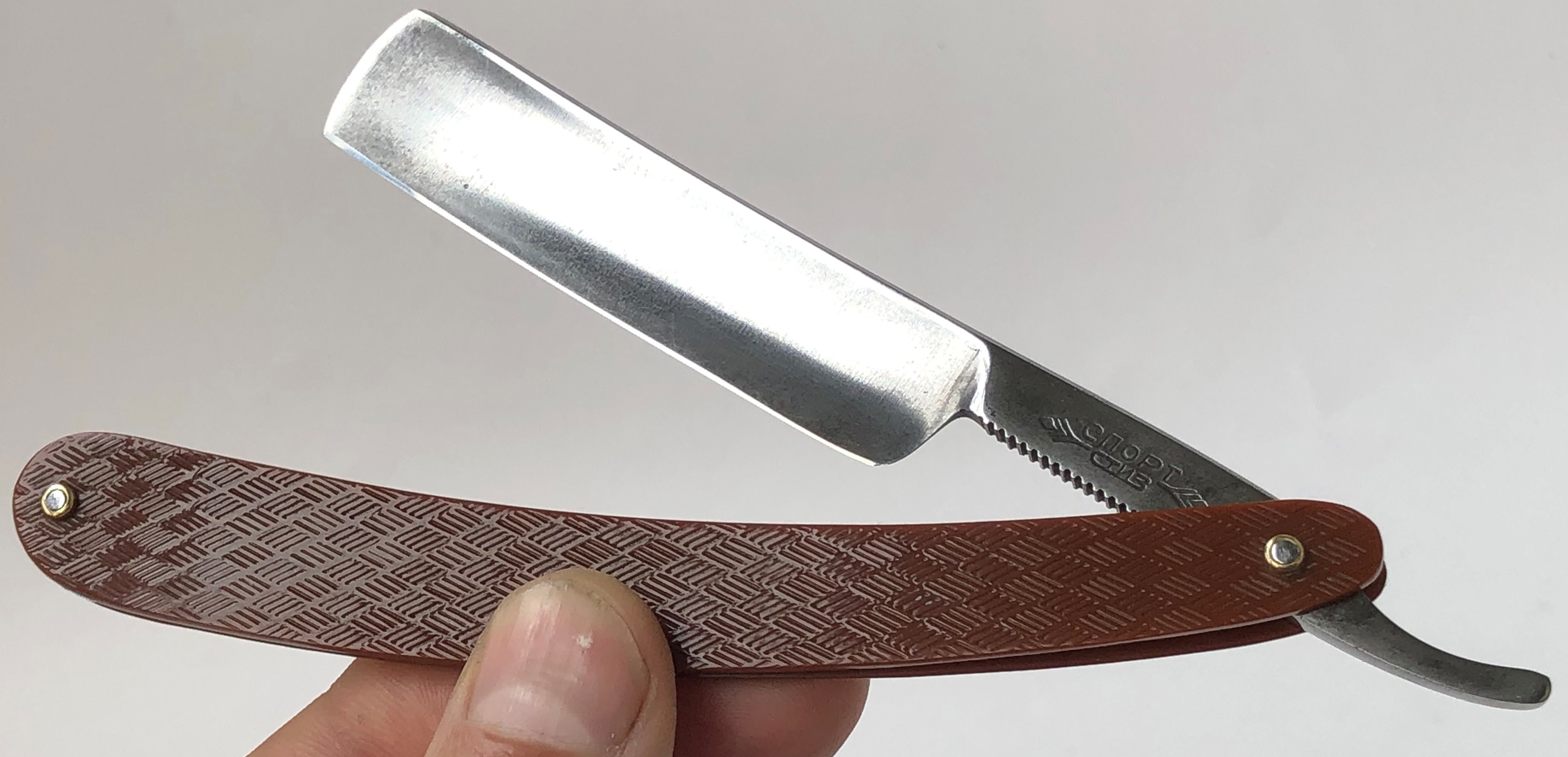 Бритва без следов пользования,но пришлось разобрать, для удаления следов окисления в районе осевого пина.Заменил медную заклепку на двух-цветную втулку,а также добавил внутренние шайбы.Заводская шлифовка и полировка полотна. Идеальная геометрия:кромочка равномерна по всей длине полотна.Очень хороший и недорогой вариант для новичка..
