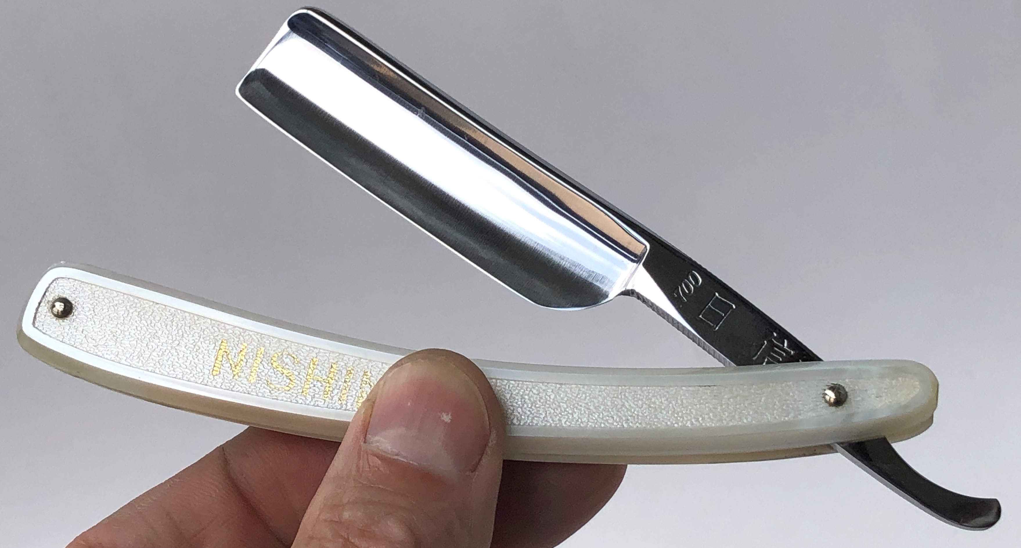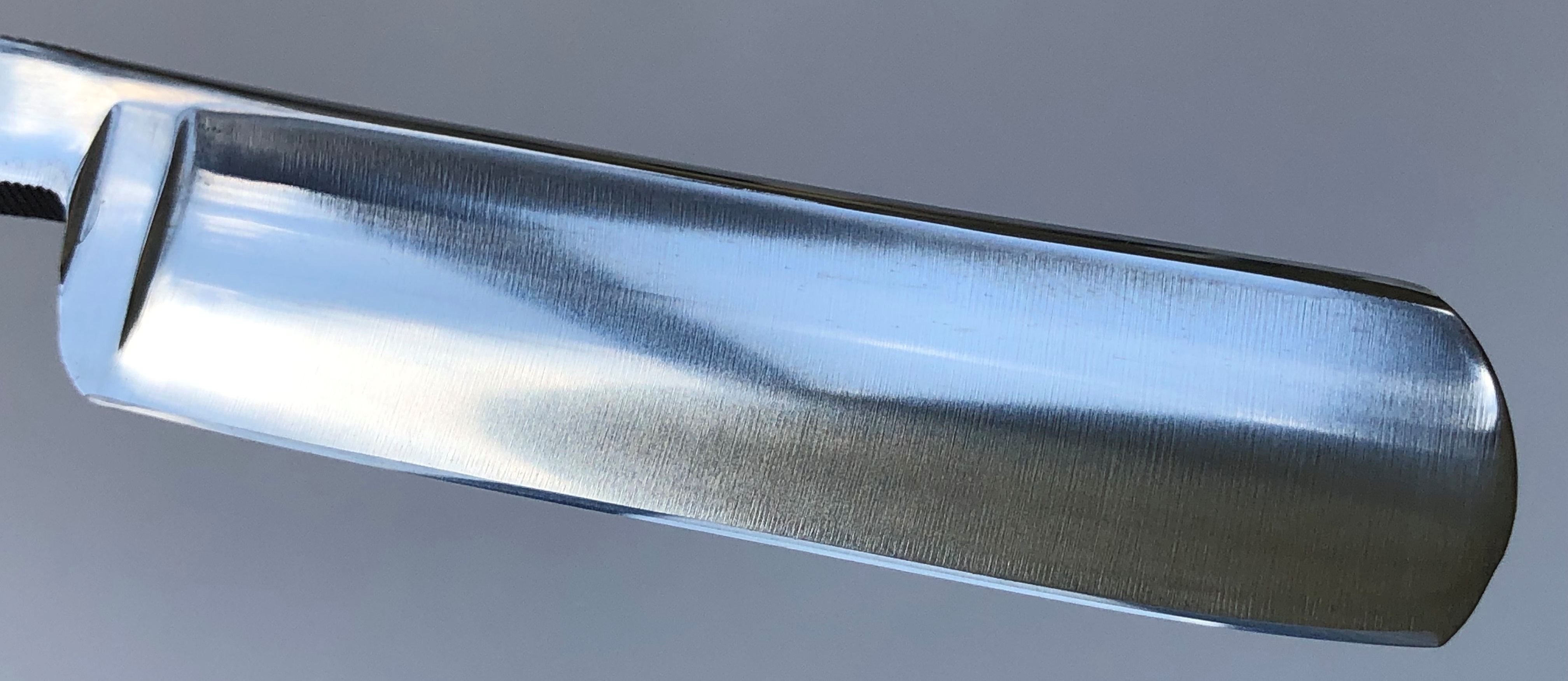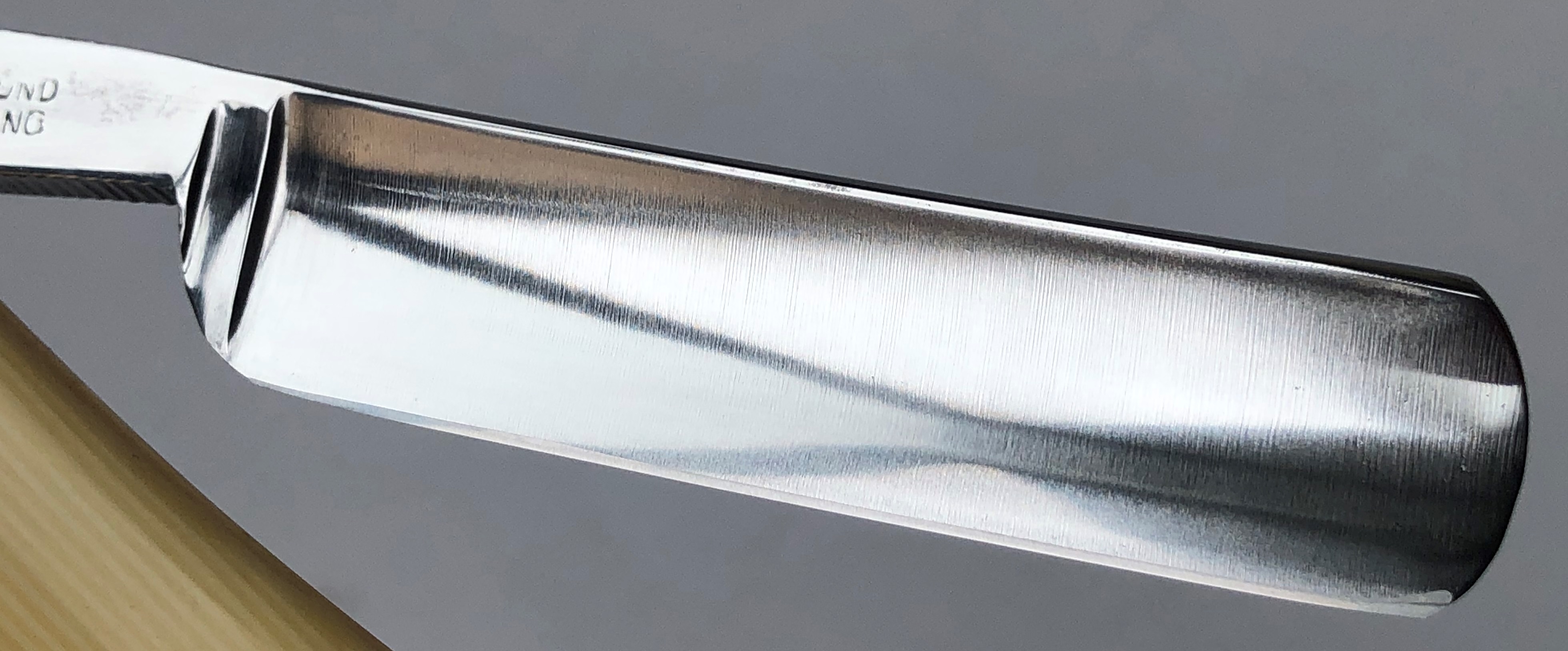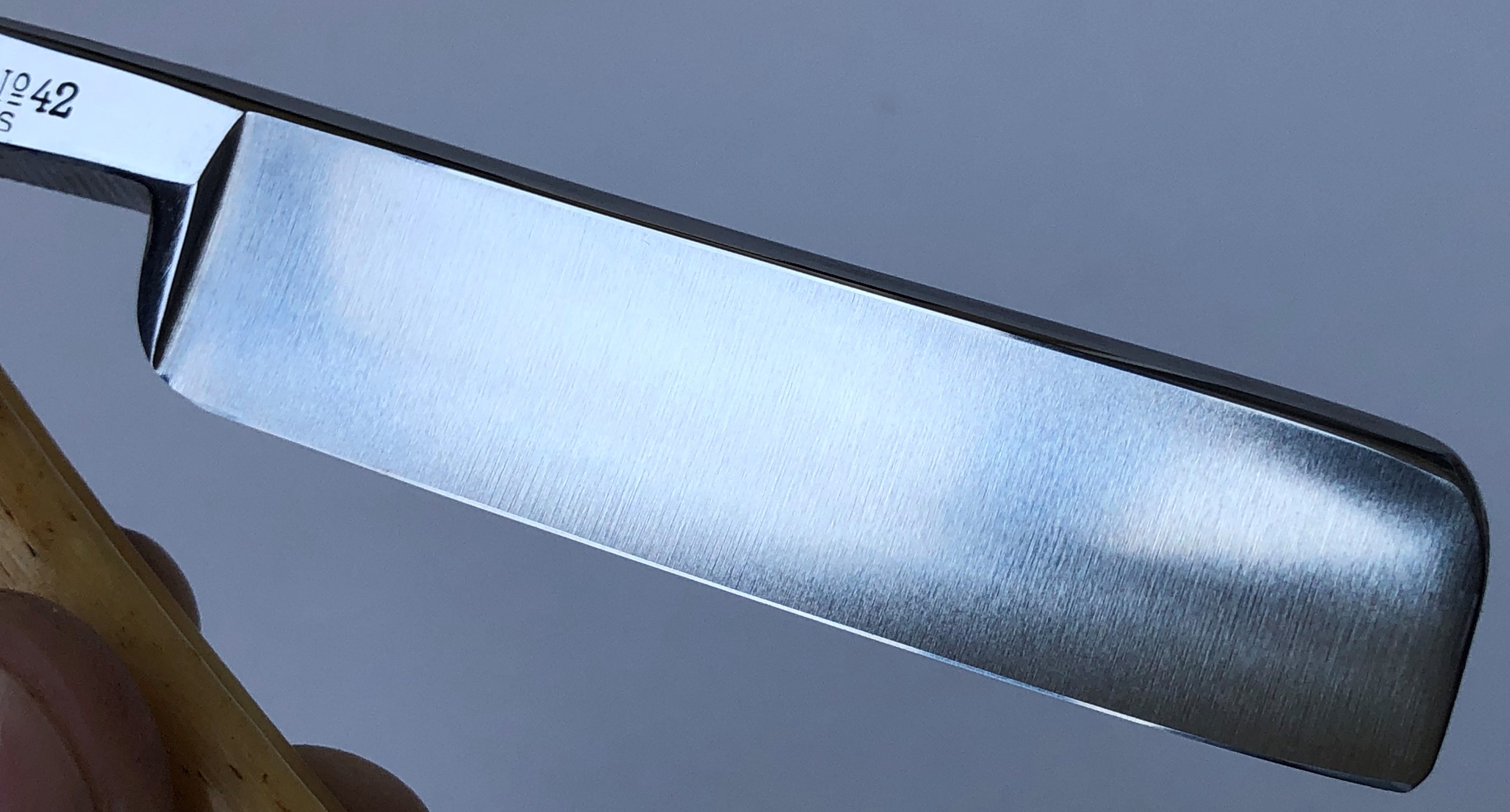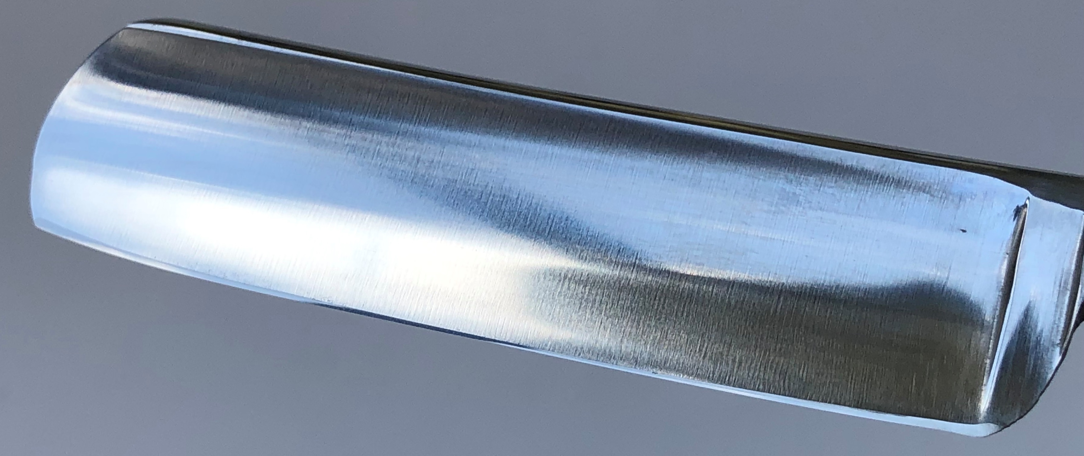 Бритва без следов пользования,но пришлось разобрать, для удаления следов окисления в районе осевого пина.Заменил медную заклепку на двух-цветную втулку,а также добавил внутренние шайбы.Заводская шлифовка и полировка полотна. Идеальная геометрия:кромочка равномерна по всей длине полотна.Очень хороший и недорогой вариант для новичка..