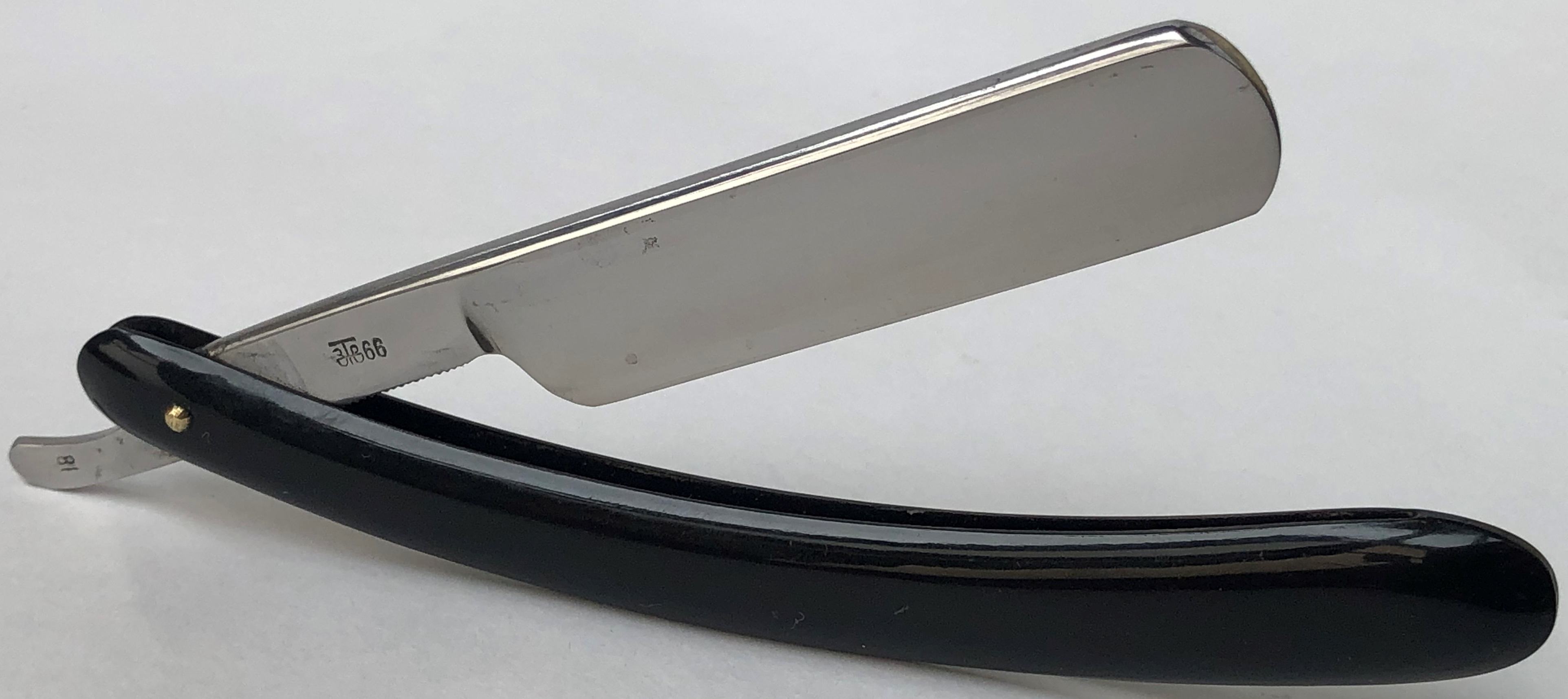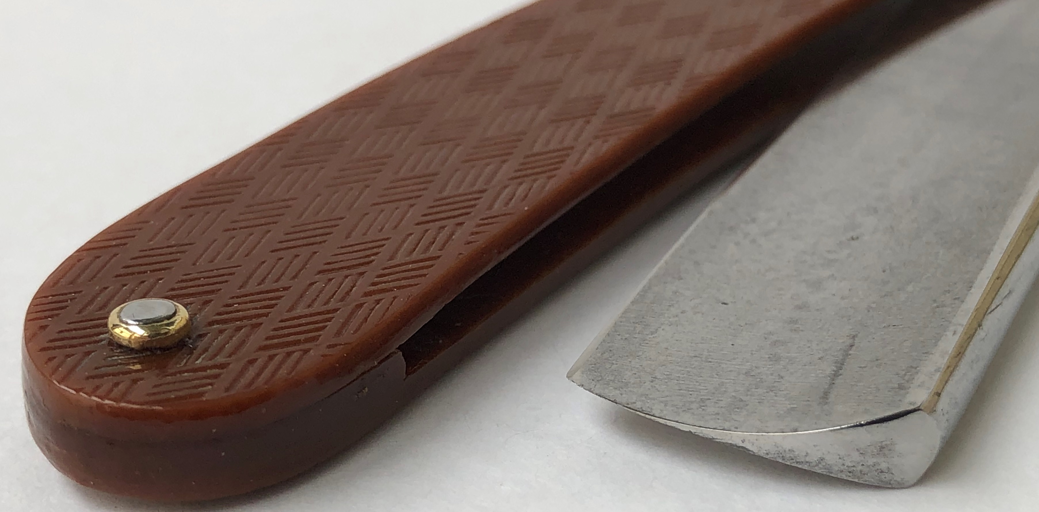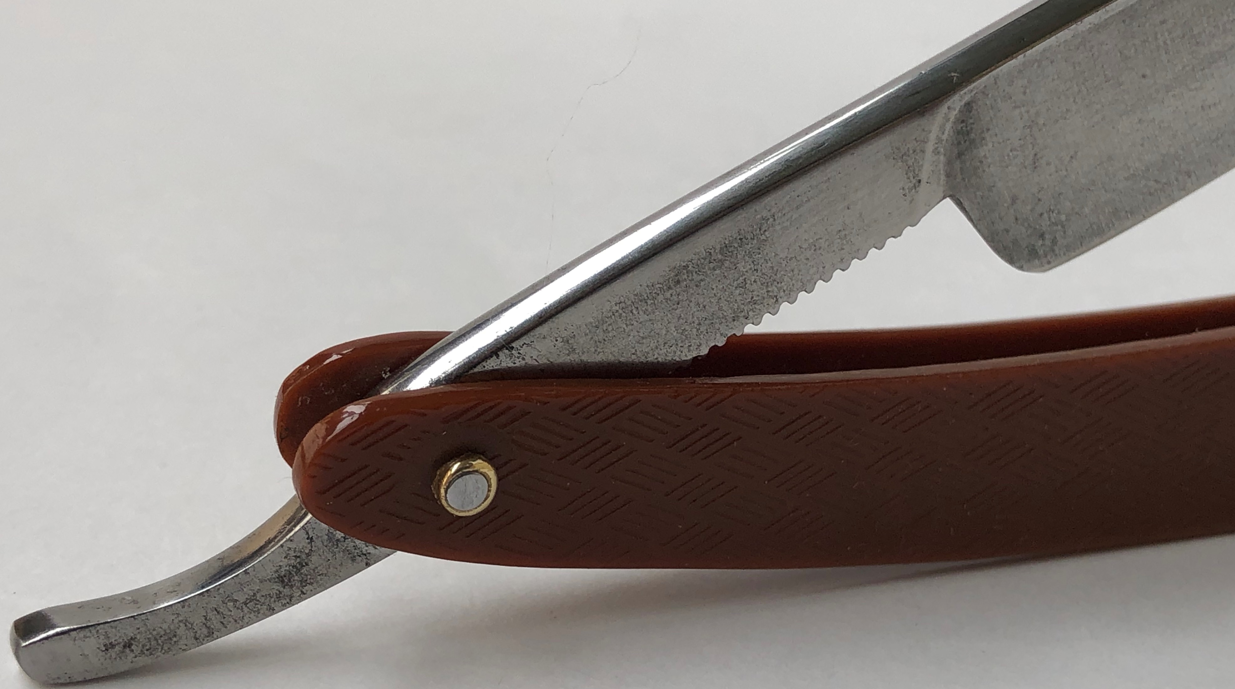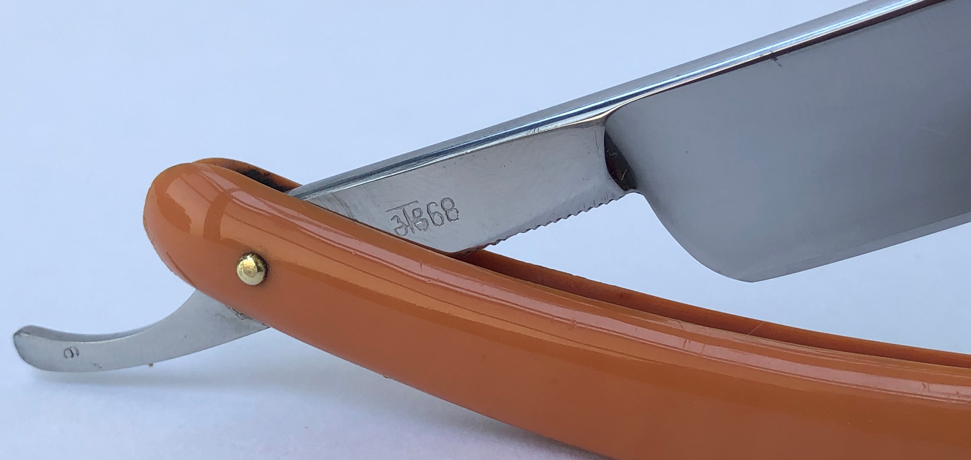 Довольно редко встречающаяся модель бритвы.Хочу обратить внимание, что форма лезвия является оригинальной, а не следствие каких то работ.(За 13 лет попадается третья и везде форма клинка была такая же).Если мне не изменяет память, то это единственная модель Хенка, с таким "гранёным" обушком.
