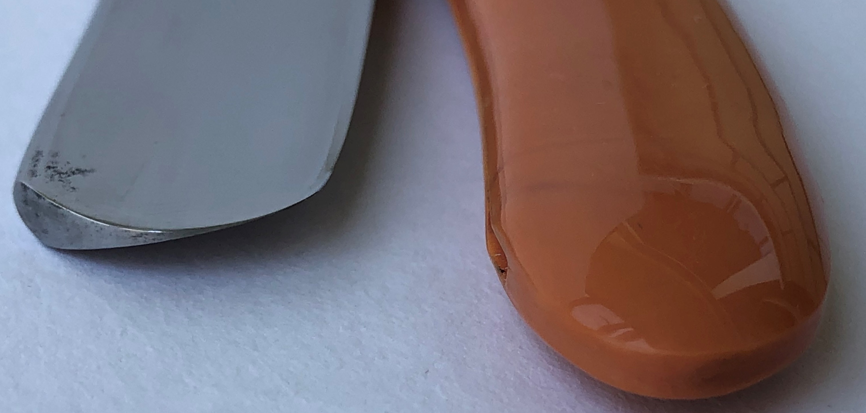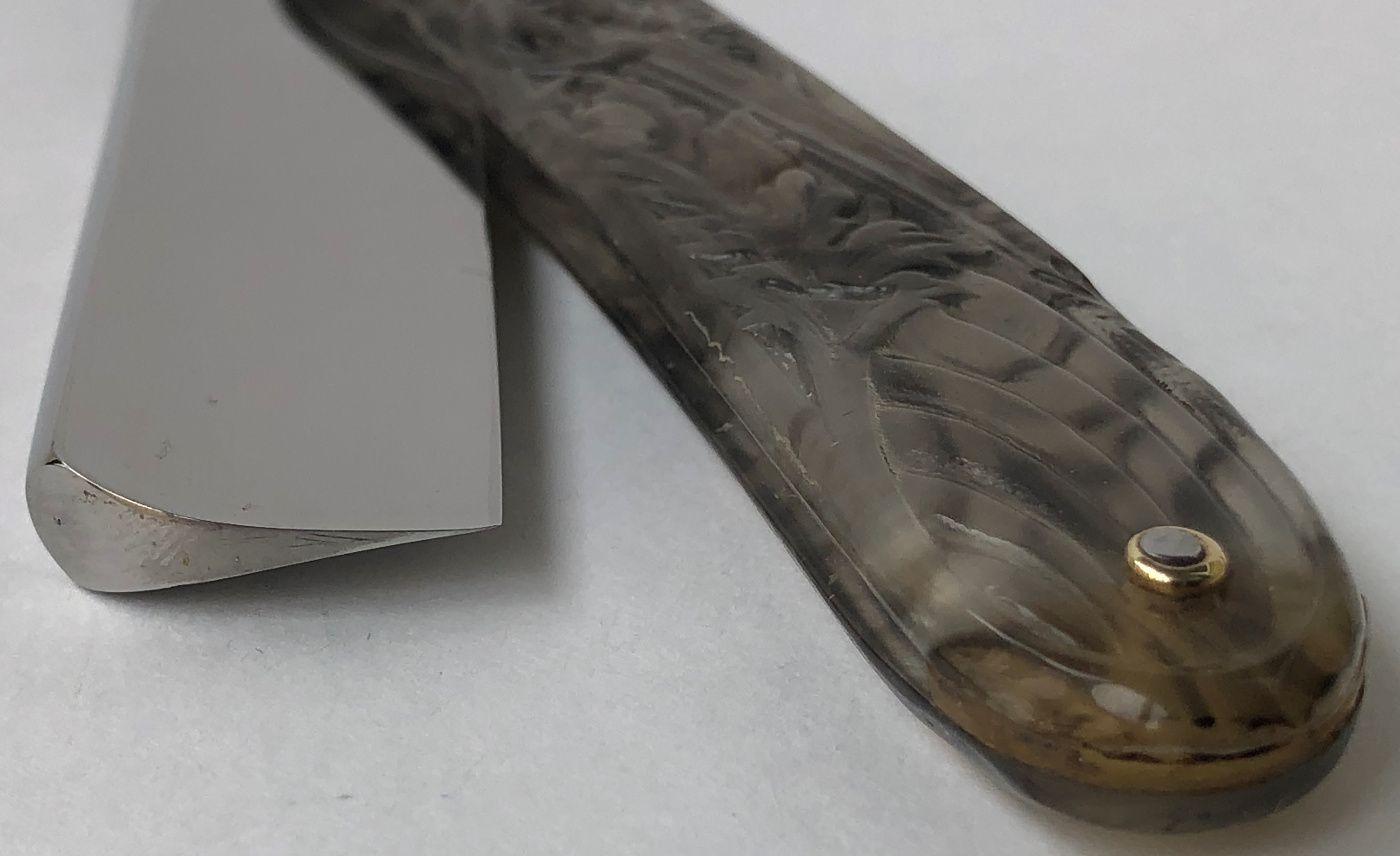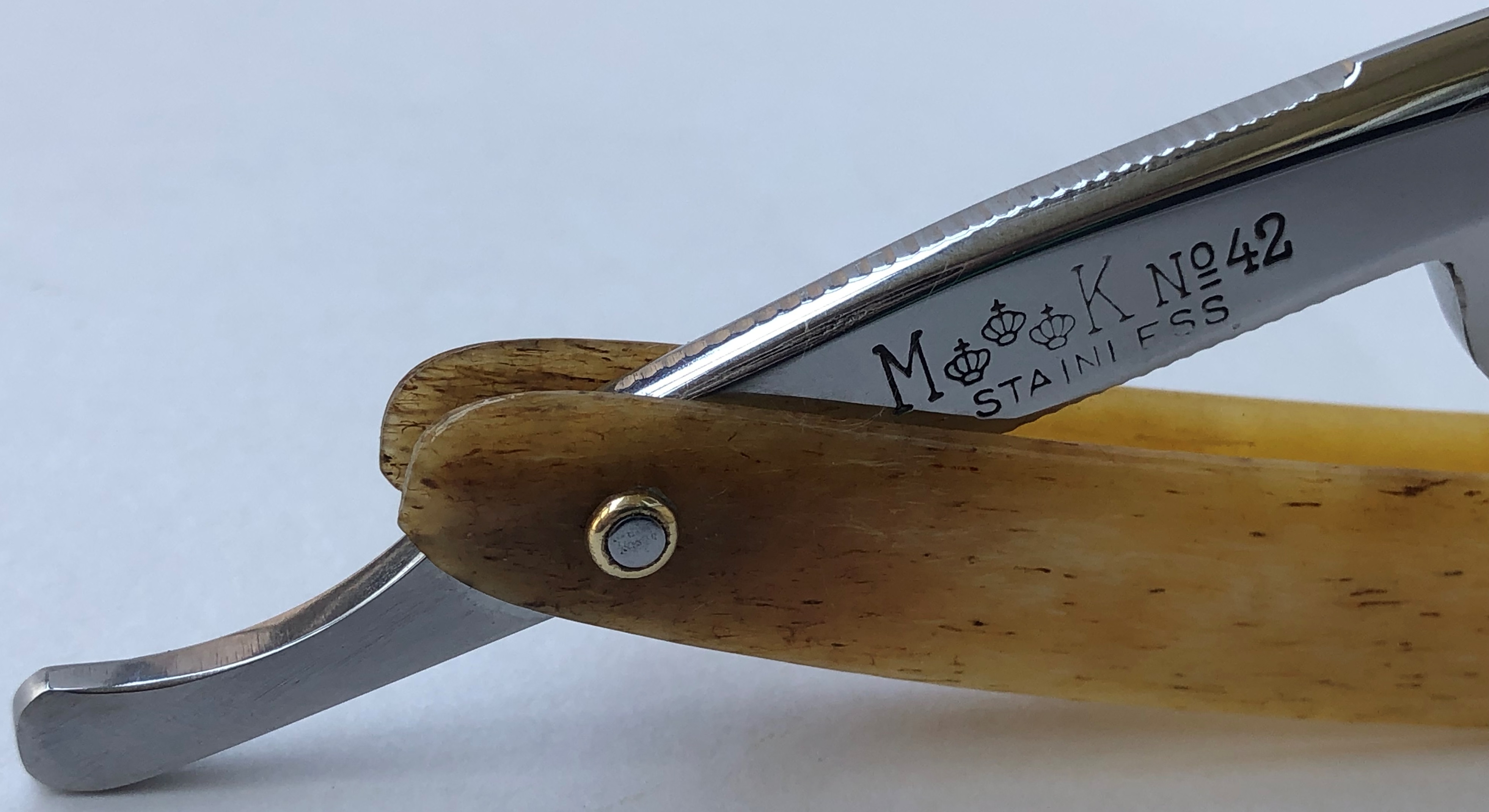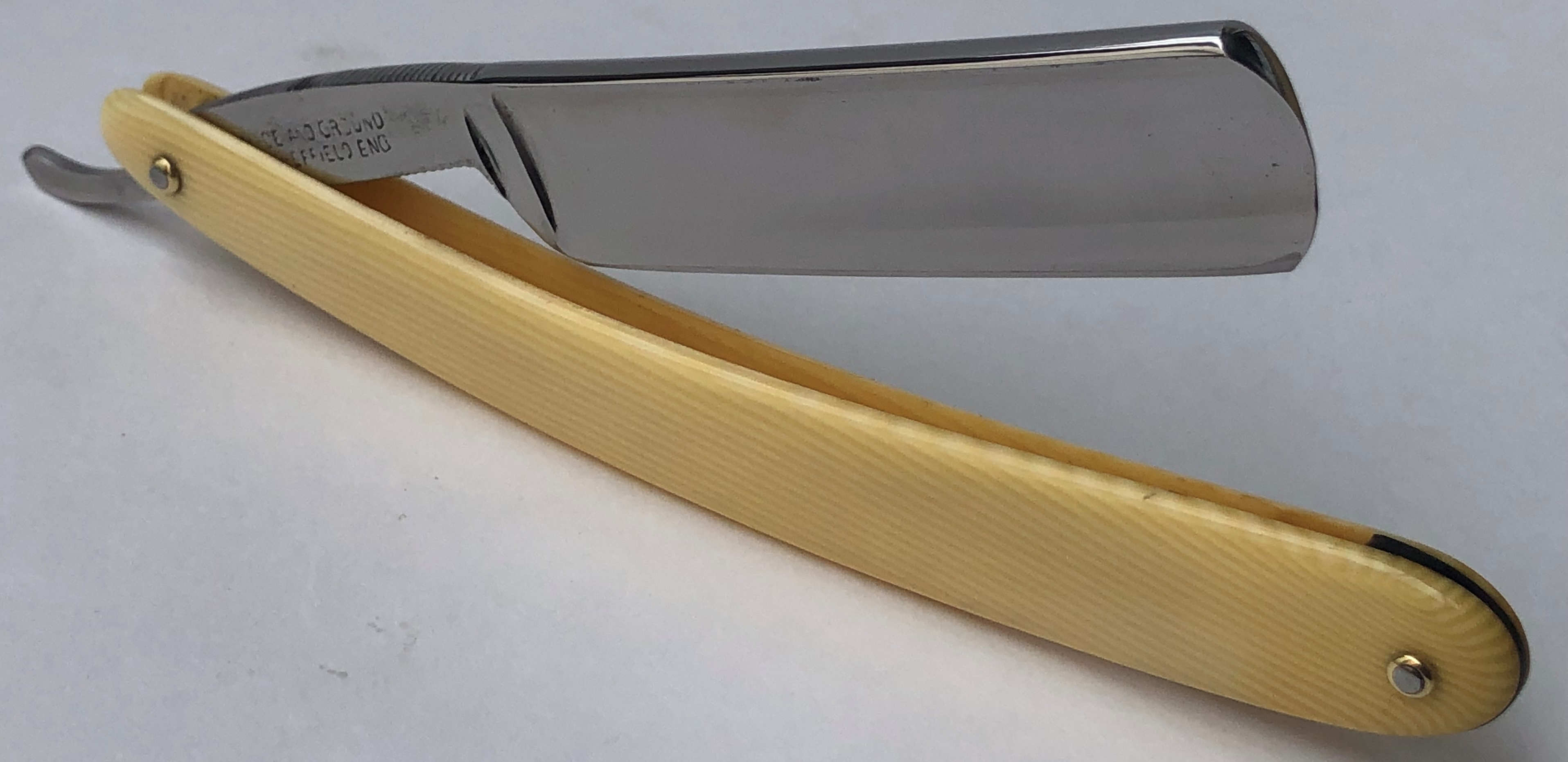 Довольно редко встречающаяся модель бритвы.Хочу обратить внимание, что форма лезвия является оригинальной, а не следствие каких то работ.(За 13 лет попадается третья и везде форма клинка была такая же).Если мне не изменяет память, то это единственная модель Хенка, с таким "гранёным" обушком.