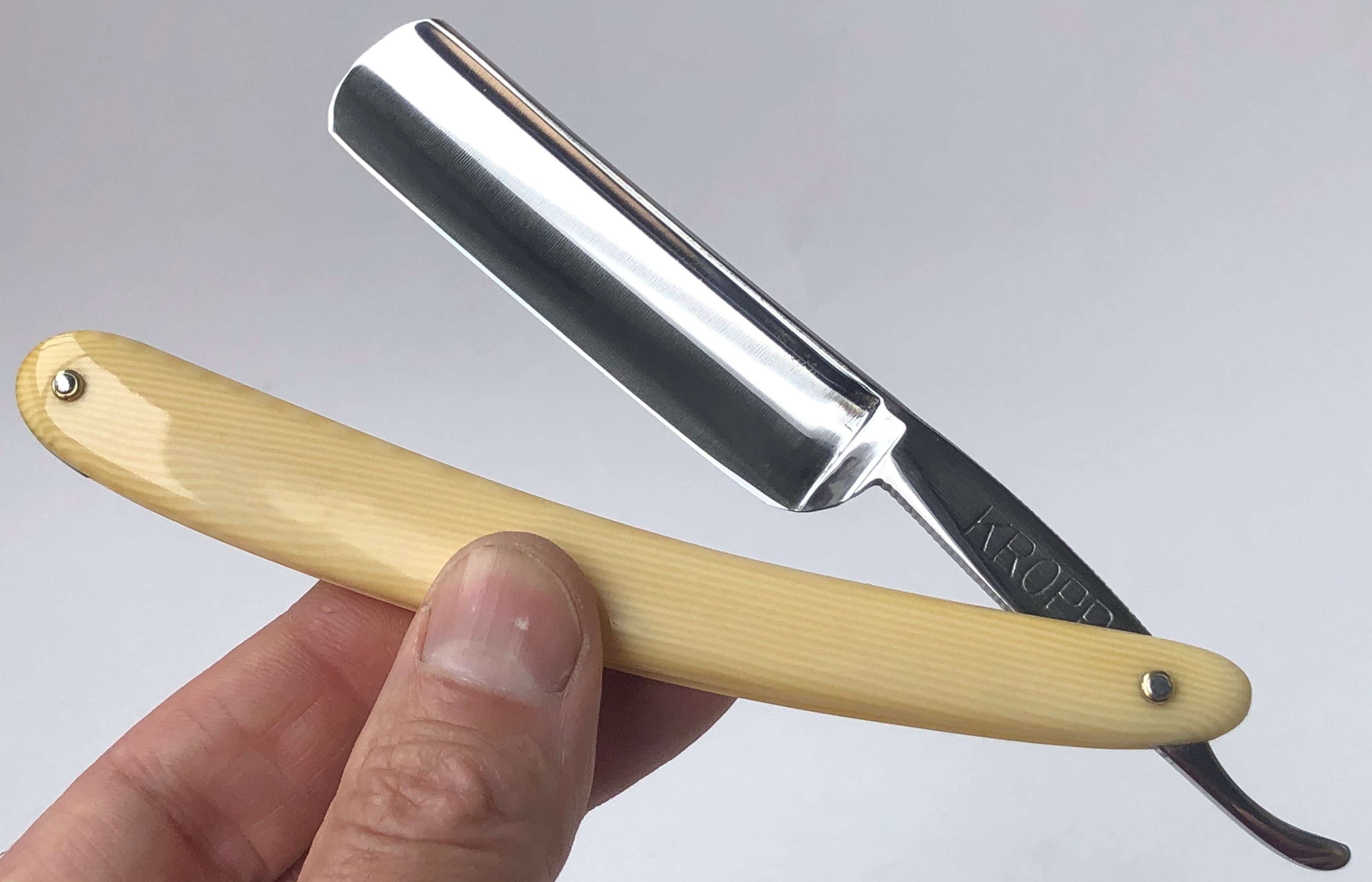 Бритва без следов пользования и находится в очень хорошем состоянии.Была разобрана, для проведения минимальных косметических работ.Умеренная полировка.Замена пинов на двух-цветные втулки.Штамп на обратной стороне эрля недостаточно пробит, а не результат избыточной шлифовки.Идеальная геометрия полотна.Кромочка равномерна по всей длине.Заточена и готова к бритью. Отличный вариант для новичка и для любого пользователя.(много лет назад именно KROPP была моей первой бритвой  ).