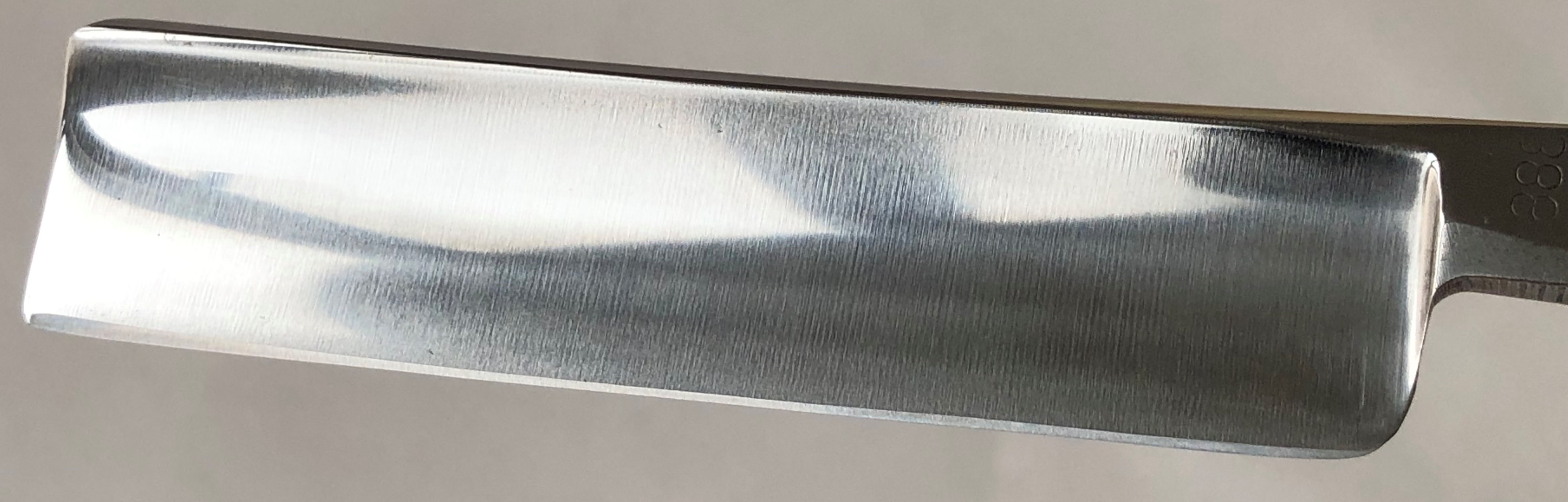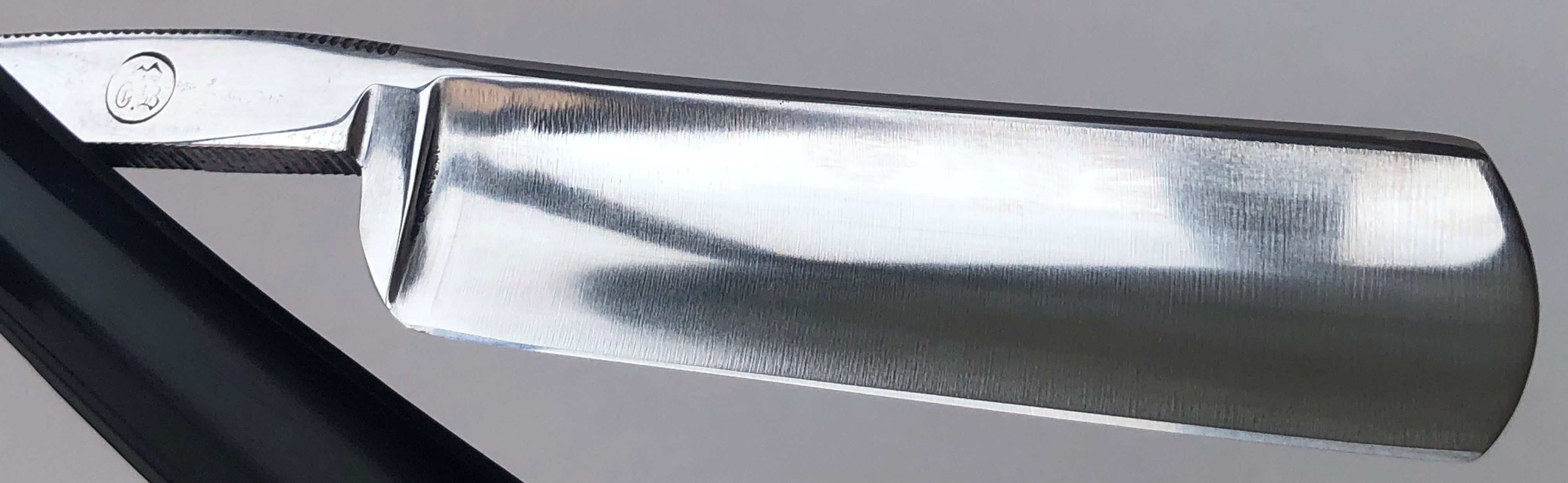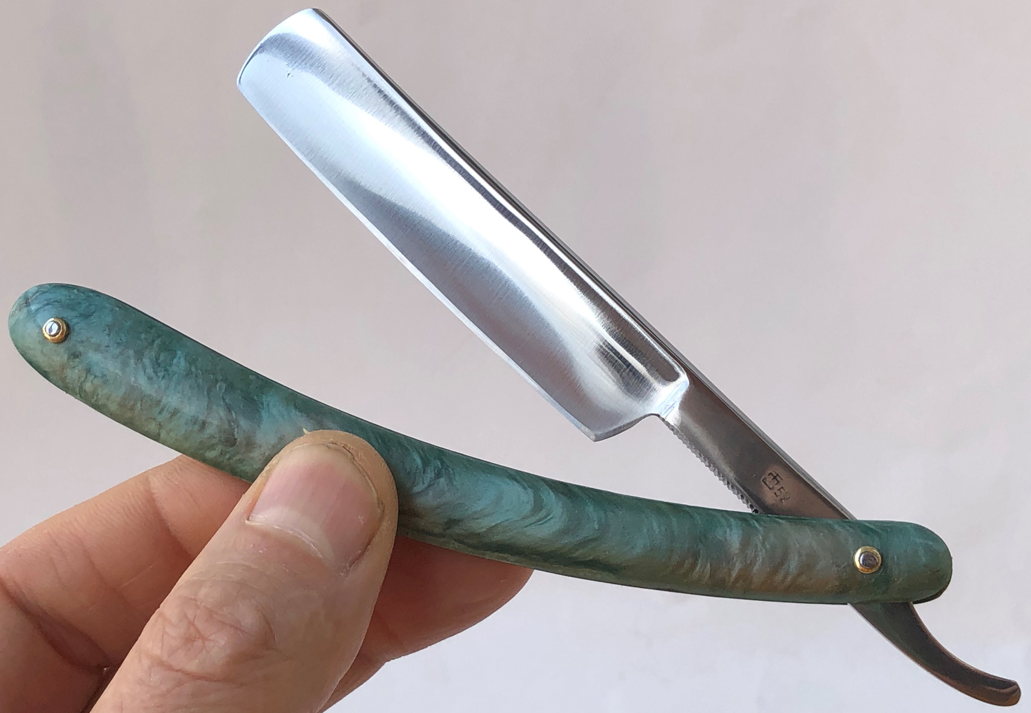Бритва в пользовании не была, но необходимо было произвести минимальные, косметические работы.Идеальная геометрия полотна:кромочка равномерна по всей длине и еле заметна. (Трещина оправы в районе нижнего пина была намертво и надежно проклеена. Отшлифована и отполирована.Практически незаметно). Неестественная для традиционных японских евро бритв форма лезвия.Скорее похода на англичанку начала 20-го века. Что характерно, сталь (как мне показалось) несколько мягче, чем на обычных японцах. В связи с этим бритье очень напомнило именно бритье старинными английскими бритвами:приятный "шелест" сбриваемой щетины.Мягкое и комфортное бритье. Отличный вариант для новичка. Не пропустите!