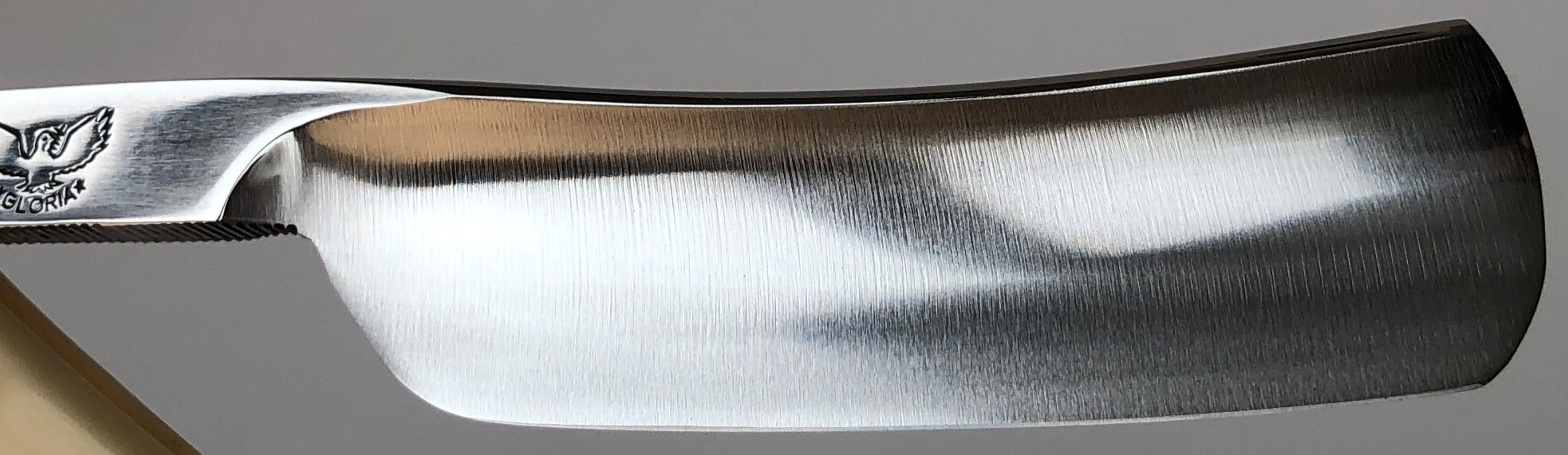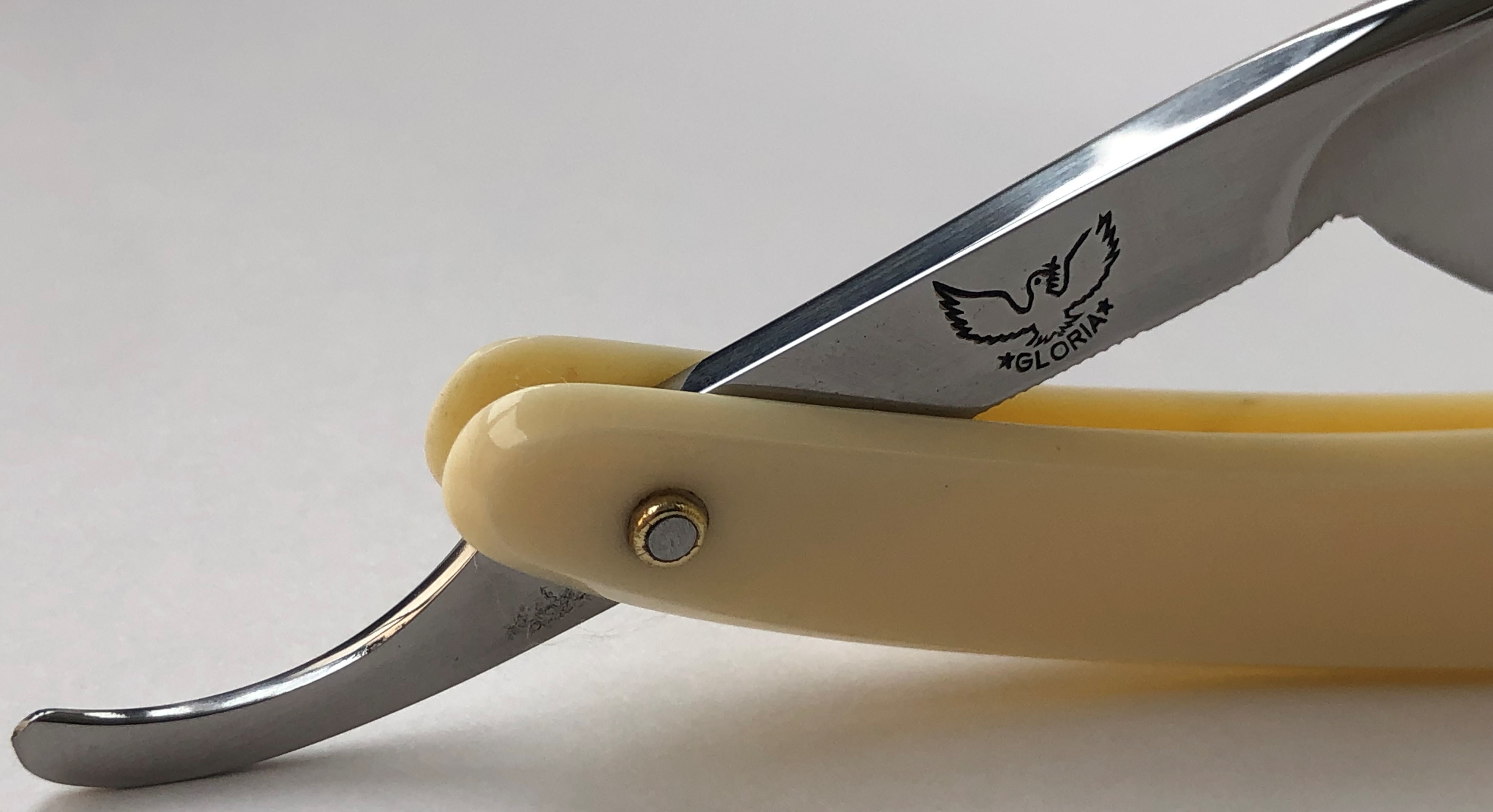 Японская укороченная ,"улыбчатая" бритва GLORIA.,Судя по информации Фикиры с его сайта,бренд ГЛОРИЯ принадлежал легендарной фирме RIBBON,производившей профессиональный инструмент для парикмахеров.
