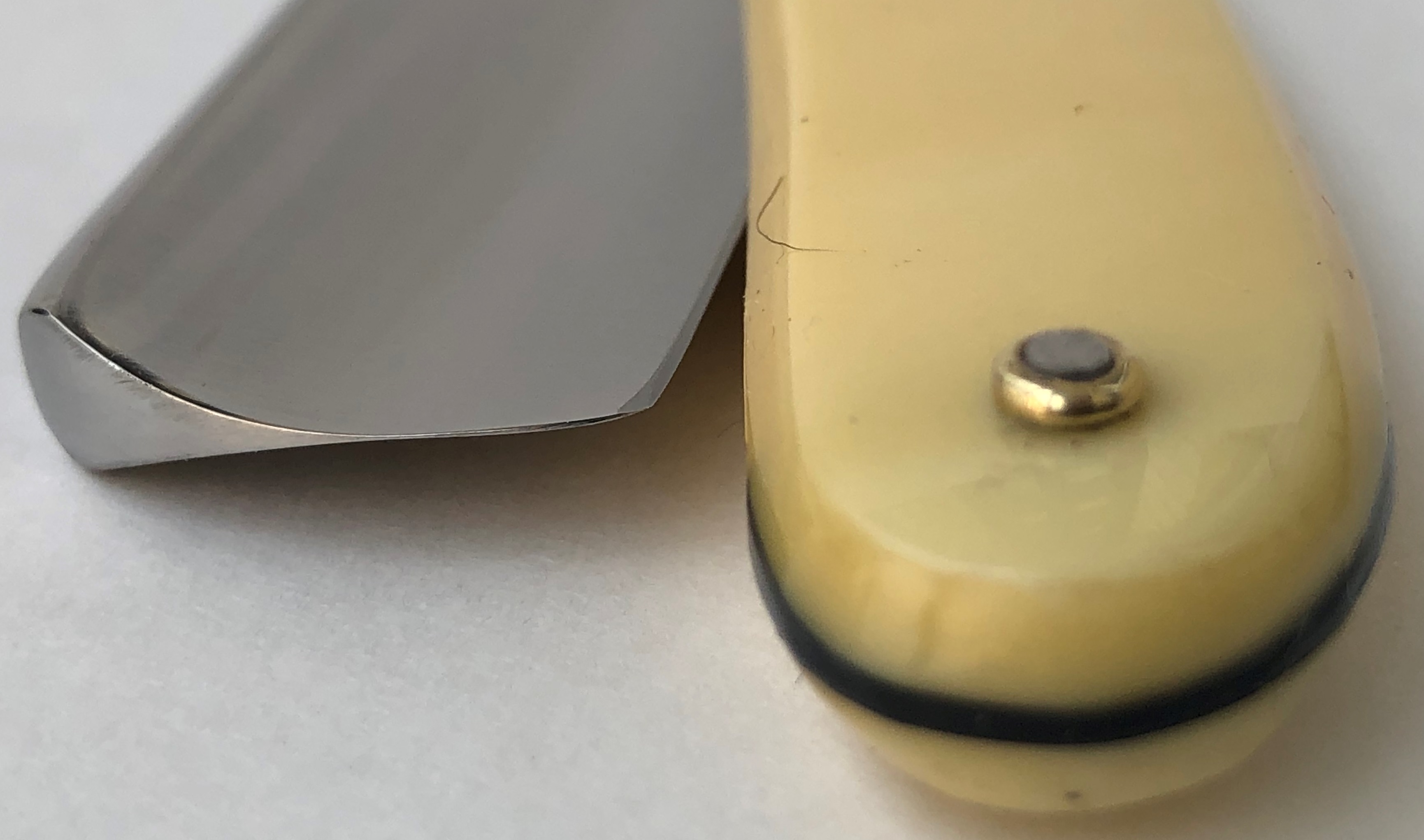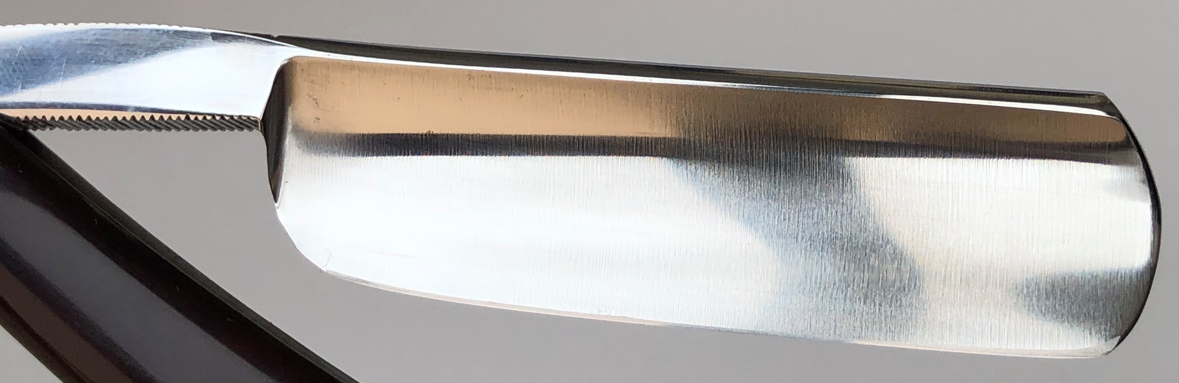 Бритва в прекрасном состоянии, с минимальными следами пользования.Была разобрана для добавления внутренних шайб, с сохранением родного осевого пина.Оригинальная шлифовка и полировка клинка.Идеальная геометрия полотна:кромочка равномерна по всей длине.