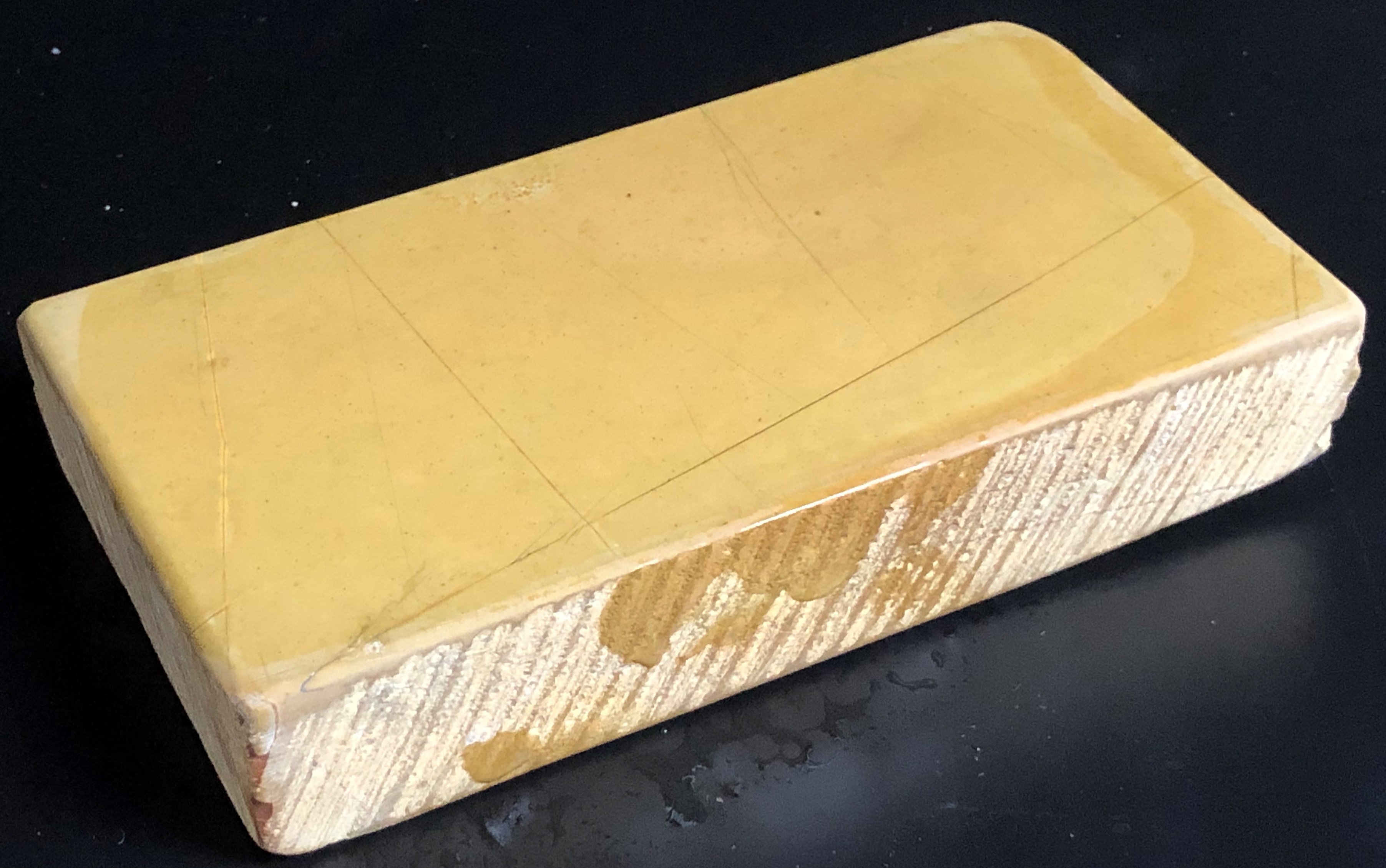 Очень приличный финишный наладонник, для тонкой доводки опасной бритвы, а также для супер-финиша ножей.Еще древний характер торцевого распила. Наверное самый старый среди этих трех. Суспензию выделяет, если не работать с мягкими нагурами. Отлично подойдет в паре с томо-нагурой, примерно такого же качества песка.Можно сказать, камень для чисто классического японского способа доводки и тонкой доводки бритвы, когда используются разные камни, разной твердости и зернистости, а не по методу Ивасаки, когда имеется один Хонияма и несколько нагур. Также может отлично применятся для обслуживания своих чуть затупившихся бритв. Притерт и готов к работе.