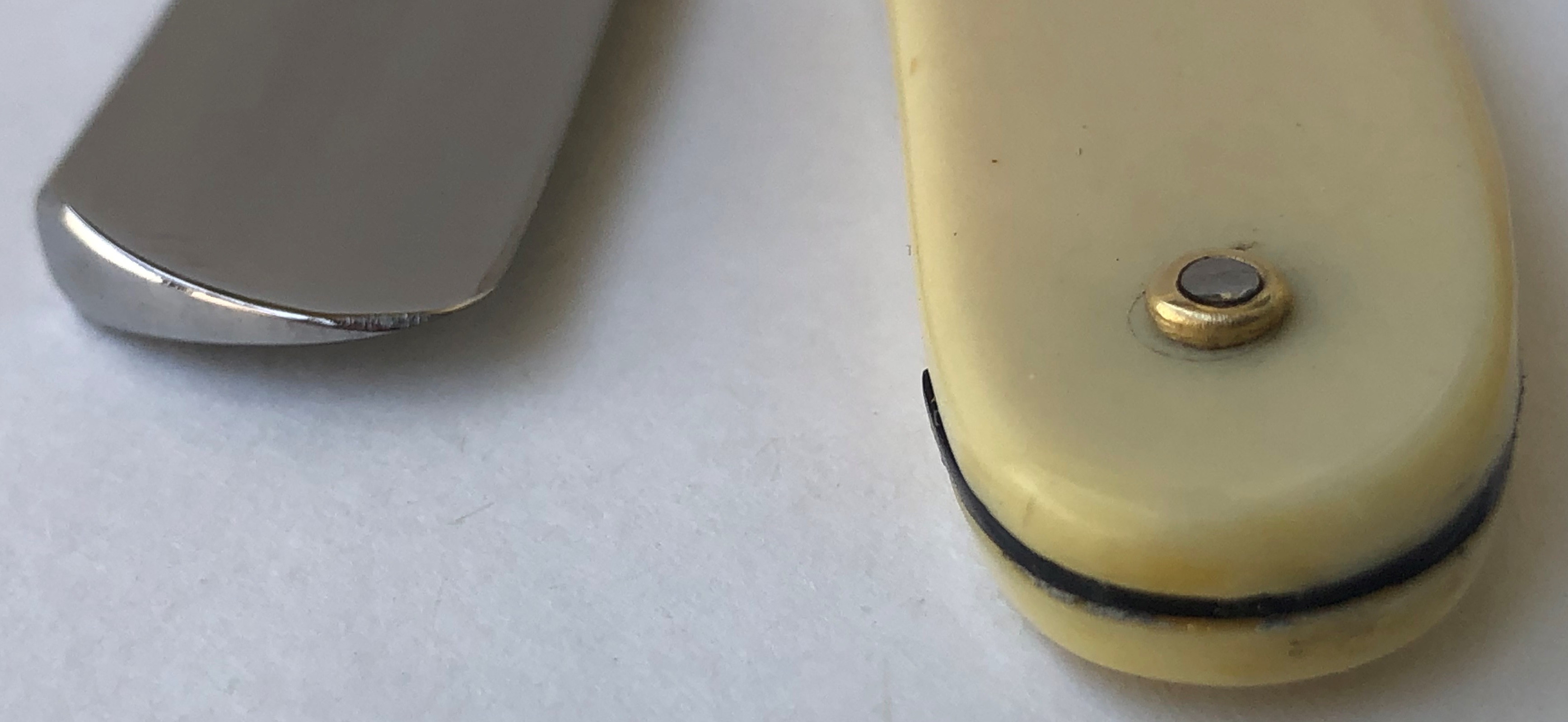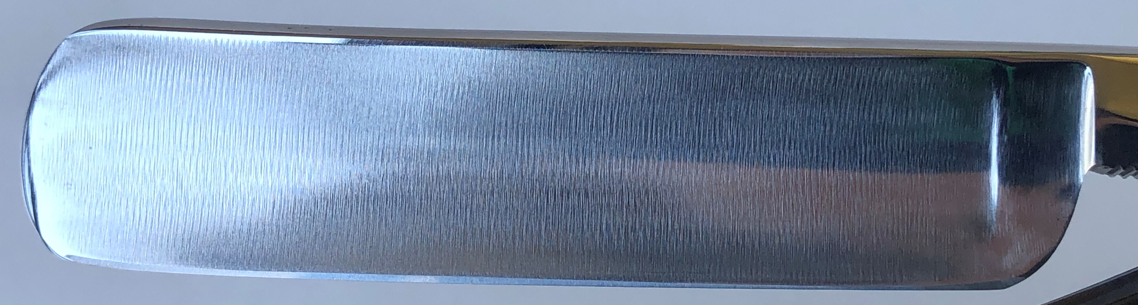 Бритва в пользовании не была, но нуждалась в чистке и полировке. Небольшое количество "следов времени" осталось, но никоим образом не повлияют на дальнейшую эксплуатацию.Комбинированная продольно-поперечная шлифовка.Новые втулки и внутренние шайбы. Идеальная геометрия полотна:кромочка равномерна по всей длине и еле заметна.