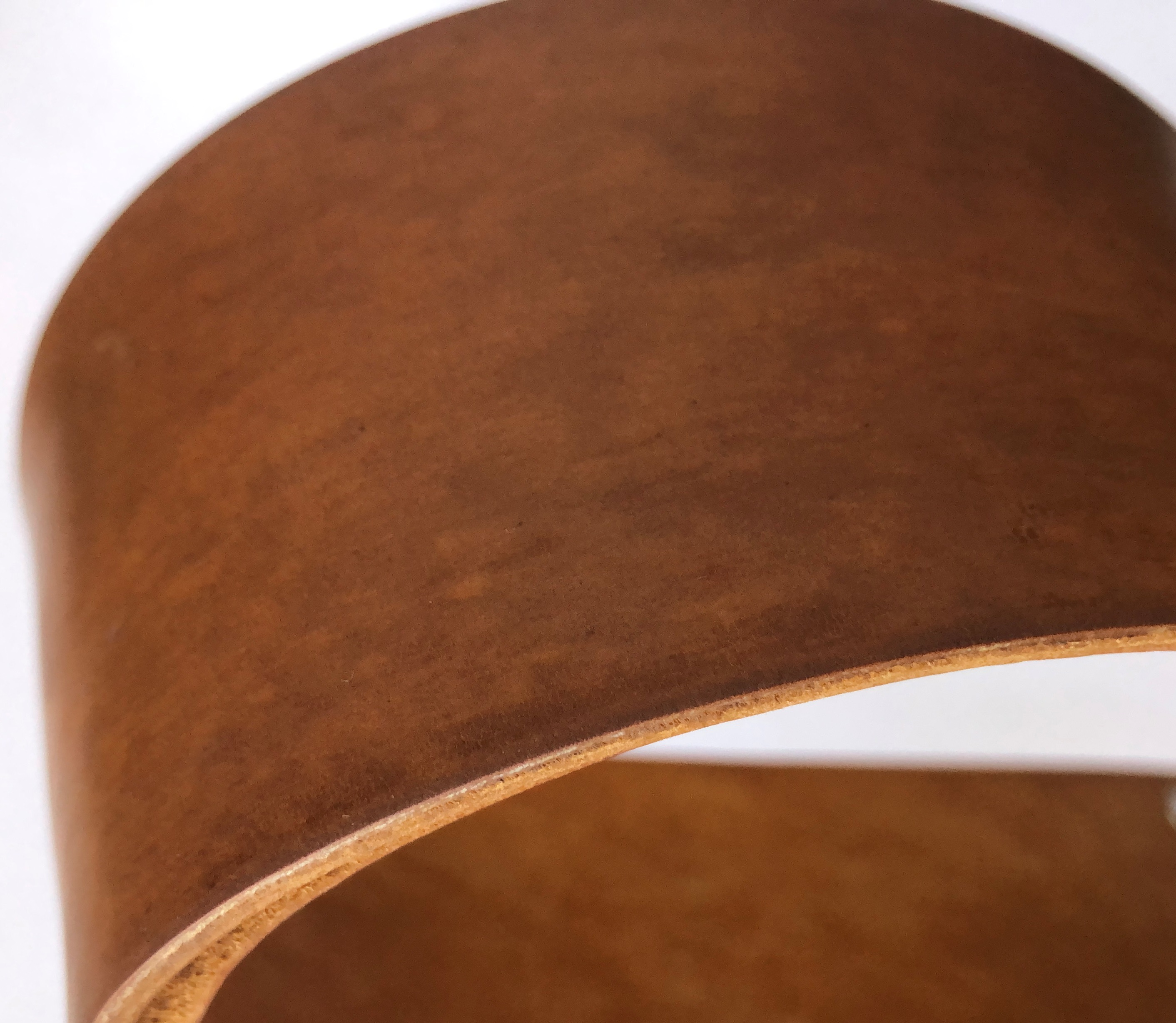 Кожа ближе к светло-коричневому оттенку. Без каких либо природных дефектов. Со временем размягчится, отполируется, начнёт "зеркалить" и править тоньше.