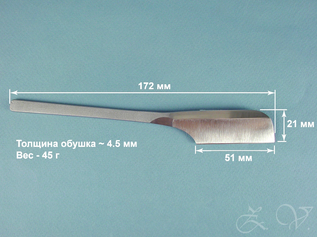 Продам асимметричную бритву камисори, сделанную мной по традиционной, японской технологии. Тело бритвы сделано из мягкой стали. На лезвие наварена кузнечной сваркой полоска высокоуглеродистой стали. Традиционно, японцы наваривают очень тонкий слой углеродистой стали на лезвие, поэтому при заточке бритвы принятое соотношение количества проходов по точильному камню сторон бритвы обычно составляет 10:1 или 7:1, чтобы режущая кромка не выходила на мягкую сталь. На 10 проходов по камню лицевой стороной «ура» приходится один проход (снятие заусенца) обратной стороной «омоте». Я навариваю на лезвие достаточно толстый слой углеродистой стали, поэтому затачивать можно как угодно. При заточке наклеиваю на грани изоленту или скотч. Если этого не делать мягкая сталь очень быстро стачивается точильным камнем. Бритва заточена и протестирована бритьём. Для защиты бритвы от коррозии я рекомендую смазывать голову бритвы чистым минеральным маслом. На ручке ПХВ намотка. При заточке использовалась изолента толщиной 0.2 мм. Все размеры указаны на фотографии. Цена – "Временно снято с продажи", плюс стоимость пересылки почтой России.