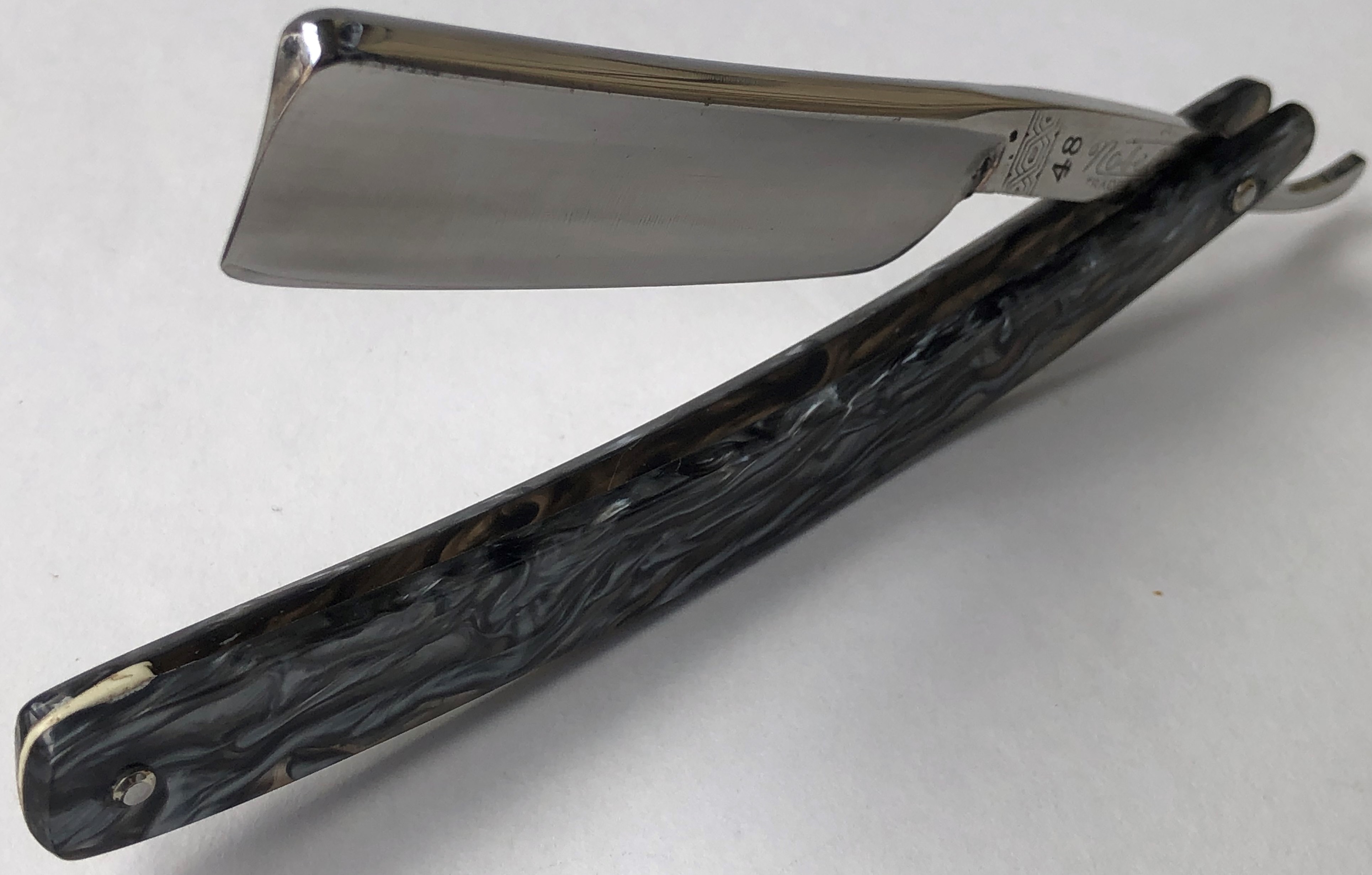Бритва была разобрана, клинок по мере возможности приведён в порядок.Умеренная полировка. Кромочка немного широковата,но почти равномерна по всей длине полотна.Новые двух-цветные втулки и внутренние шайбы. Родная роговая оправа в хорошем состоянии,без критичных дефектов,но нужно сделать скидку на преклонный возраст материала.Но, внешних расслоений, трещин и разгрызанных мест нет.Удобная форма лезвия клинка. Бритва достаточно тяжёлая.