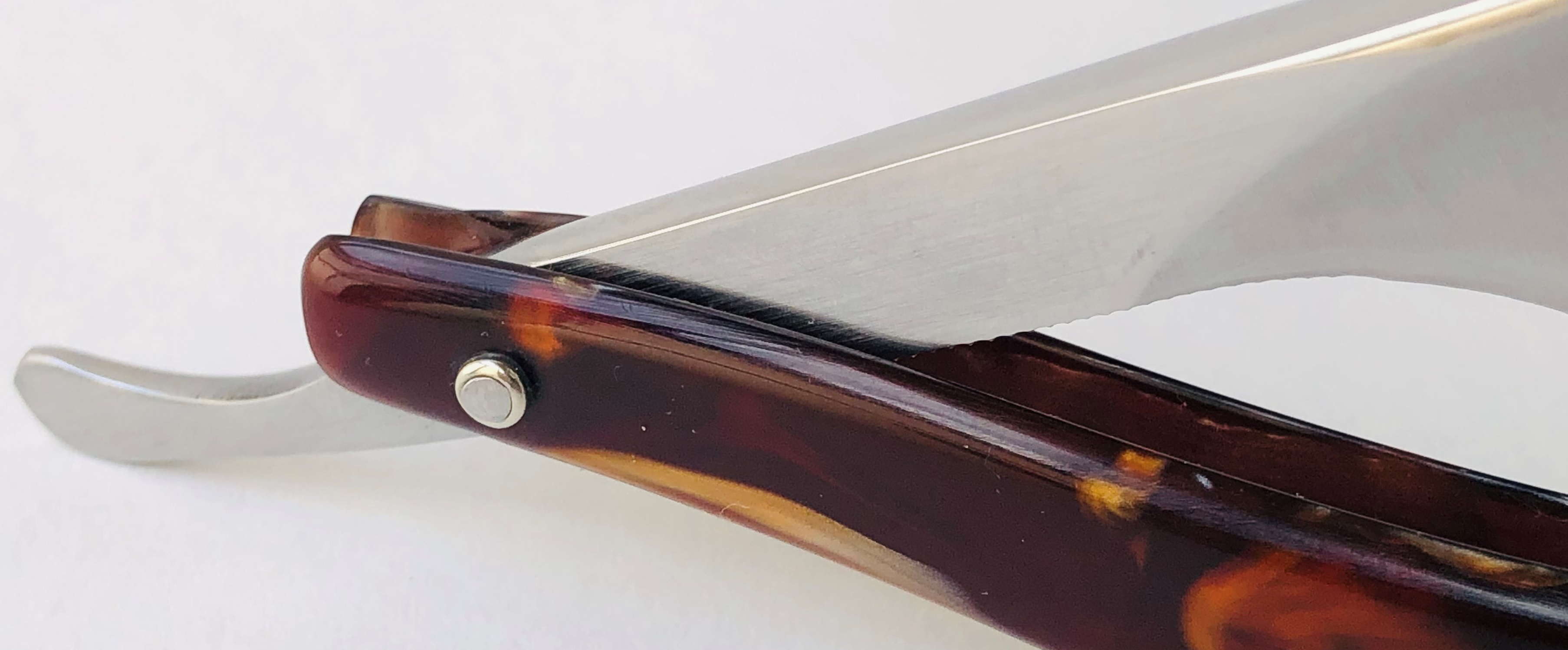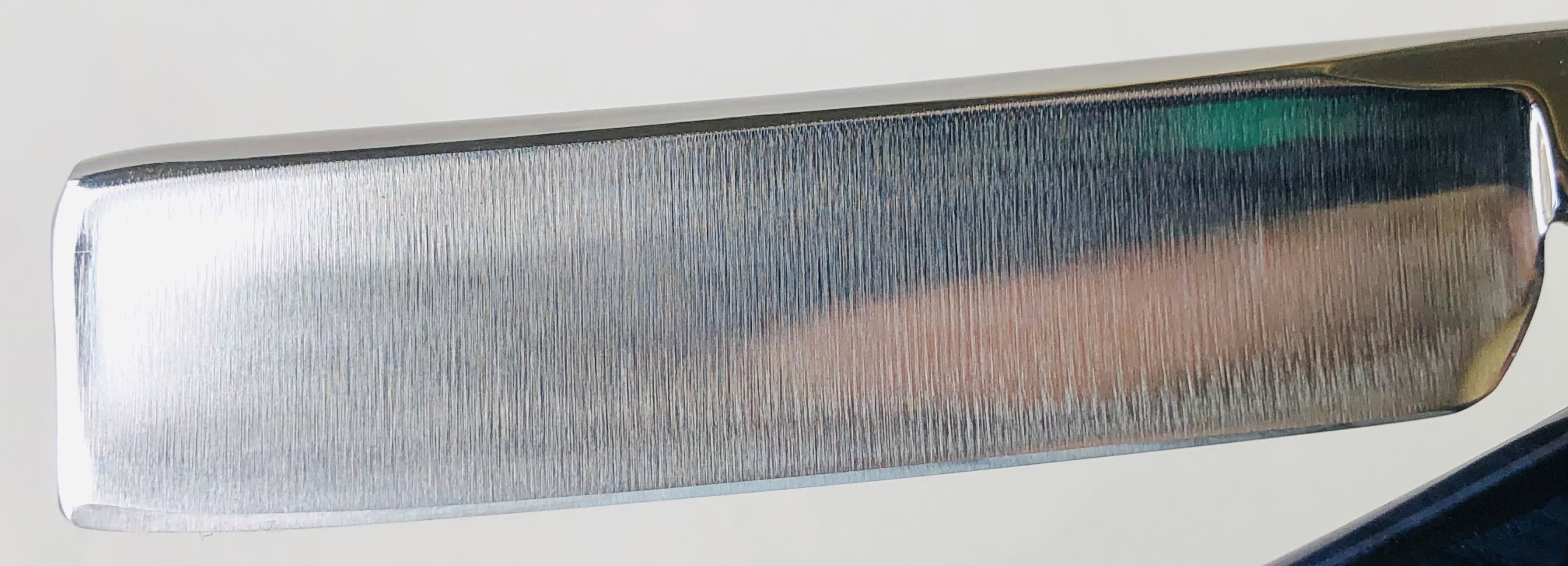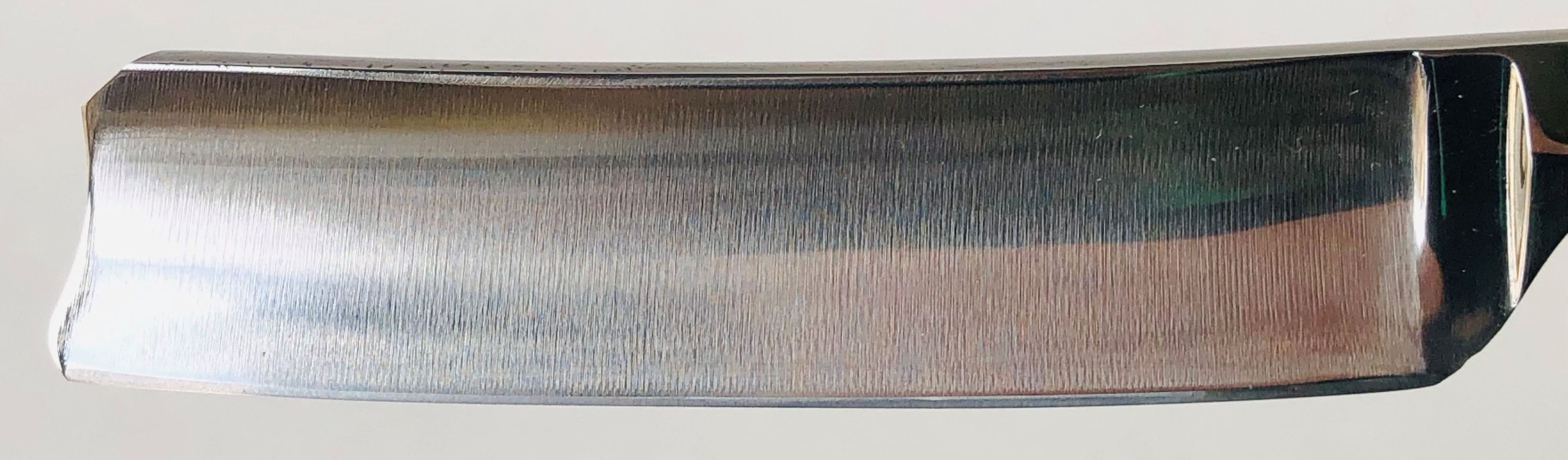 Разобрал, для удаления окисления в районе осевого пина и царапин на полотне.Минимальная шлифовка и полировка. Идеальная геометрия клинка:кромочка равномерна по всей длине.Заточена и готова к бритью.