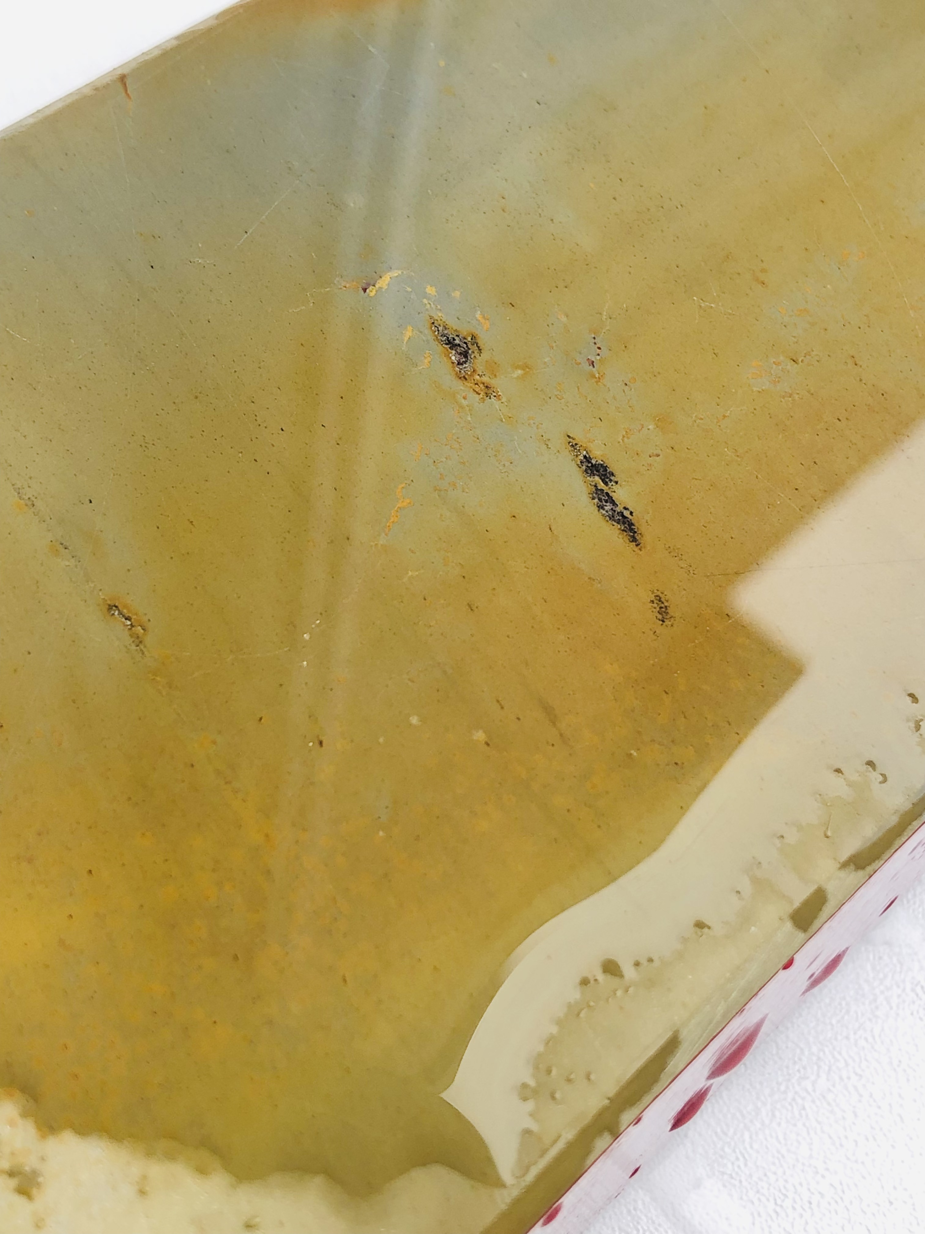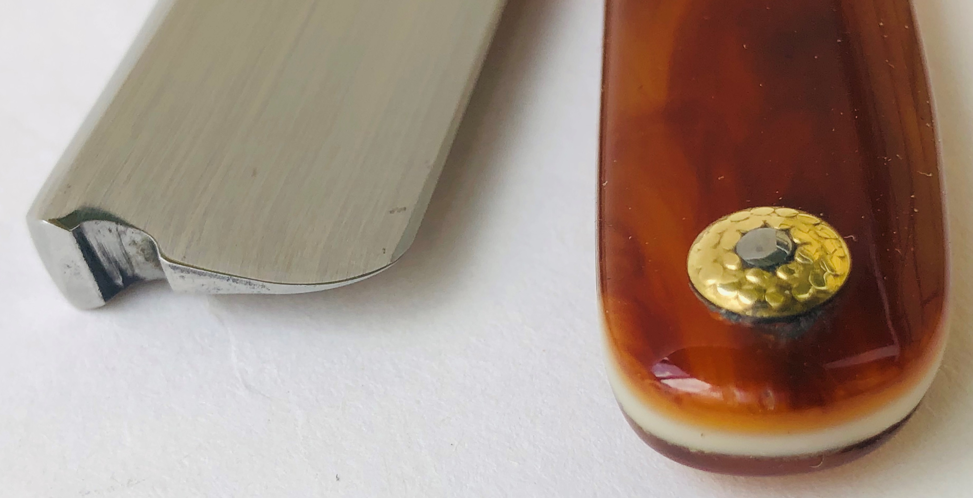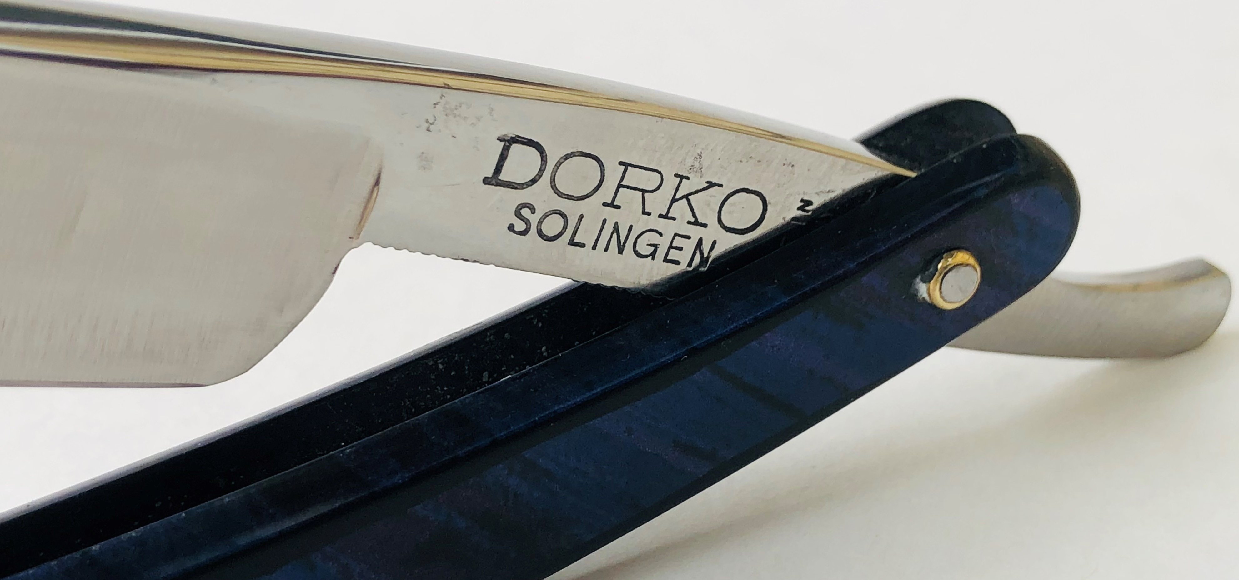 Бритва в пользовании не была. Была заточена впервые. Ничего не разбиралось и не ремонтировалось. Все в оригинальном виде.Идеальная геометрия полотна:кромочка равномерна по всей длине и еле заметна.Нетронутая позолота на травлении. Высококачественная "звонкая" углеродистая сталь.