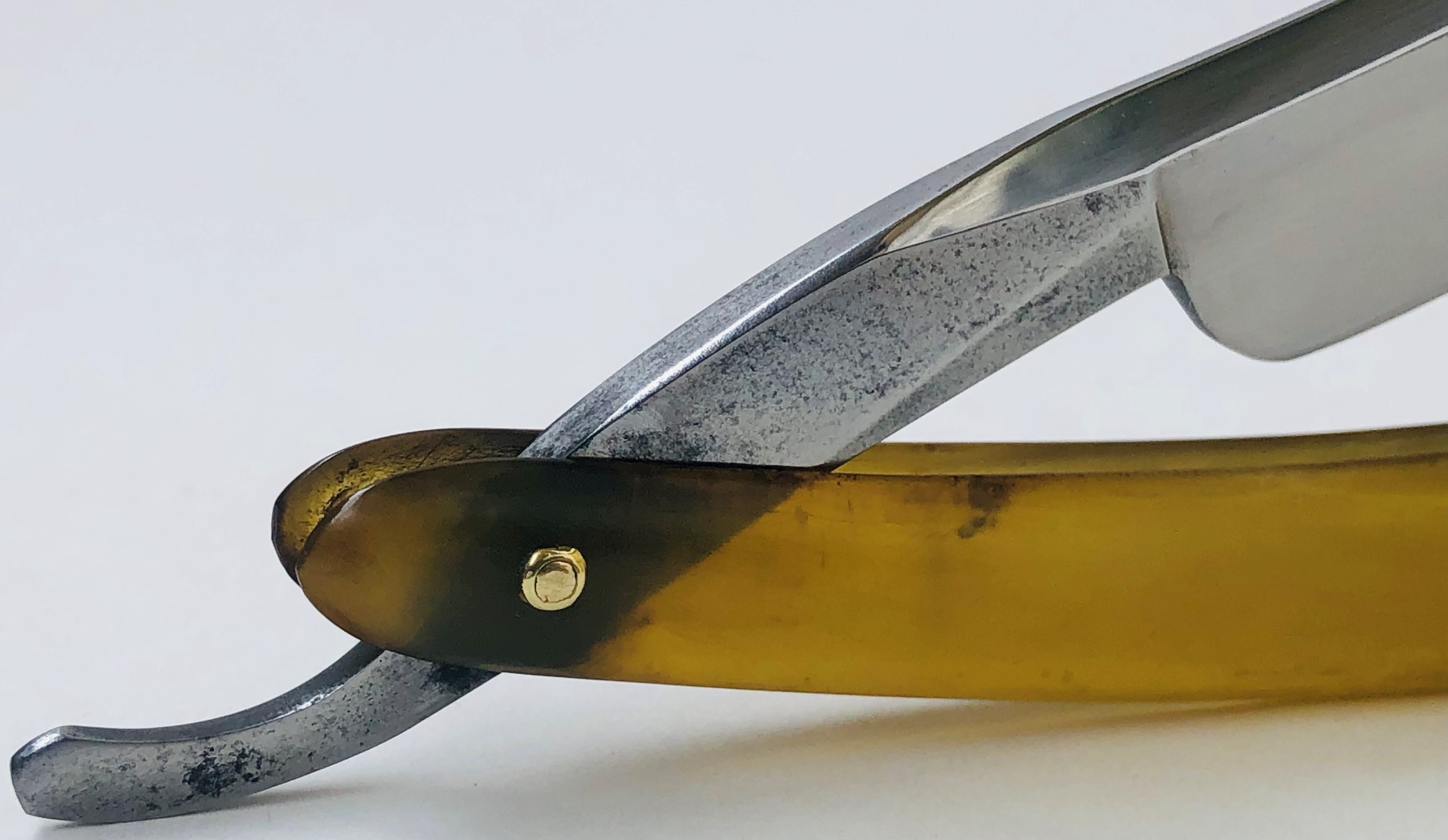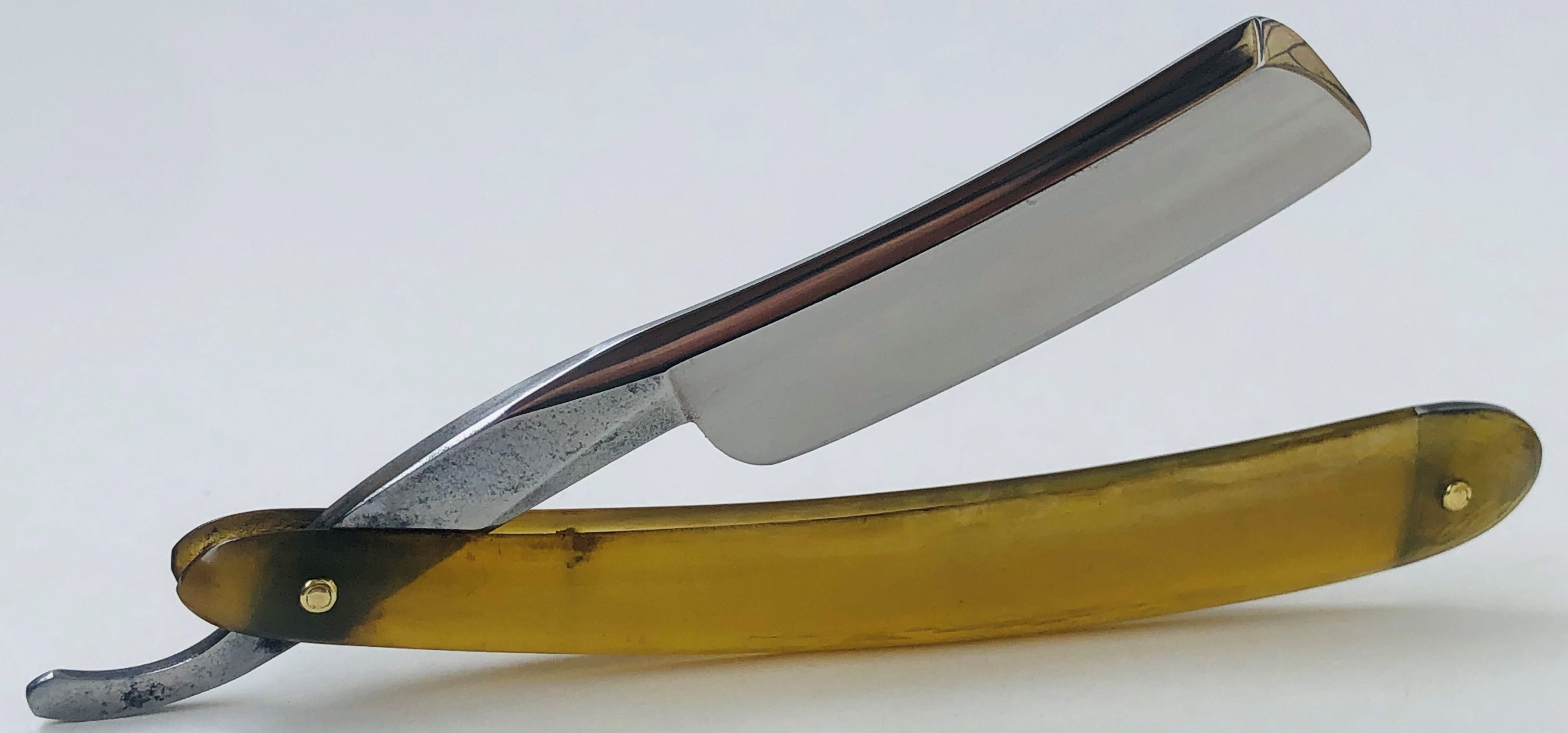 Не моя реставрация. Досталась такой какая есть. Ничего не стал исправлять и доделывать под себя, так как бритва сейчас находится в очень хорошем состоянии, без активных следов пользования , а также с щадящими реставрационными работами.Была умеренно почищена, с сохранением красивой, древней патины. Хорошая геометрия клинка:кромочка почти равномерна по всей длине. Тяжёлая.Ручка из натурального рога без трещин и дефектов. Клинышек-олово.