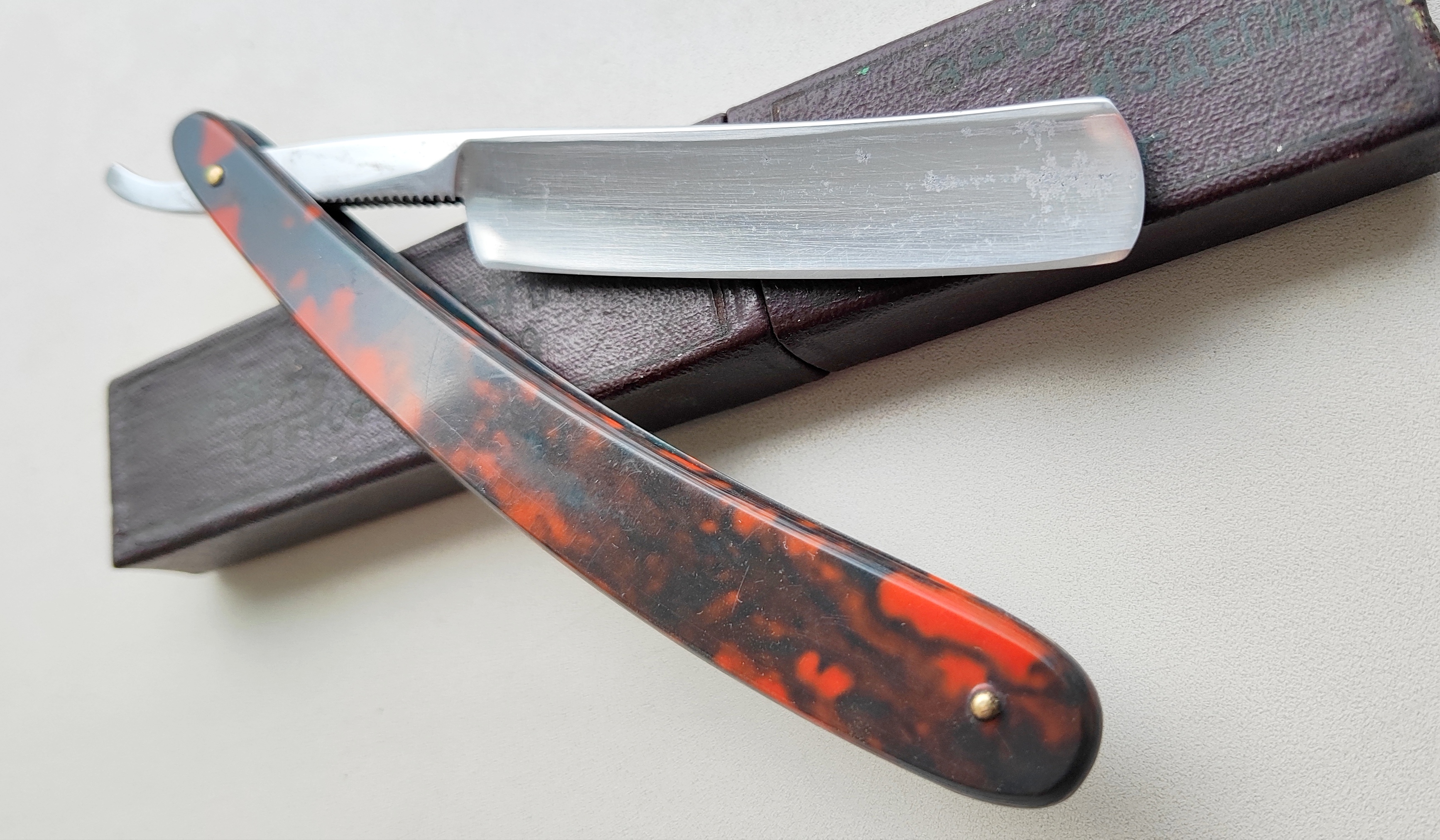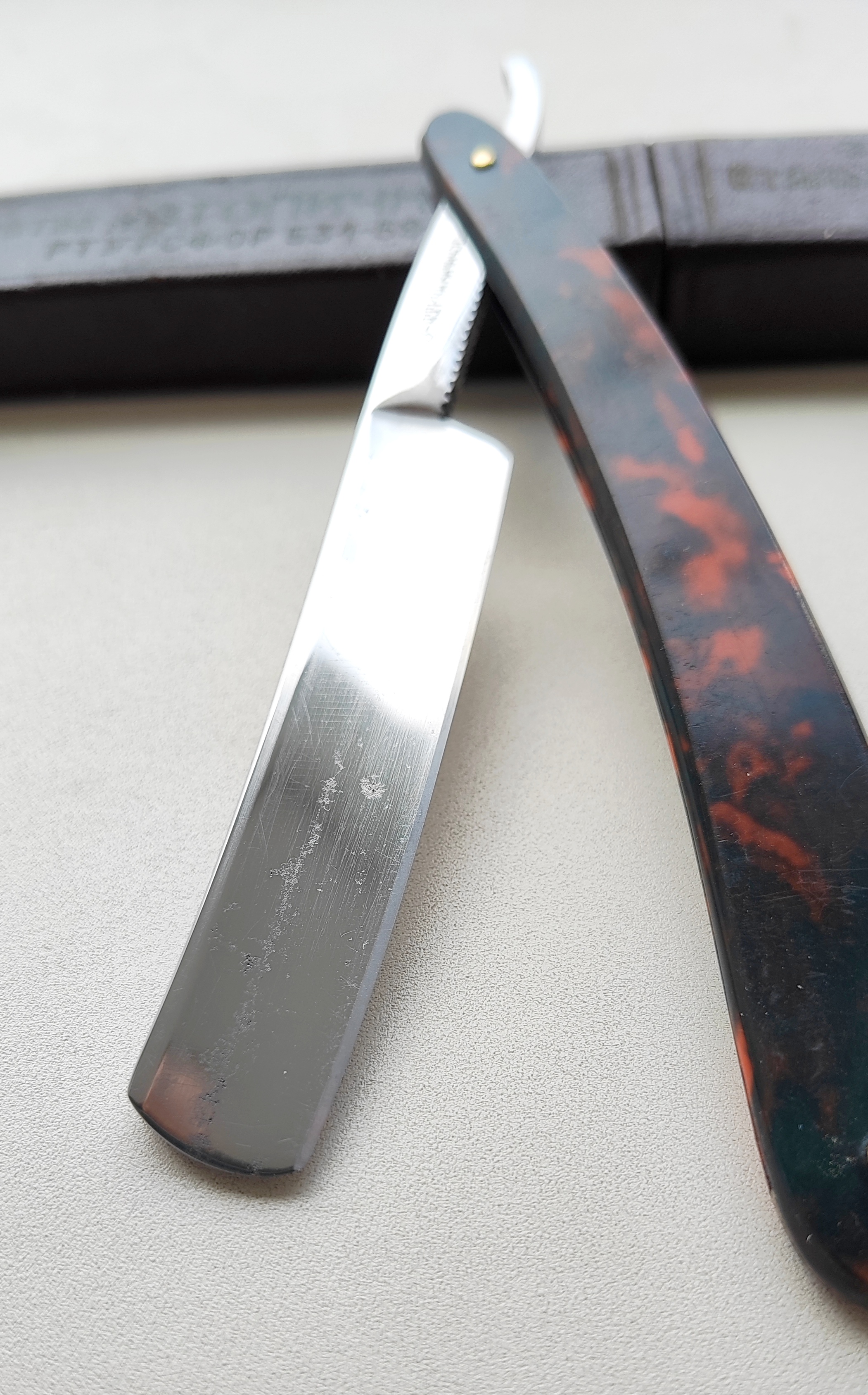 Опасная бритва завода Труд Вача, 1949 год. Ширина полотна 16.5 мм, все родное, футляр от другой бритвы. Пришла с пятнами коррозии, почистил полотно вручную (остались некоторые остаточные явления, но кромка чистая) и заточил, подготовлена мной к бритью. Отличный представитель старых советских бритв с шикарной сталью и профилем полуклин - уничтожителем густой жесткой щетины. Такие бритвы сейчас редкость. Красивая оправа с красными переливами.