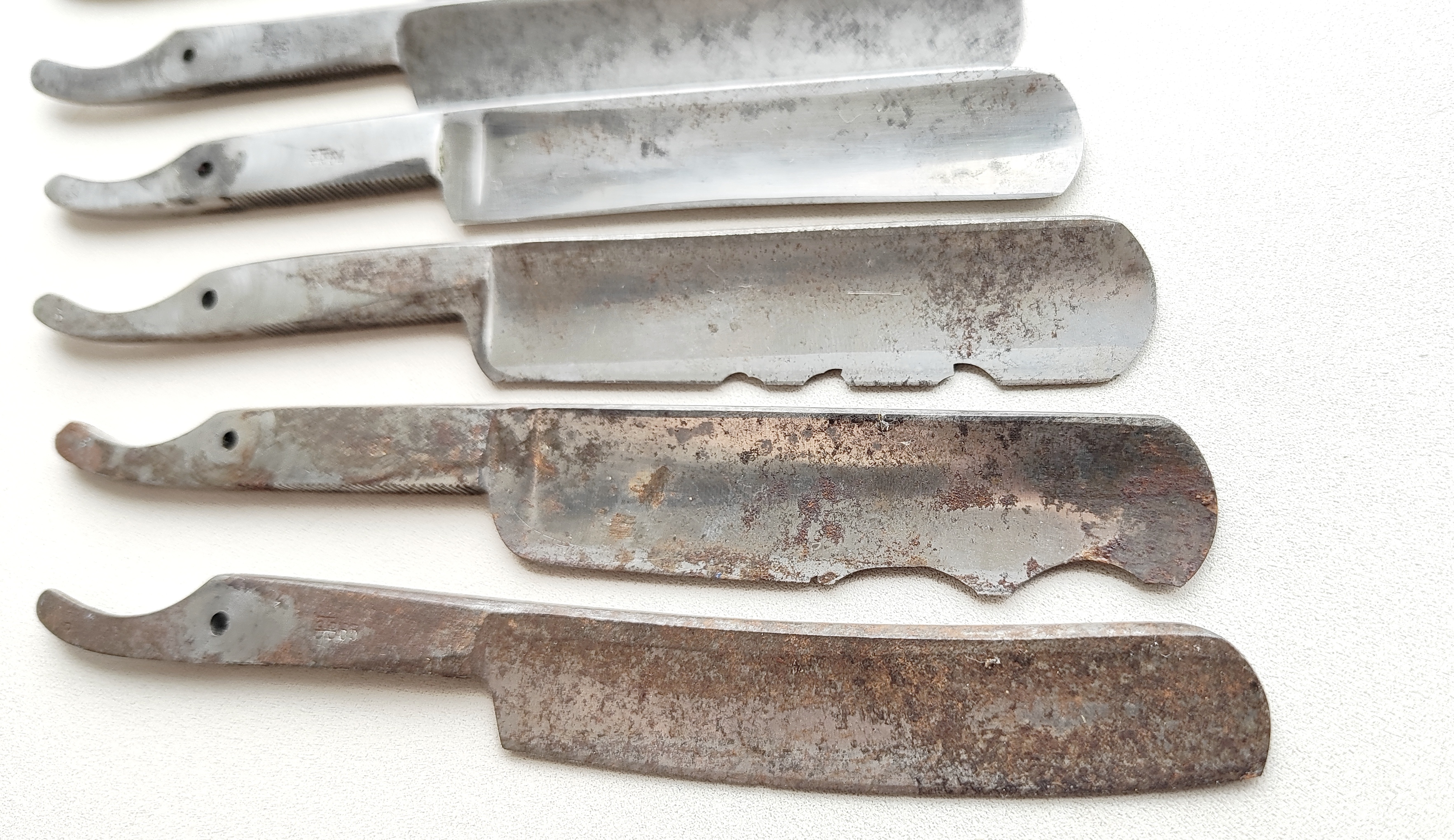 Опасная бритва Ока (в наличии 2 штуки), завод ЗТВ (Вача), 1962 и 1967 годы. Ширина полотна каждой - 15 мм, все родное, без футляров. Бритвы попали ко мне с уточенностями, вручную почистил и заточил. Подготовлены мной к бритью. Ока - бритва из водной серии, куда еще входили Кама, Волга, Яхта. Прямой нос и прямая линия кромки с небольшой шириной полотна - хорошо подойдут для окантовки бороды.