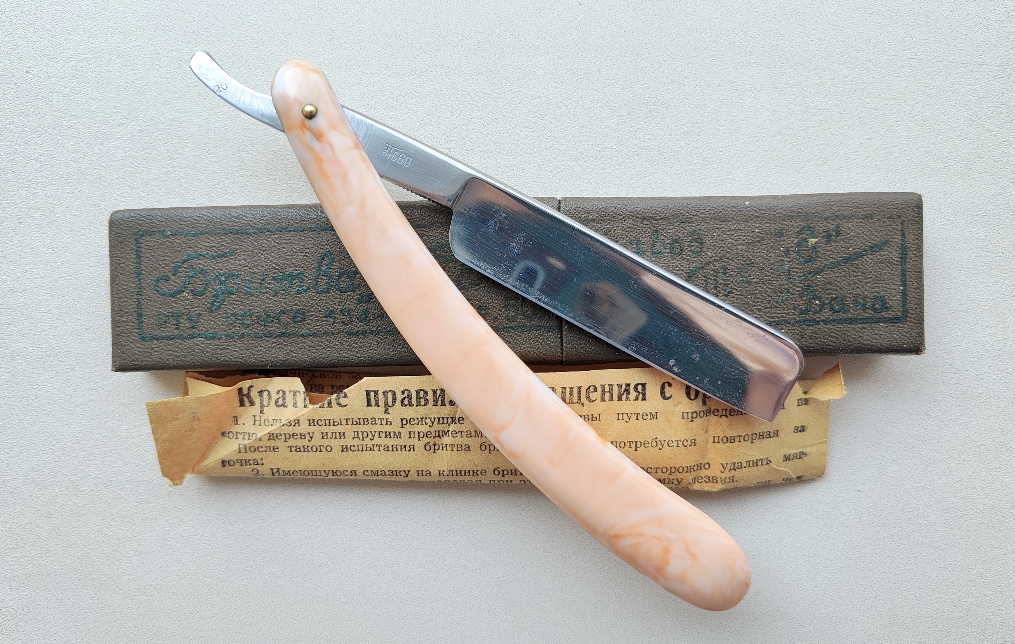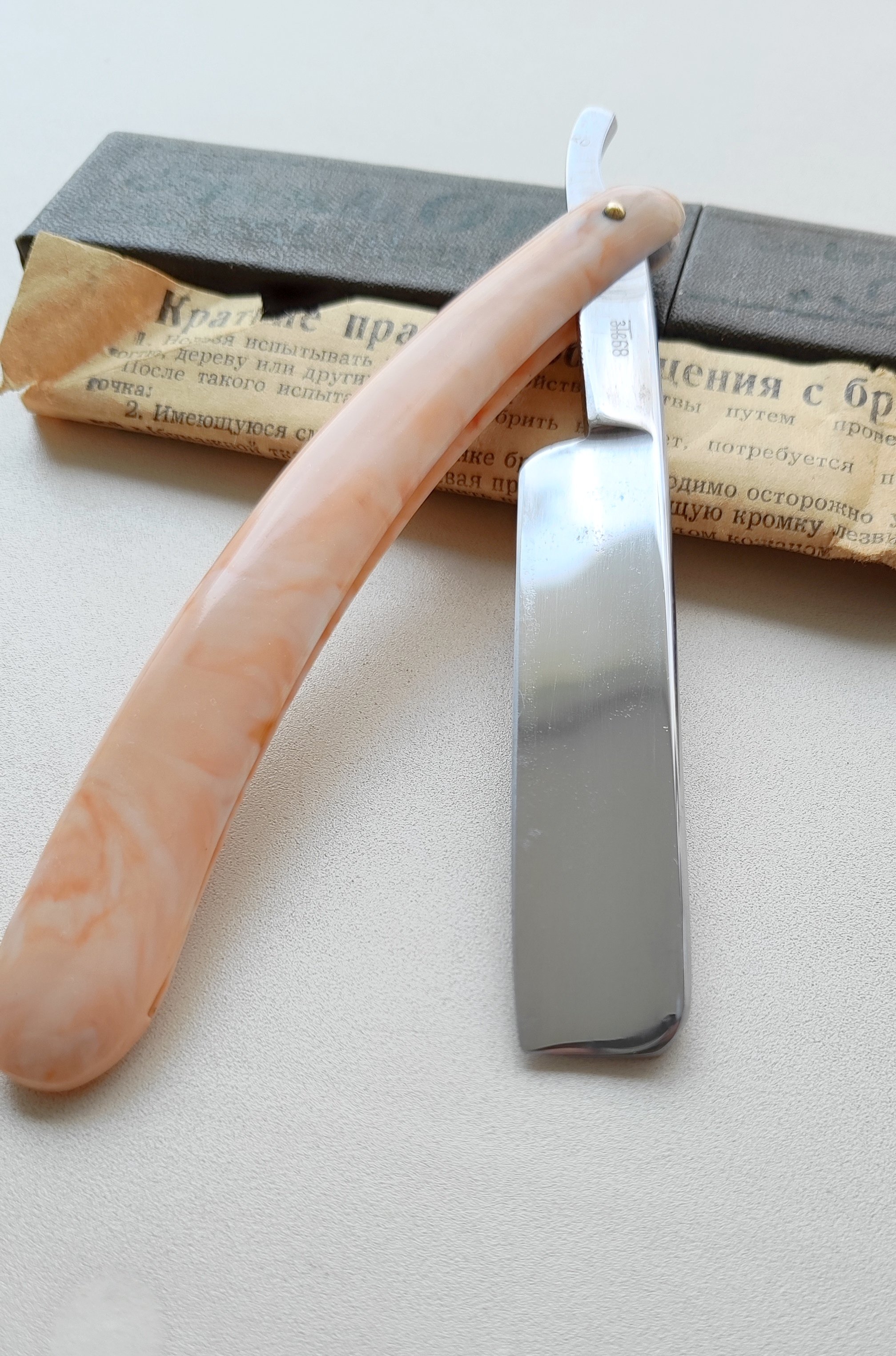Опасная бритва Ока, завод ЗТВ (Вача), 1968 год. Ширина полотна 18.2 мм, все родное, футляр тоже. Бритва попала ко мне с лёгкой коррозией, но в заводской ширине и с инструкцией. Вручную почистил (сохранились мелкие остаточные следы) и заточил. Подготовлена мной к бритью. Модель из водной серии, куда еще входили Кама, Волга, Яхта, приятная оправа нежно-персикового цвета с градиентами. 1968 год был последним по выпуску бритв на ЗТВ, при этом качество держали и тогда, сталь достойная.