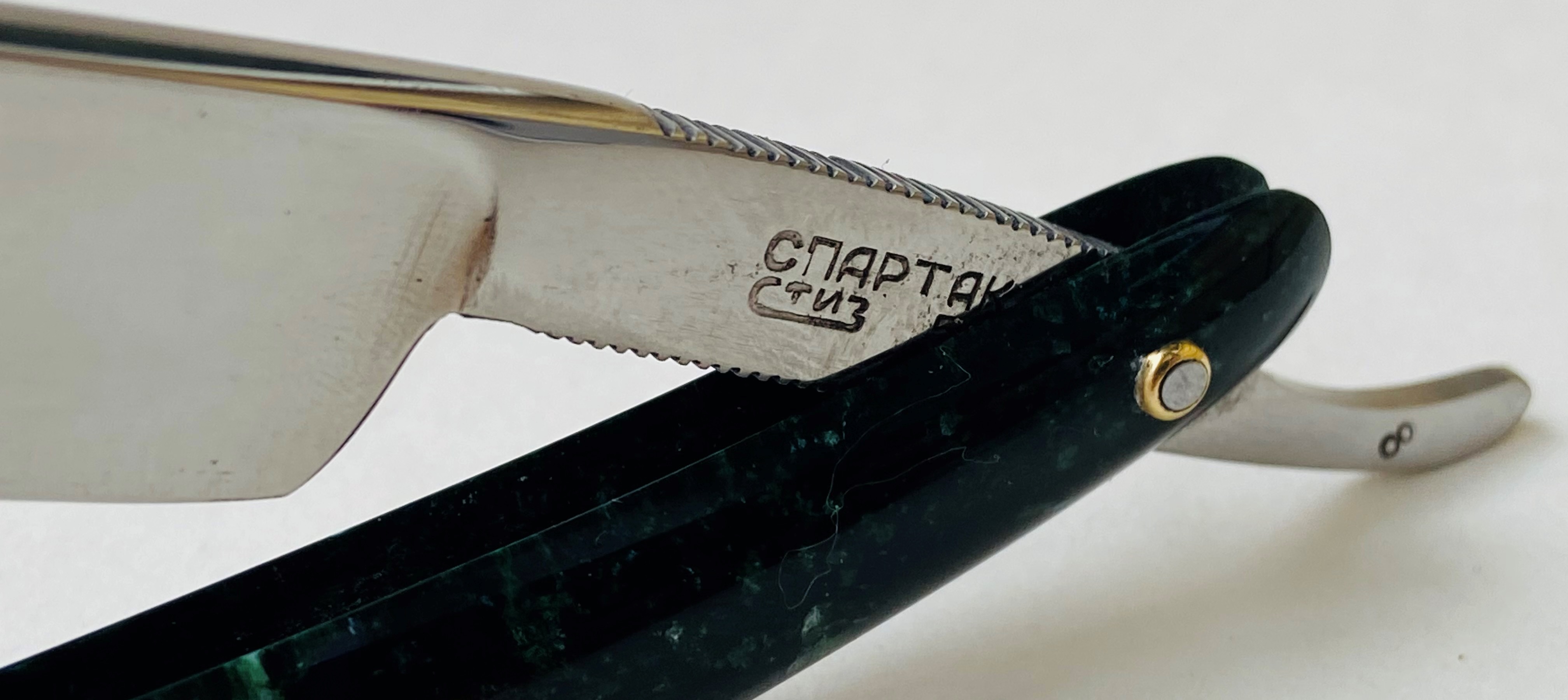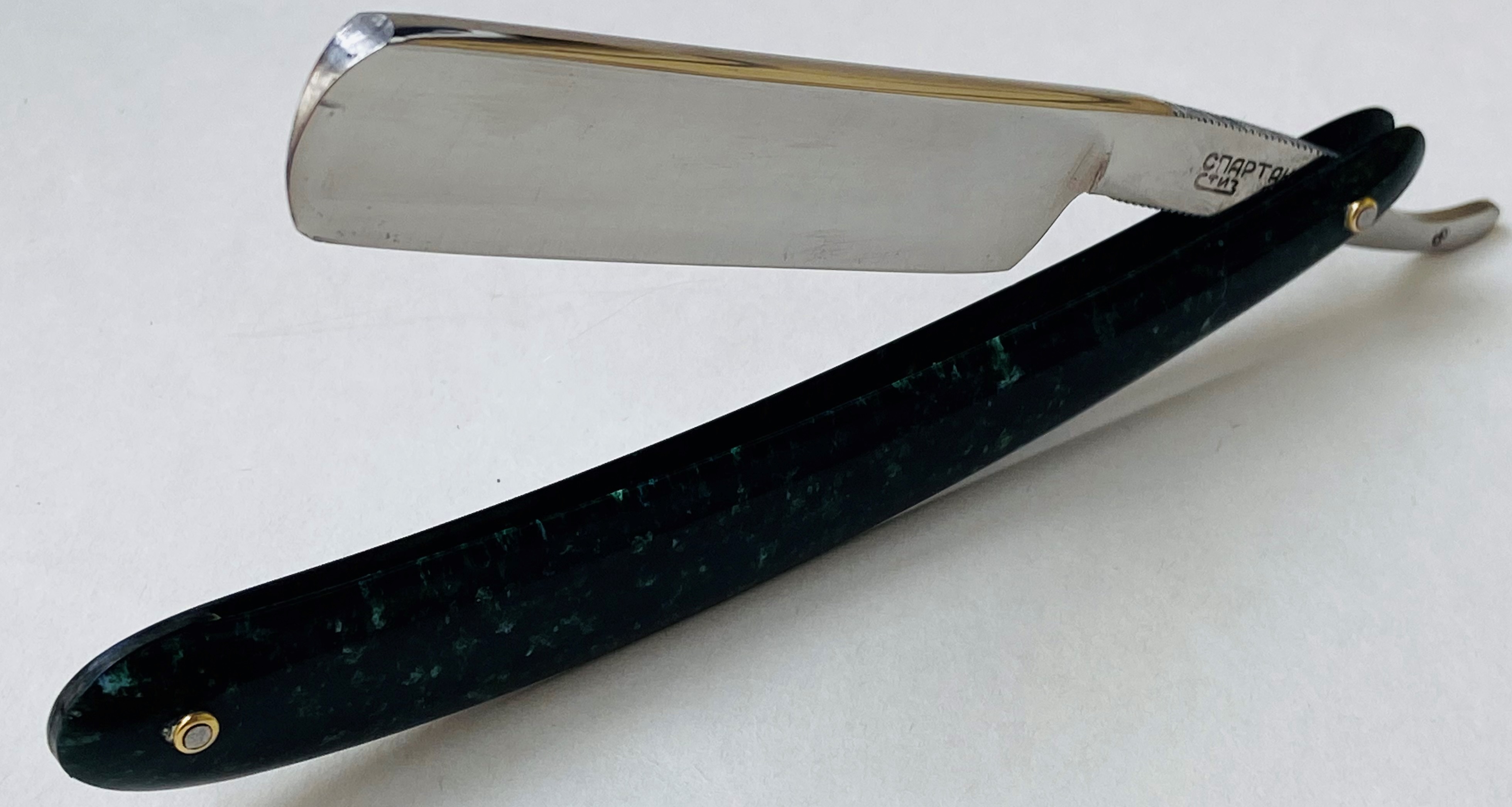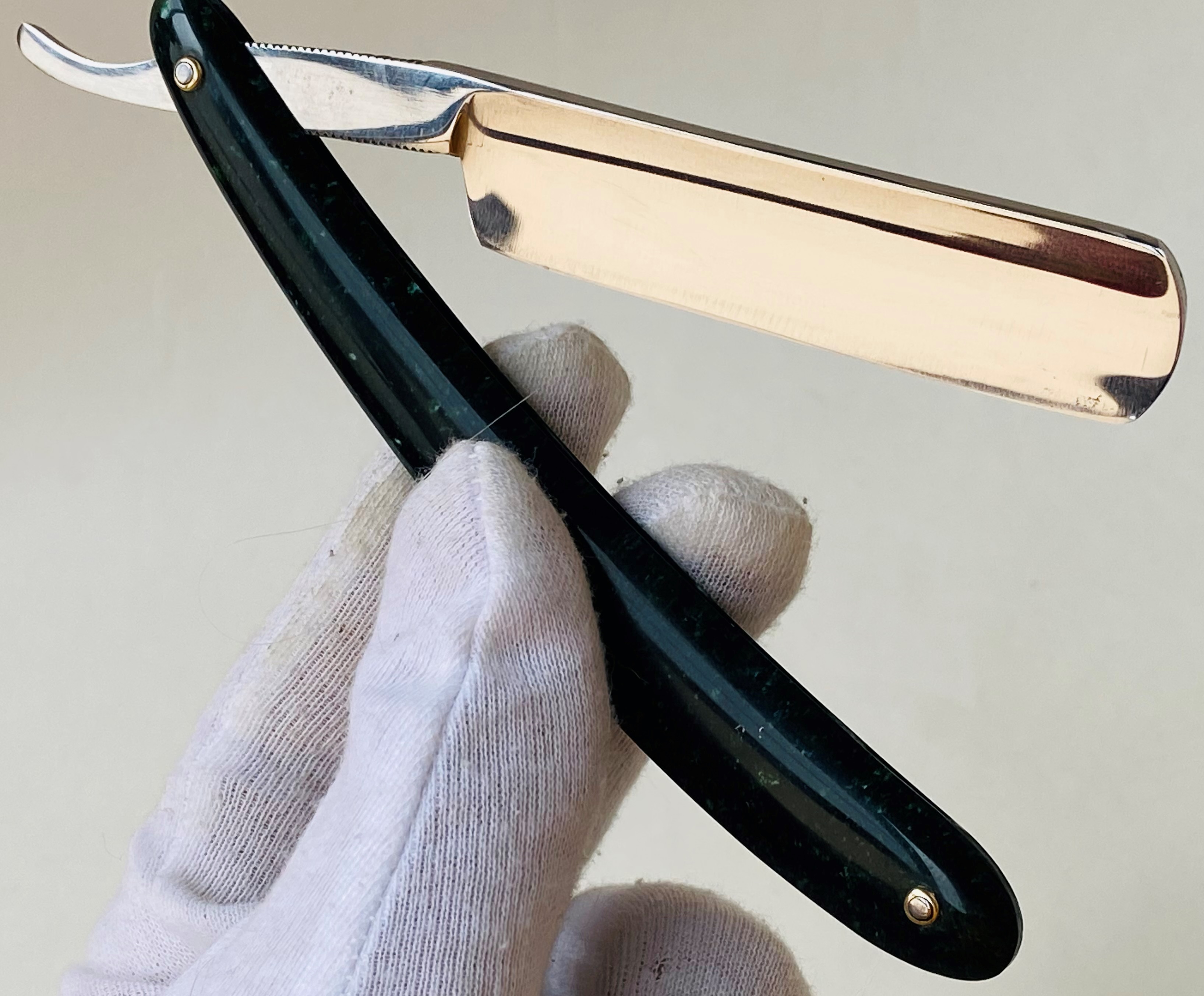 Бритва в состоянии близком к идеальному. Самая крупная и "горбатая" бритва из всей линейки Стиз. Бритва без следов пользования и по всей видимости в работе не была. Нет следов от заточных камней на обушке.Оригинальная шлифовка и полировка клинка.Кромочка тоненькая по всей длине.Перебрал бритву, чтобы добавить внутренние шайбы и поменять заклепки на более практичные втулки.Шикарная и не часто встречающаяся оправа малахитового оттенка. Коробочка оригинальная также 1955 года. Короче, полный комплект.Бритва заточена и готова к бритью.