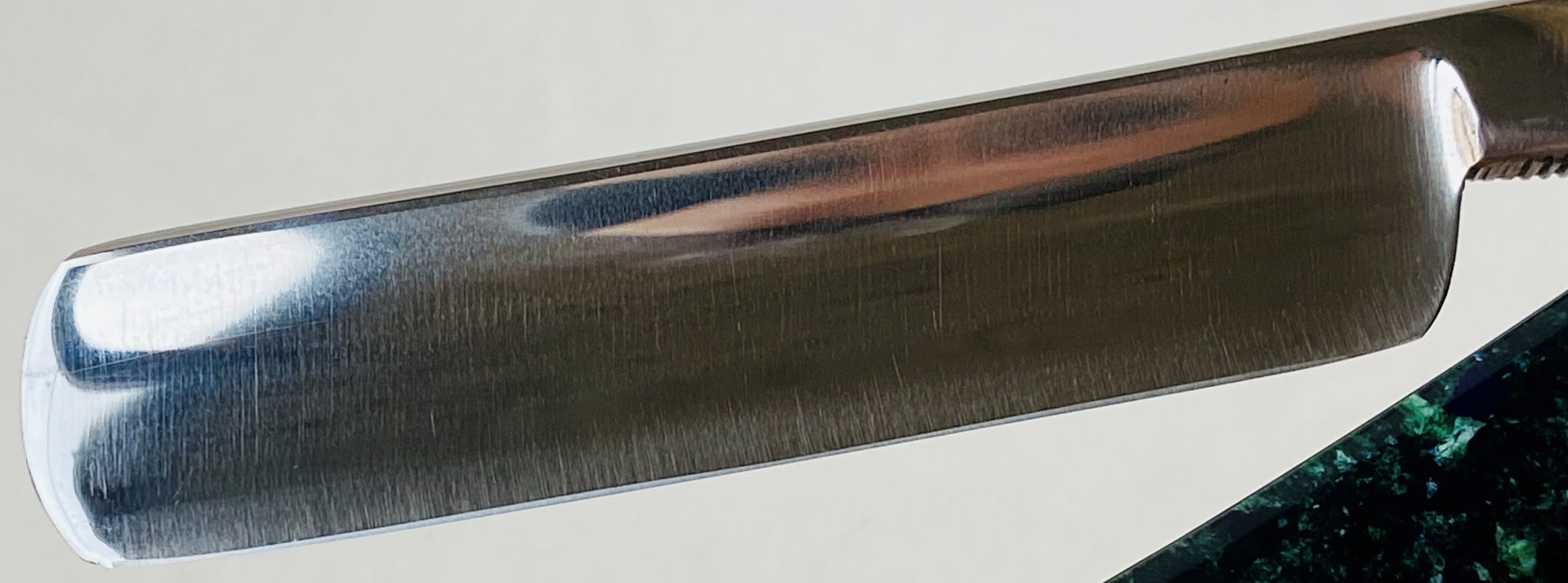 Бритва находится в идеальном состоянии и никогда в пользовании не была. Остатки масла с консервации удалены.Можно заметить шикарную, чуть уловимую патину на обратной стороне клинка,которую просто рука не поднялась удалять.Также видны следы от заводской электро-химической заточки. Идеальная геометрия клинка:кромочка равномерна по всей длине и еле заметна.Оригинальная шлифовка и полировка полотна.Травление чёткое, без потертостей.