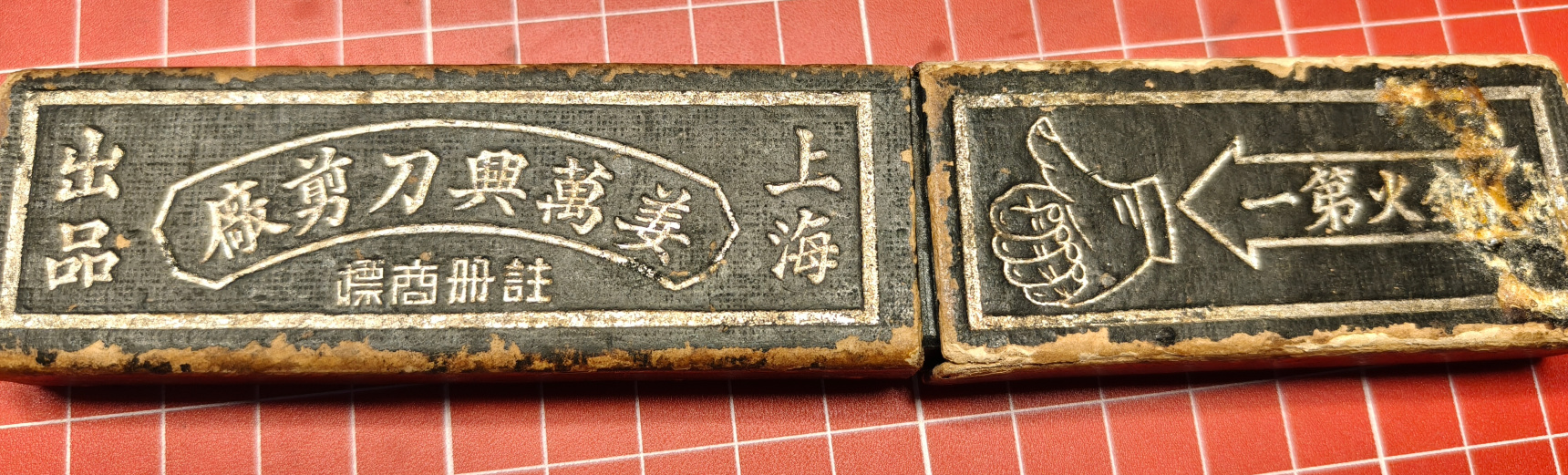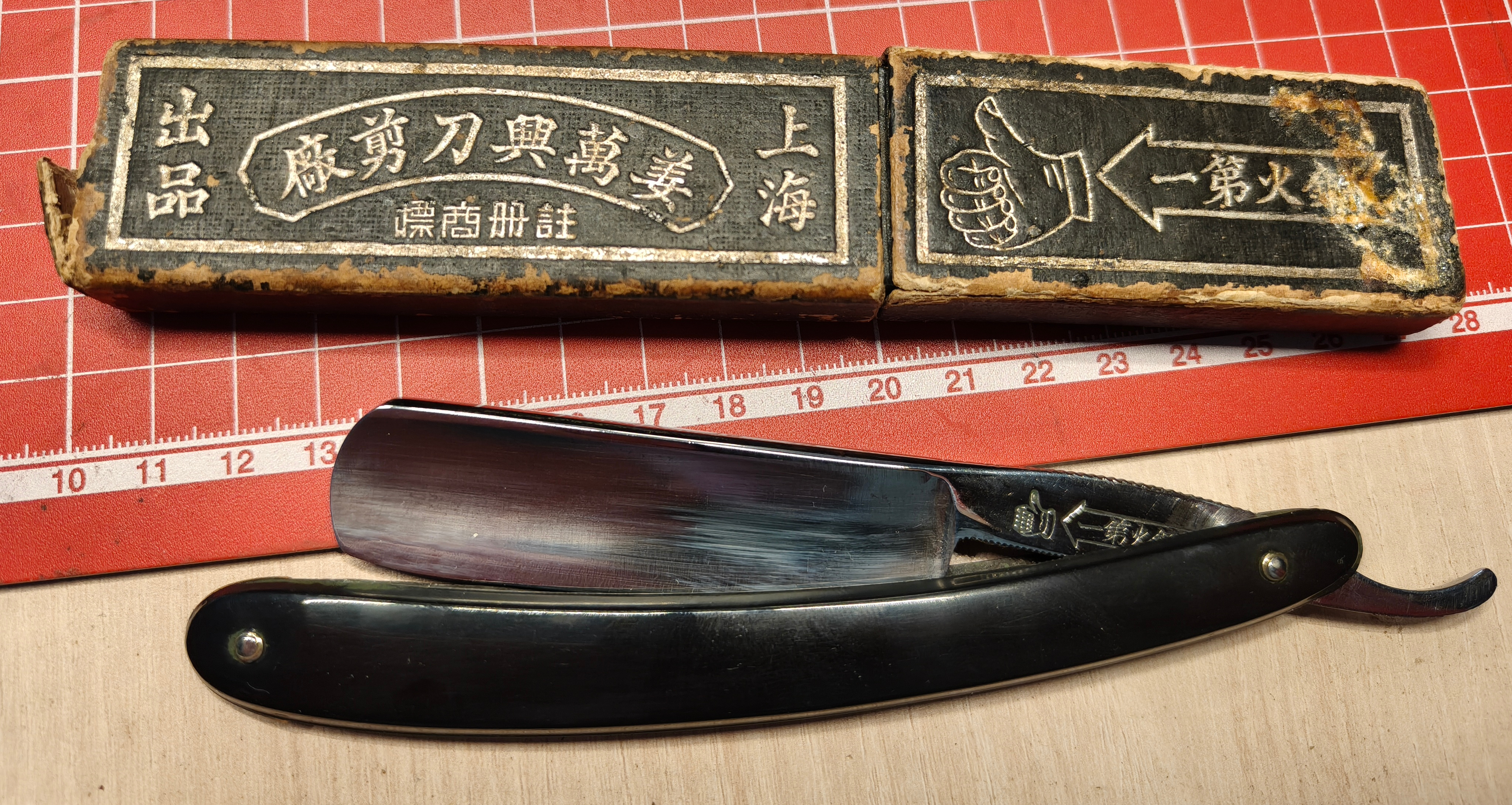 Продаётся от Олег БритваНадпись на коробке "На 38-м году существования Китайской Республики бритвенная фабрика Цзян Ваньсин заменила старомодную бритву с деревянной ручкой на бритву западного образца со стальной инкрустацией." (民国38年,姜万兴剃刀厂改老式木柄剃刀为西式嵌钢剃刀。)