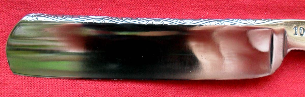 Надпись на обратной стороне эрля - BEST SILVER STEEL MADE IN GERMANY. Слово "Germany" затерто, но прочесть можно. Ручка и пины родные. Сталь на бритве действительно хорошая - достаточно просто точится. Ширина бритвы 17 мм, толщина обуха 4,5 мм. В комплекте также родной футляр. Не в самом лучшем виде, но вполне живой.