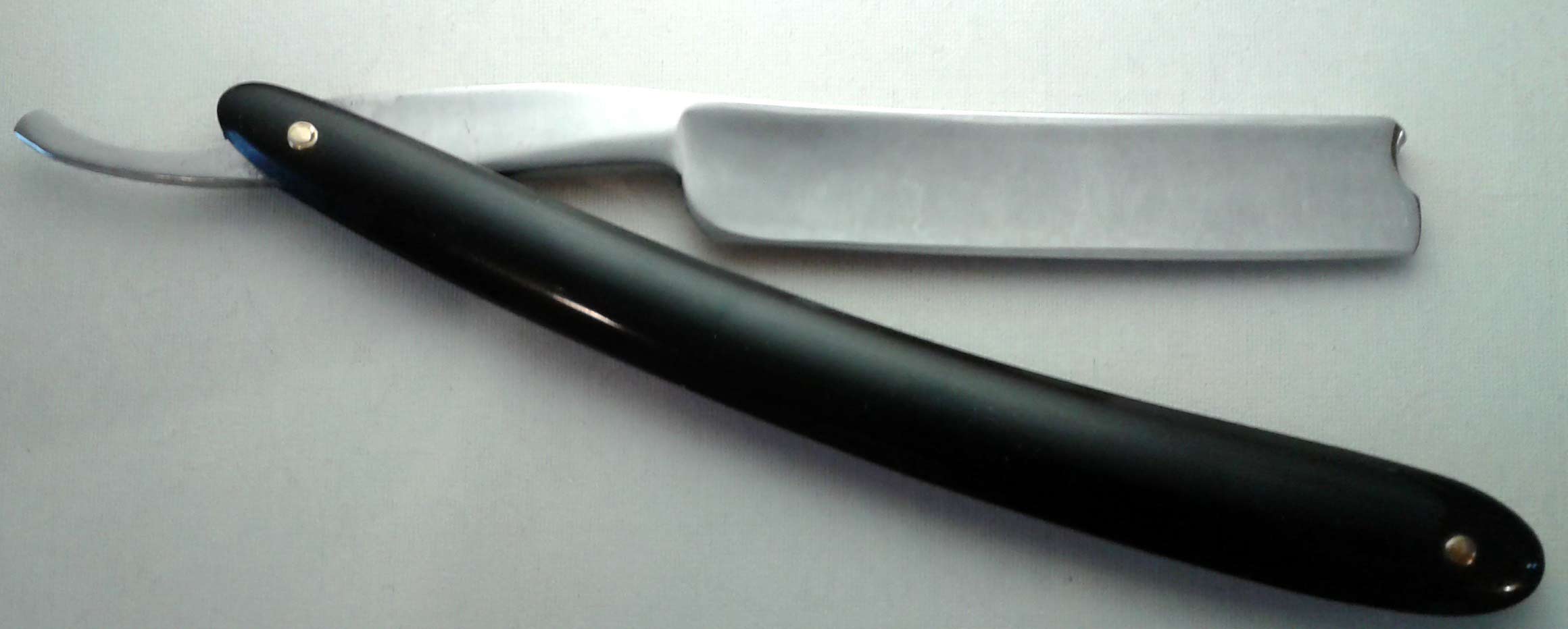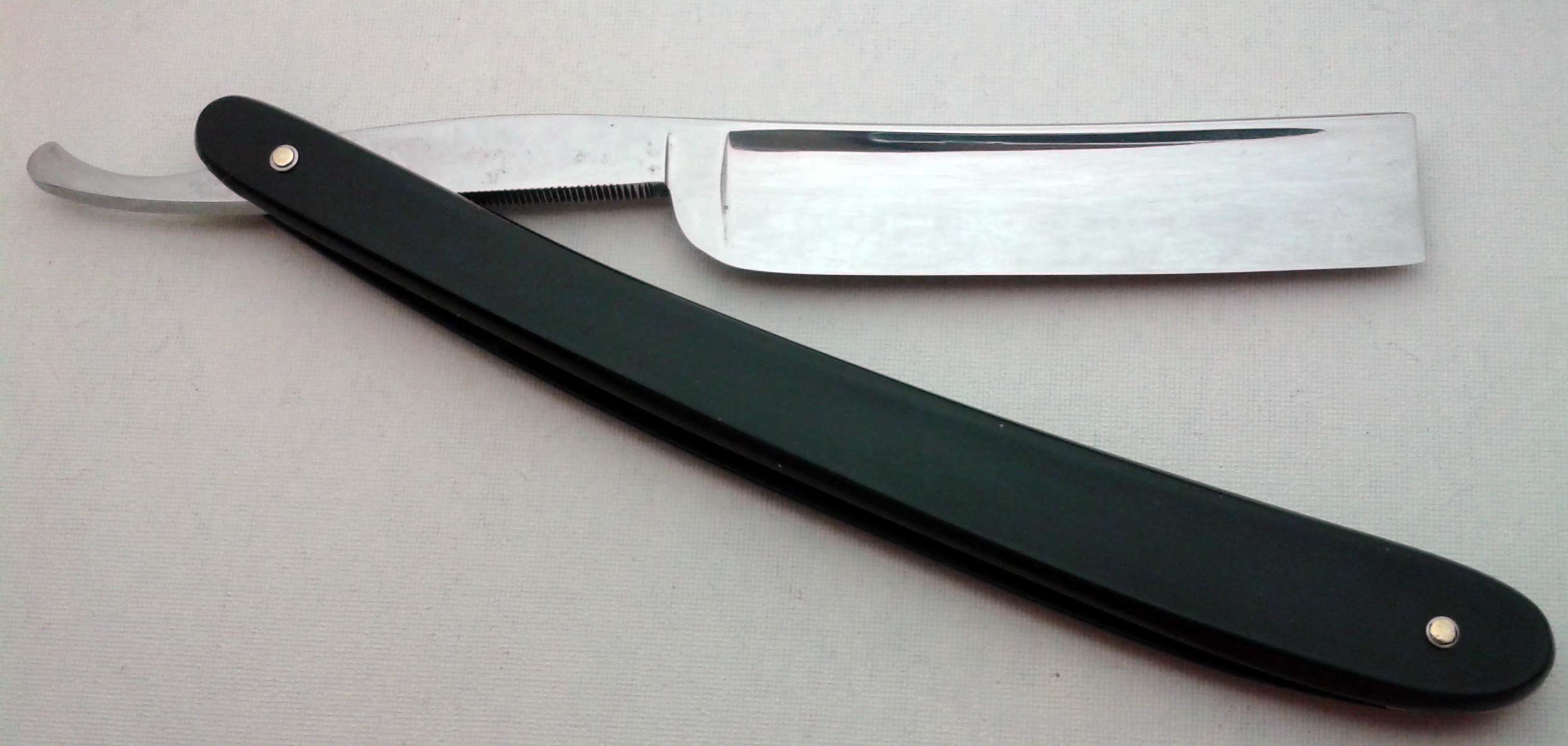 Видимо, бритва от интернациональной (Англия-Германия) фирмы типа KROPP. Ручка из целлулоида, в хорошем состоянии. На полотне имеются "следы времени". Возле обушка канавка неизвестного происхождения. Скорее всего - так называемый "заковыш", образовавшийся при изготовлении металлической заготовки. В любом случае, функциональность бритвы никак не затрагивает. Заточена и полностью готова к бритью. Ширина полотна 16 мм, толщина в обушке 4 мм.