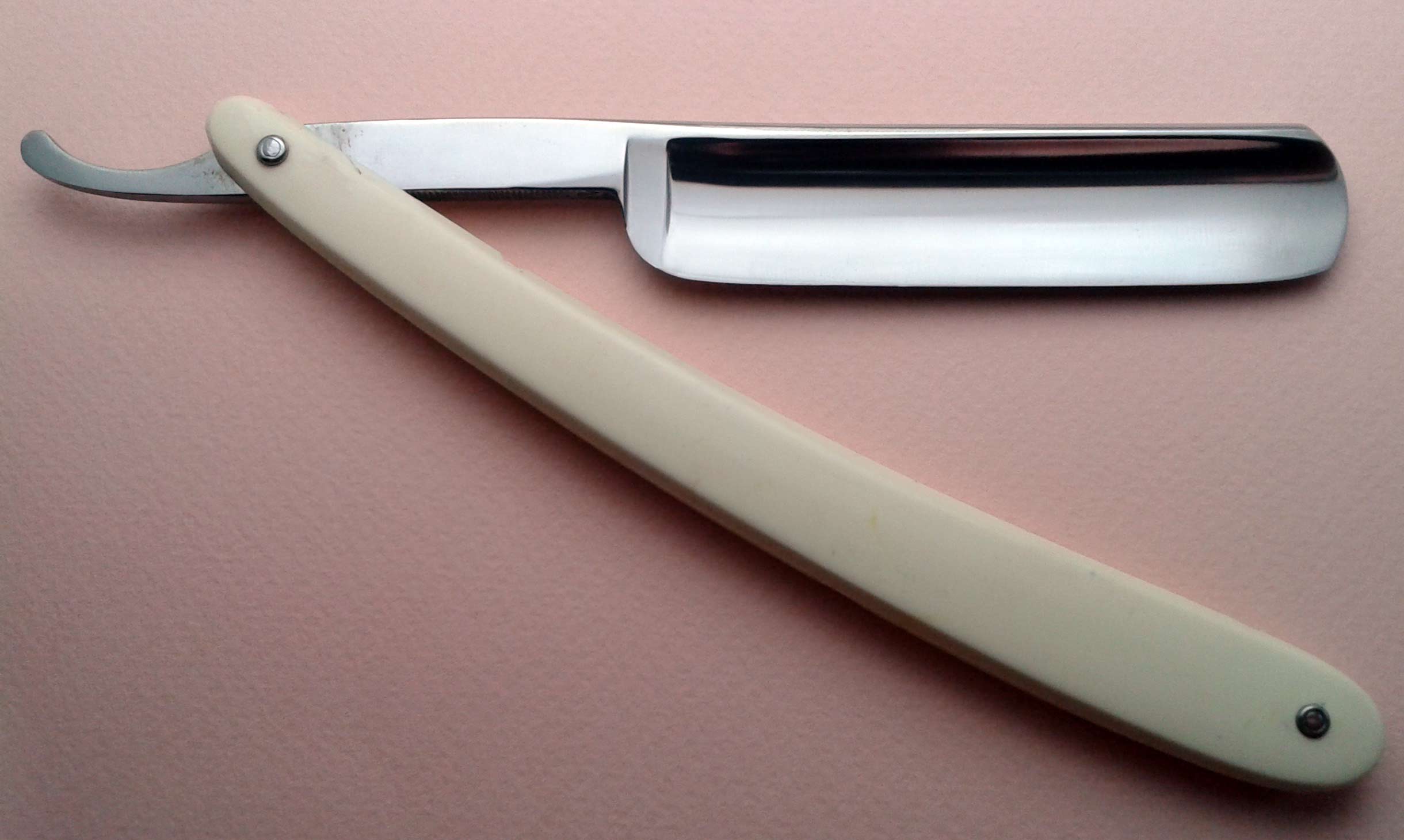Ручка - натуральная кость, в хорошем состоянии. Возле нижнего пина имеется продольная трещинка, но прочности не угрожает, дополнительно пролита цианакрилатом. Классический немецкий тяжелый холлоу граунд. Бритва прекрасно заточилась, очень комфортно бреет. Заточена и полностью готова к бритью. Ширина полотна 19.5 мм, толщина в обушке 5 мм.